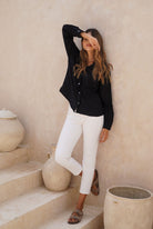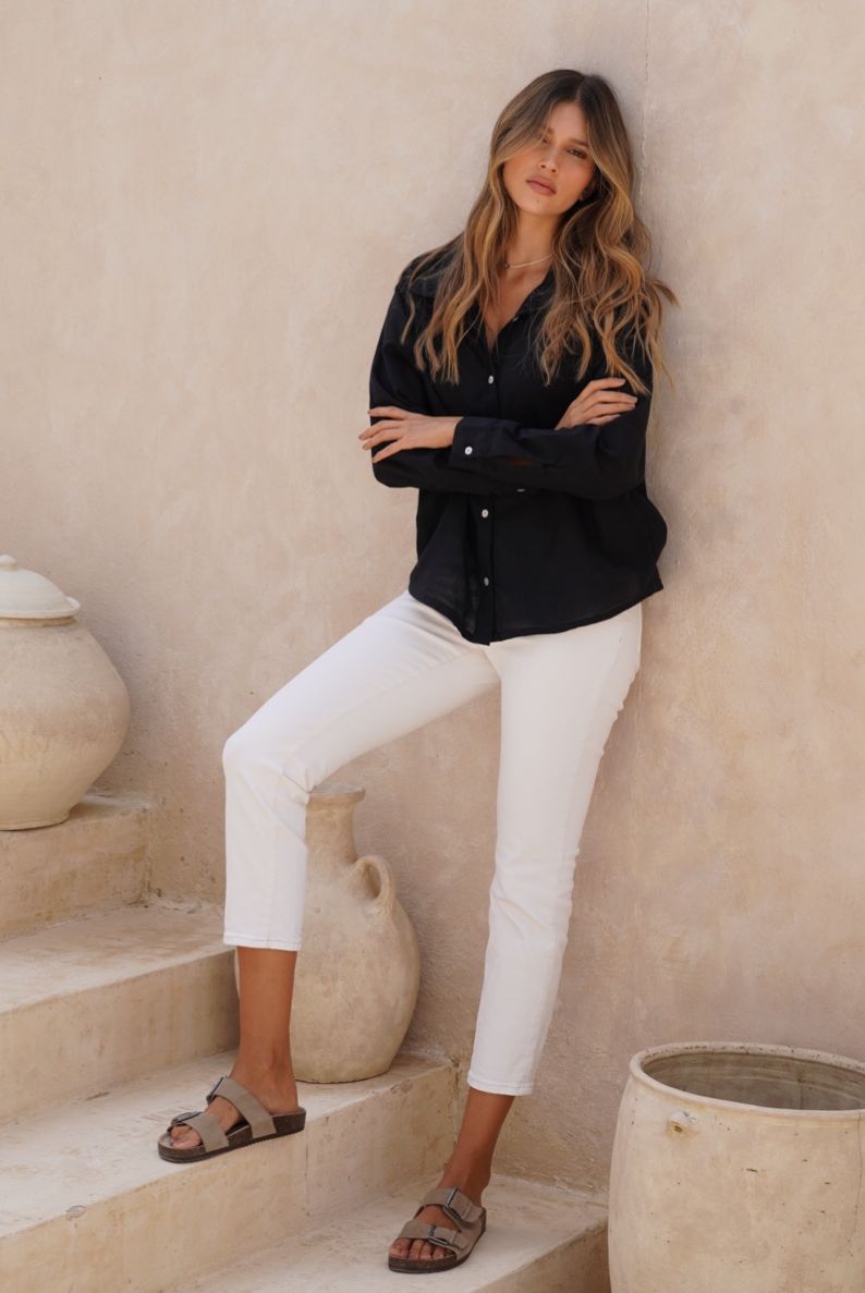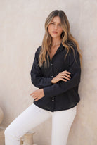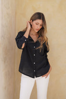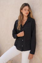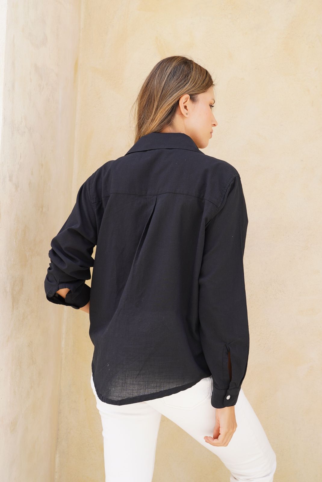 Camisa negra básica en tela Algodón 100%, manga larga, botones funcionales, perfecta para un look fresco y femenino.