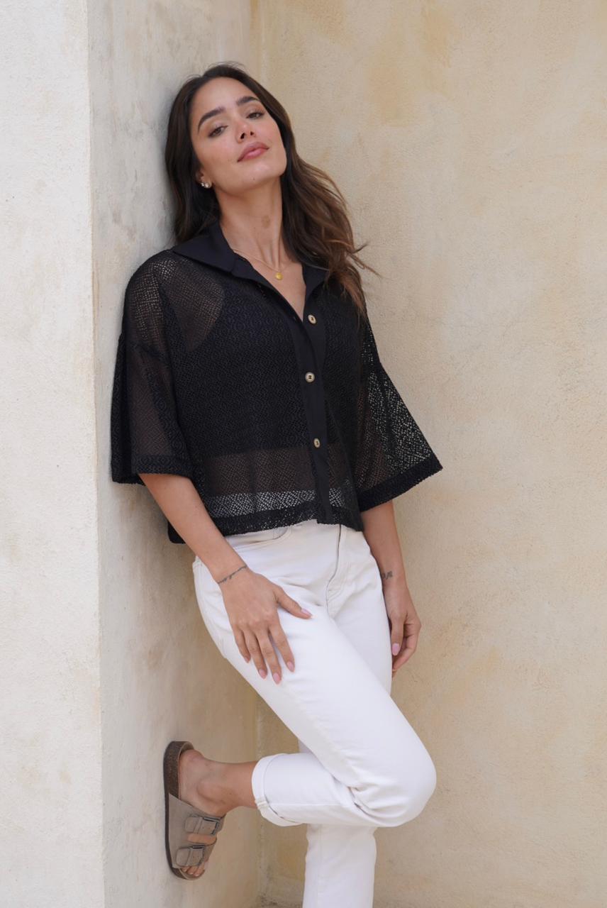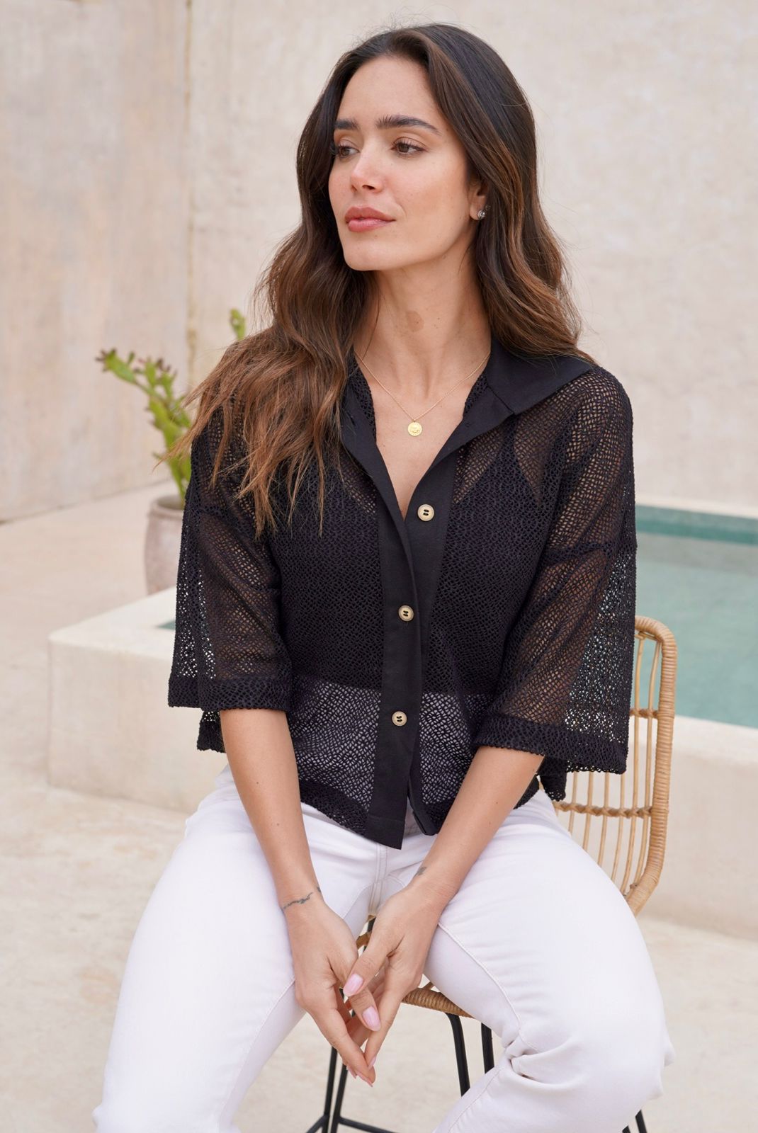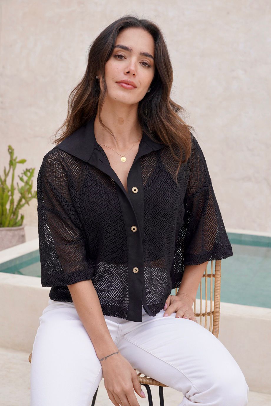 Camisa negra silueta amplia en tela poliéster tipo maya, diseño minimalista con botones funcionales. No incluye top interno