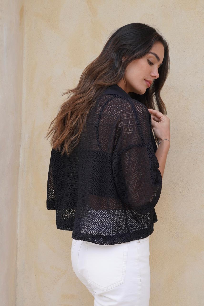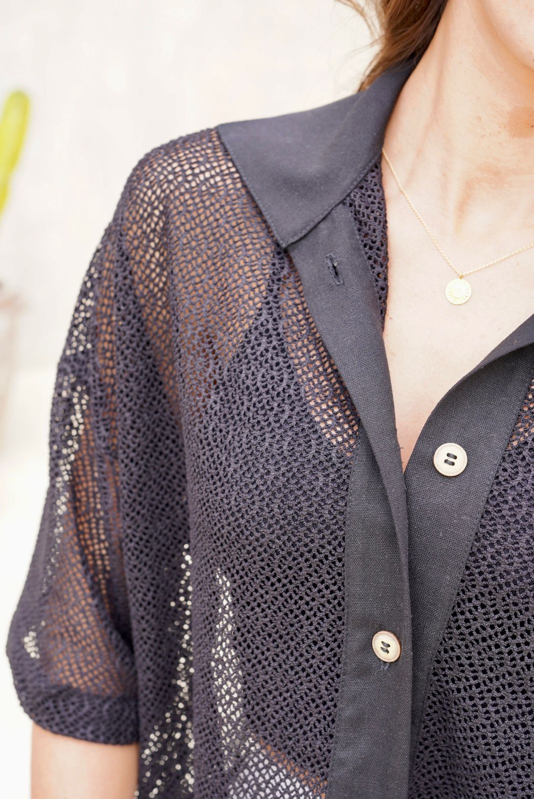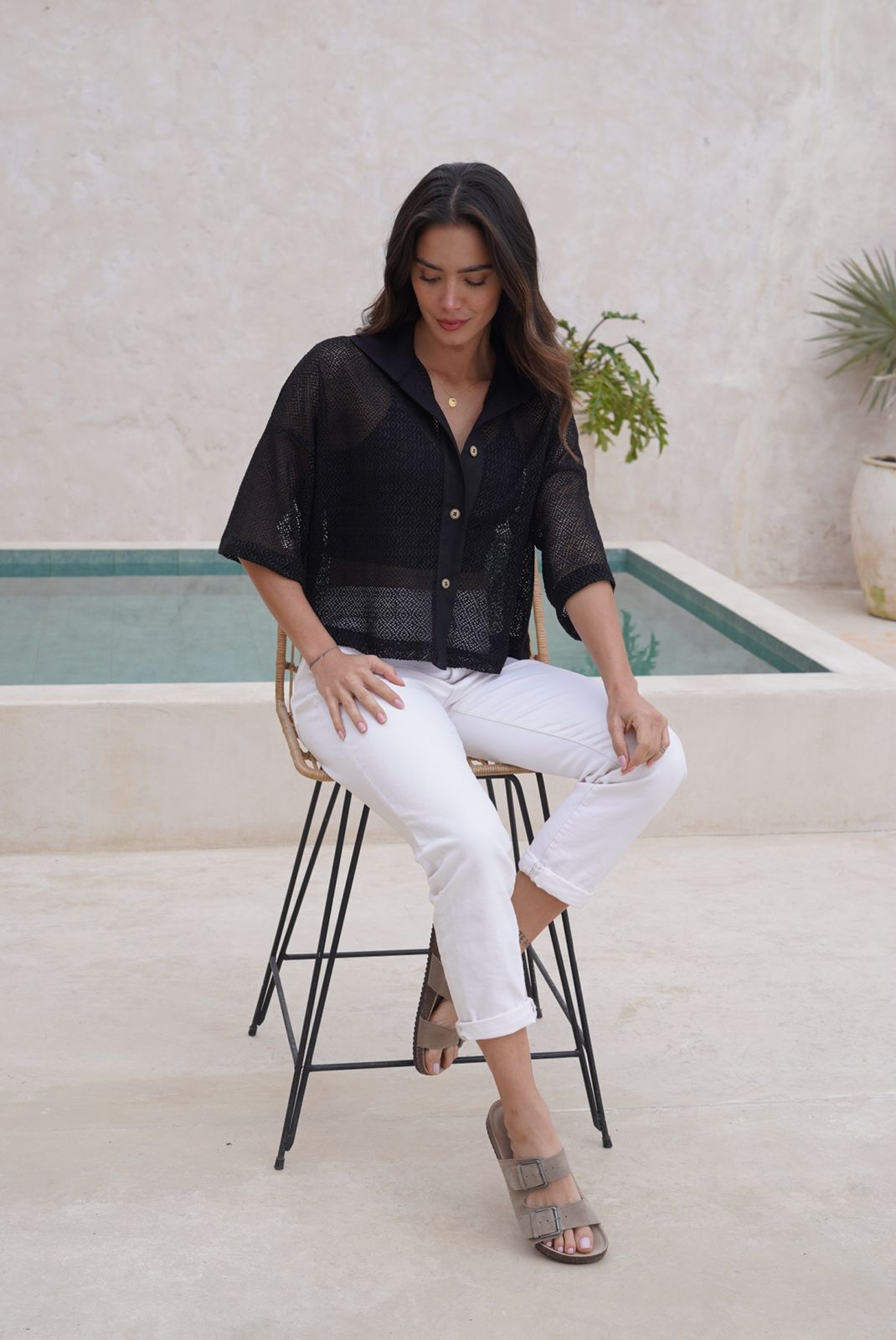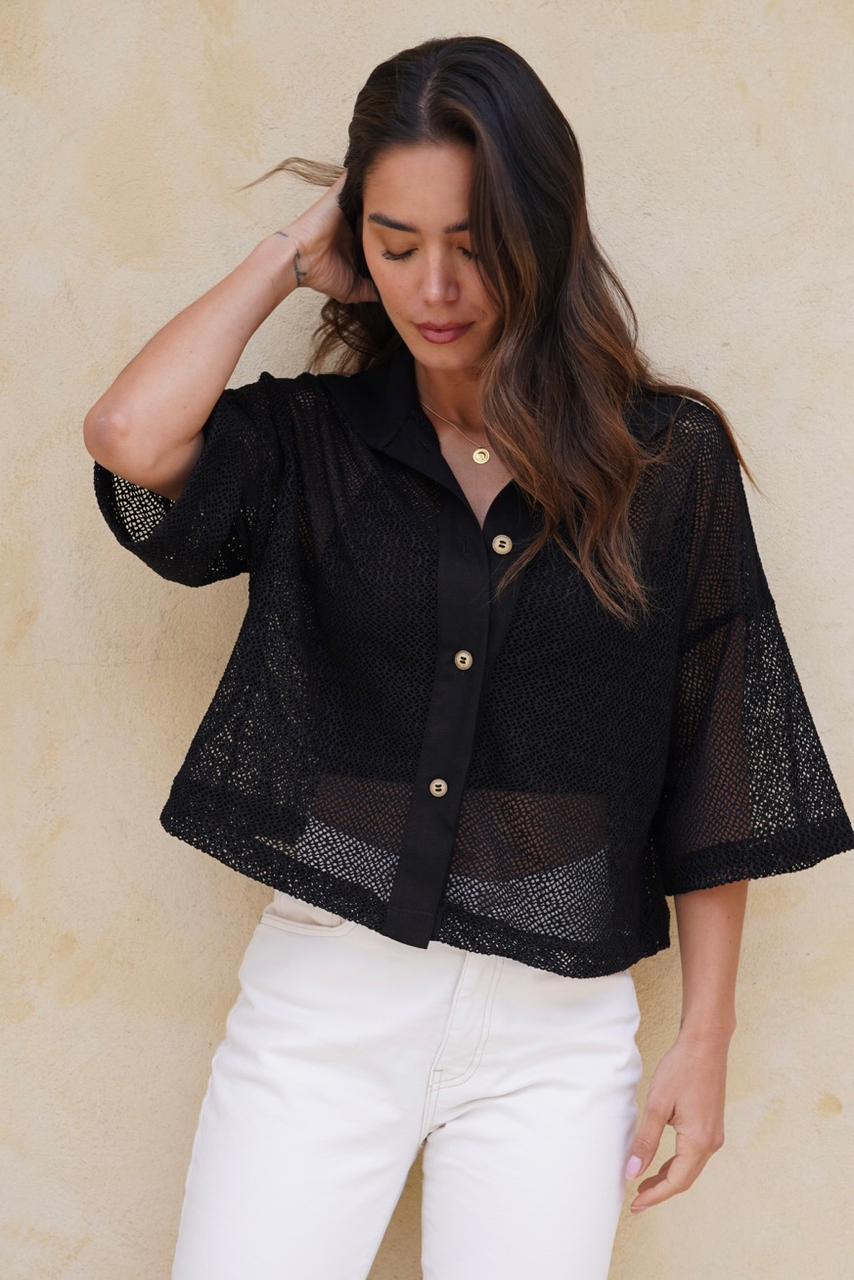 Camisa negra silueta amplia en tela poliéster tipo maya, diseño minimalista con botones funcionales. No incluye top interno