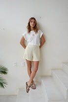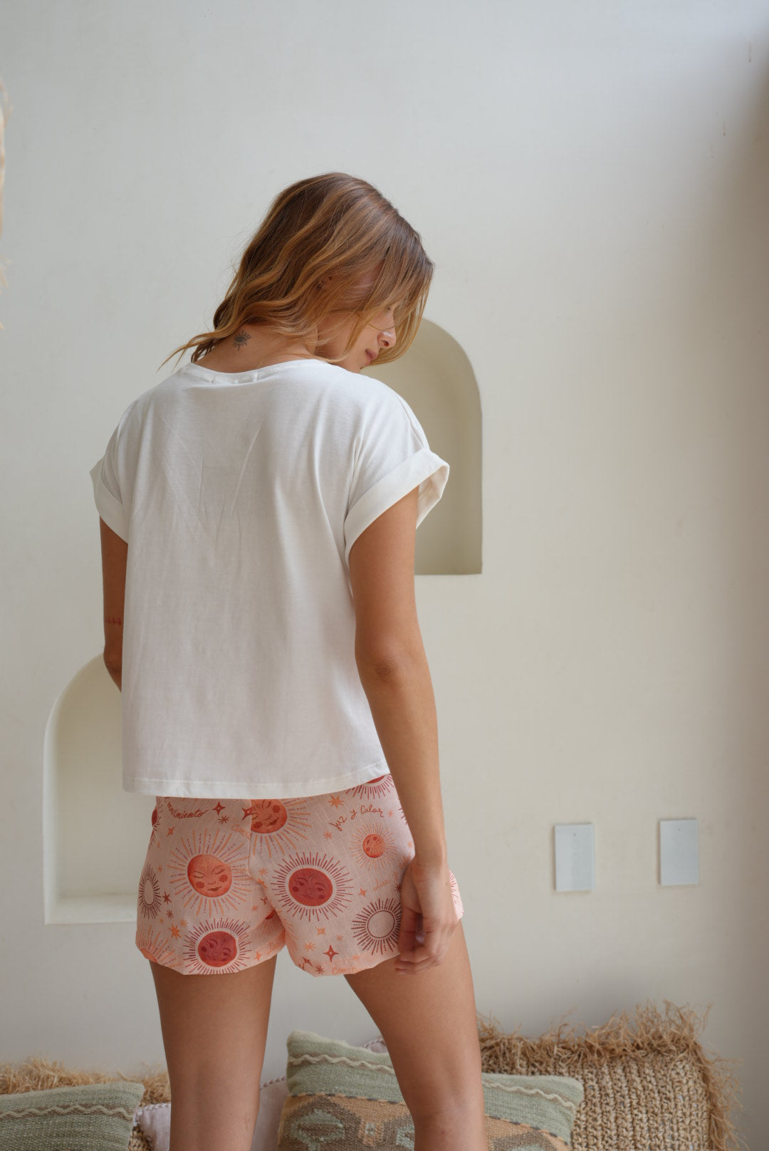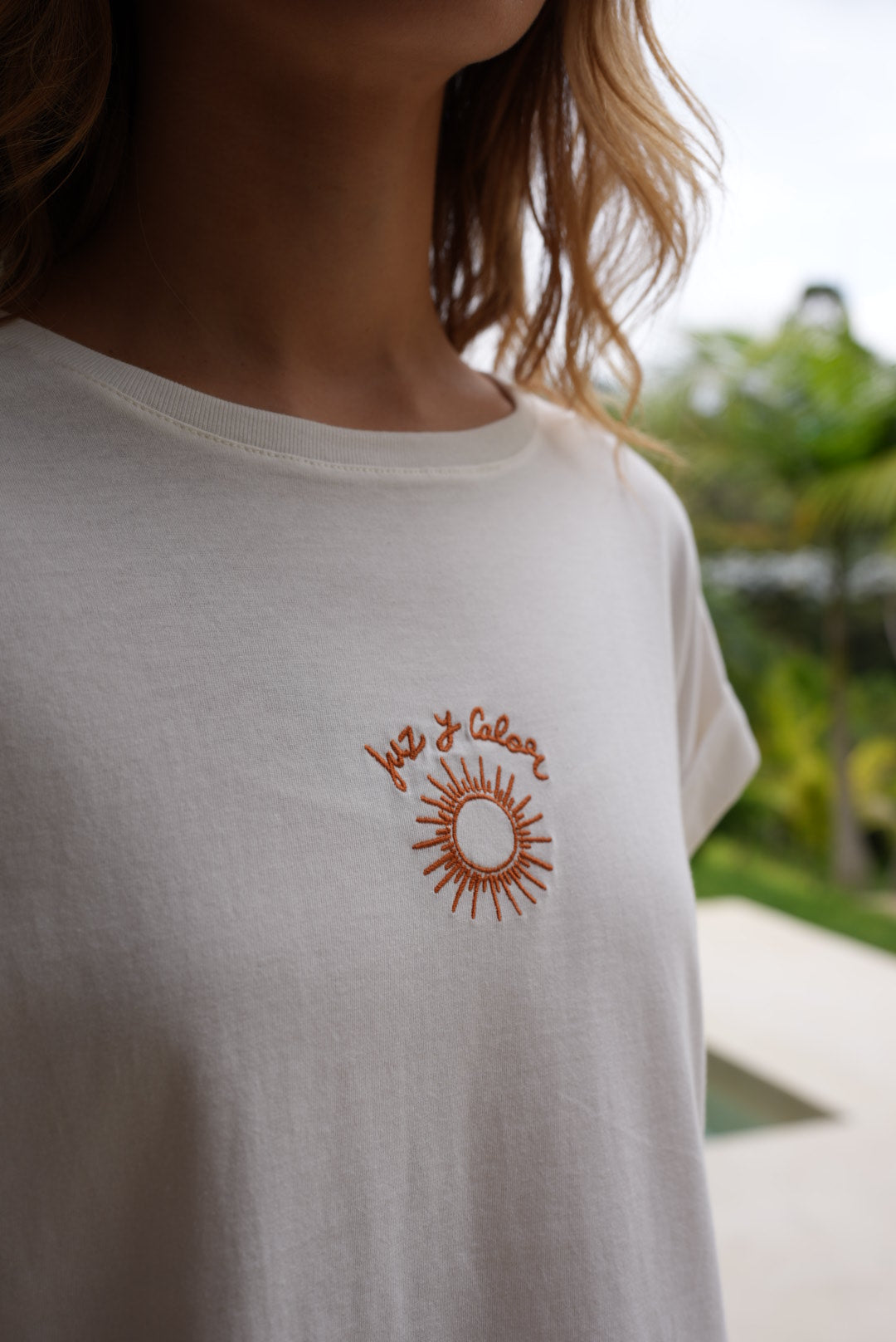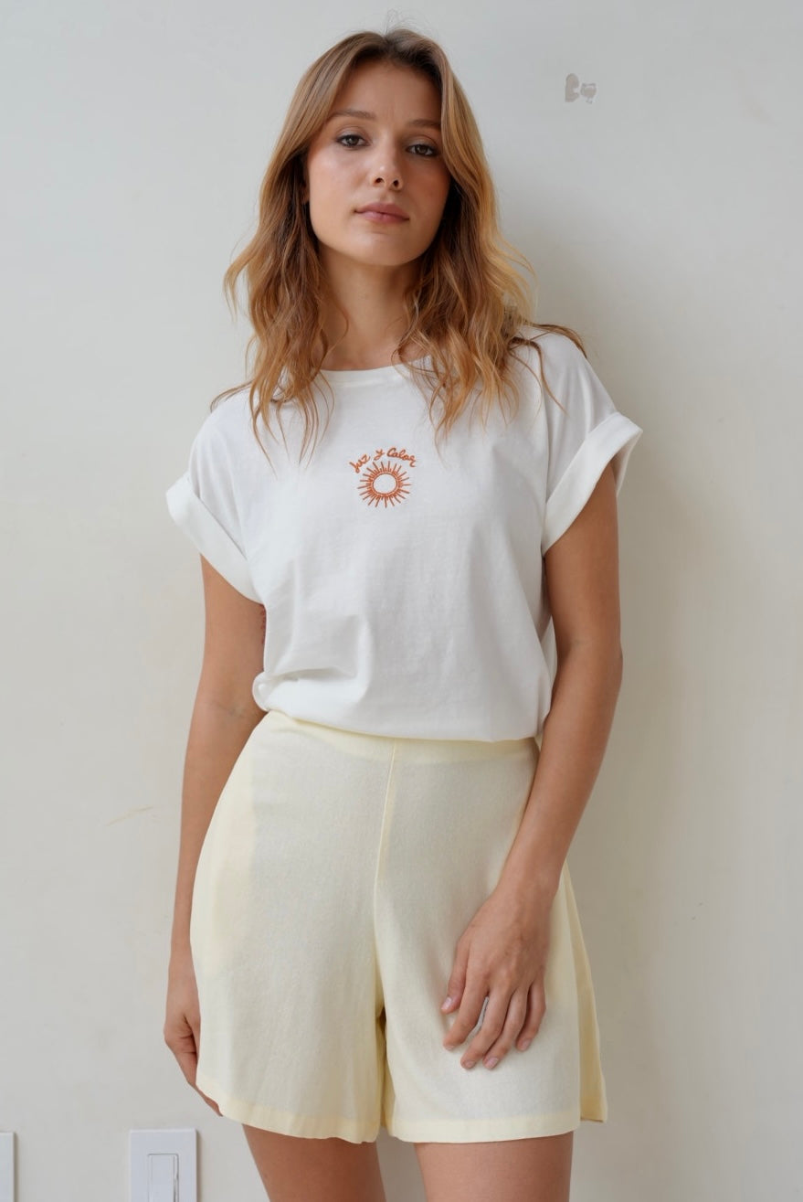 Camiseta crema con bordado de sol, básica manga corta en tela Algodón y cuello redondo en rib, fresca y cómoda.