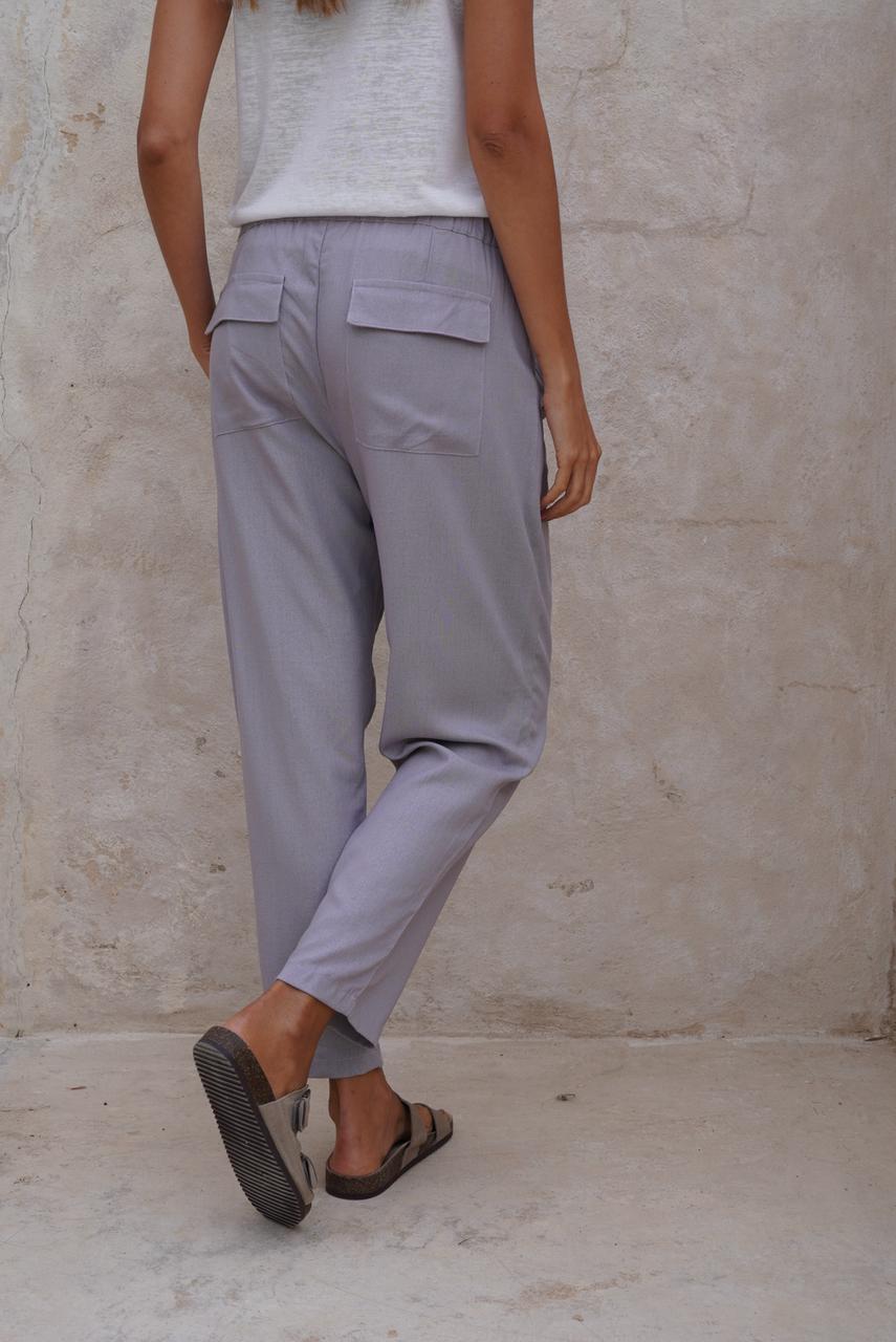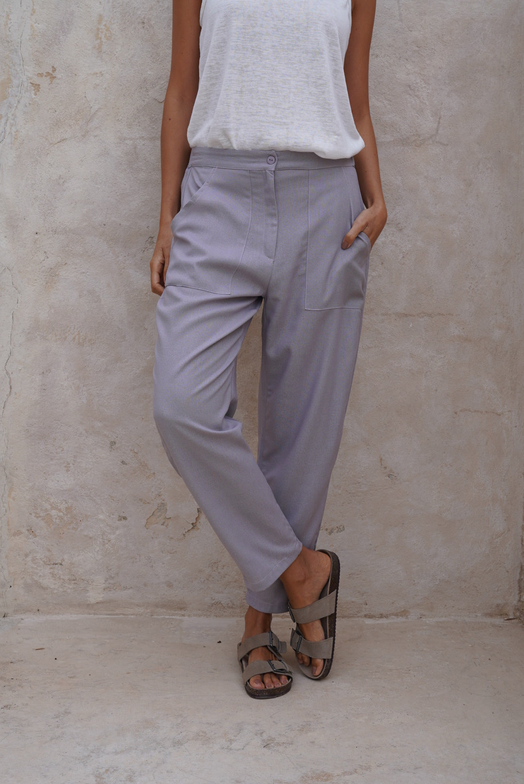 Pantalón lila tela lino rayón , con bolsillos, cierre y cómodo elástico en cintura.