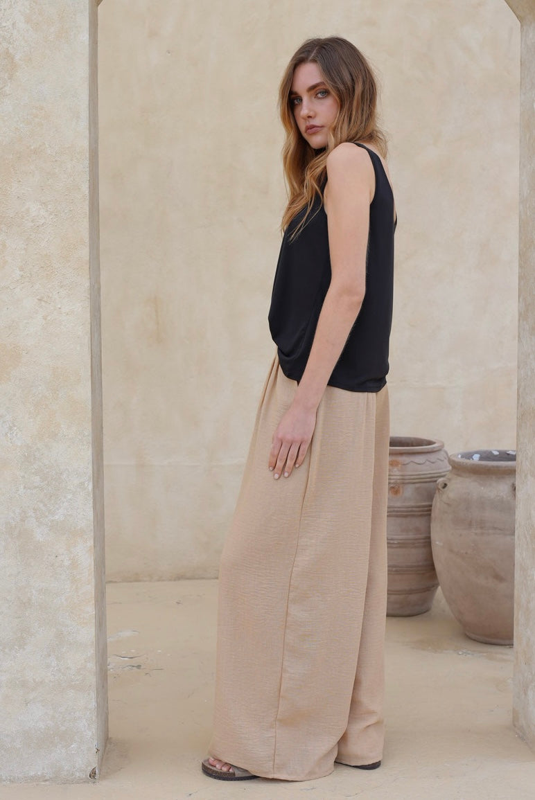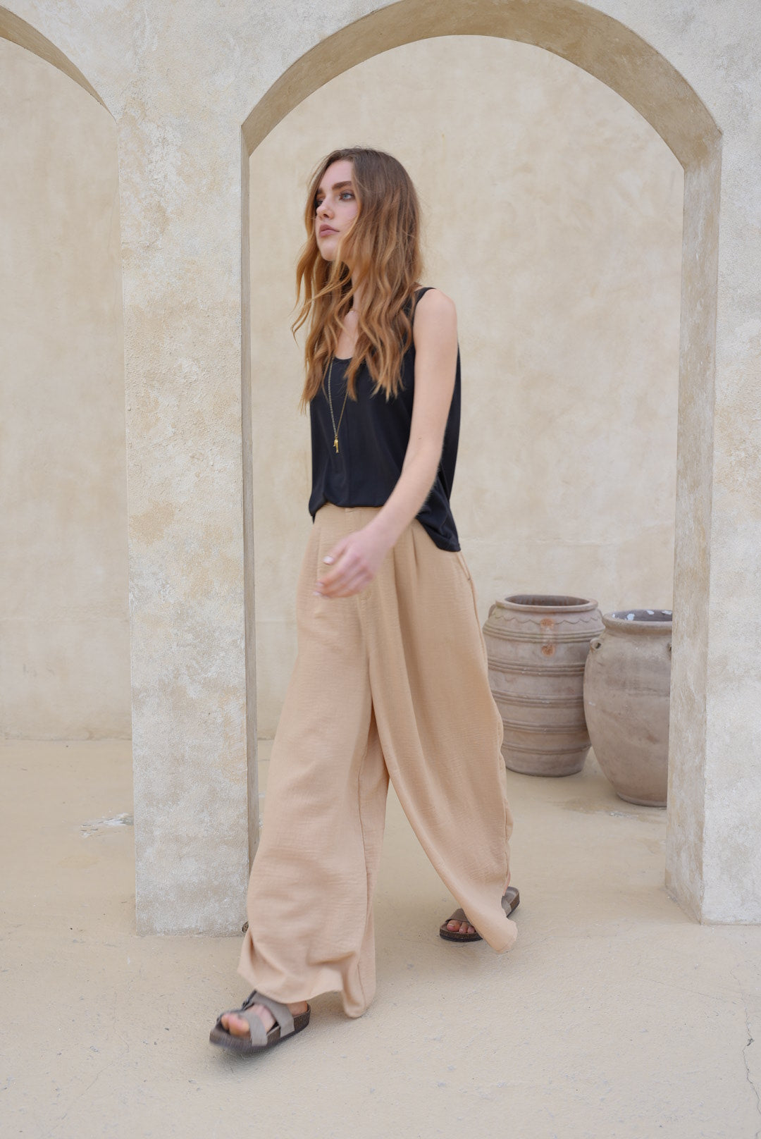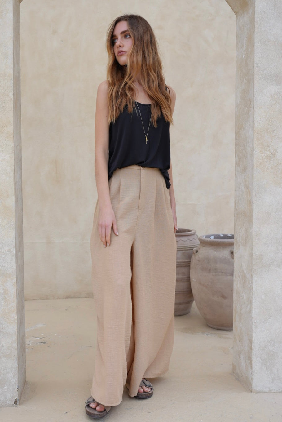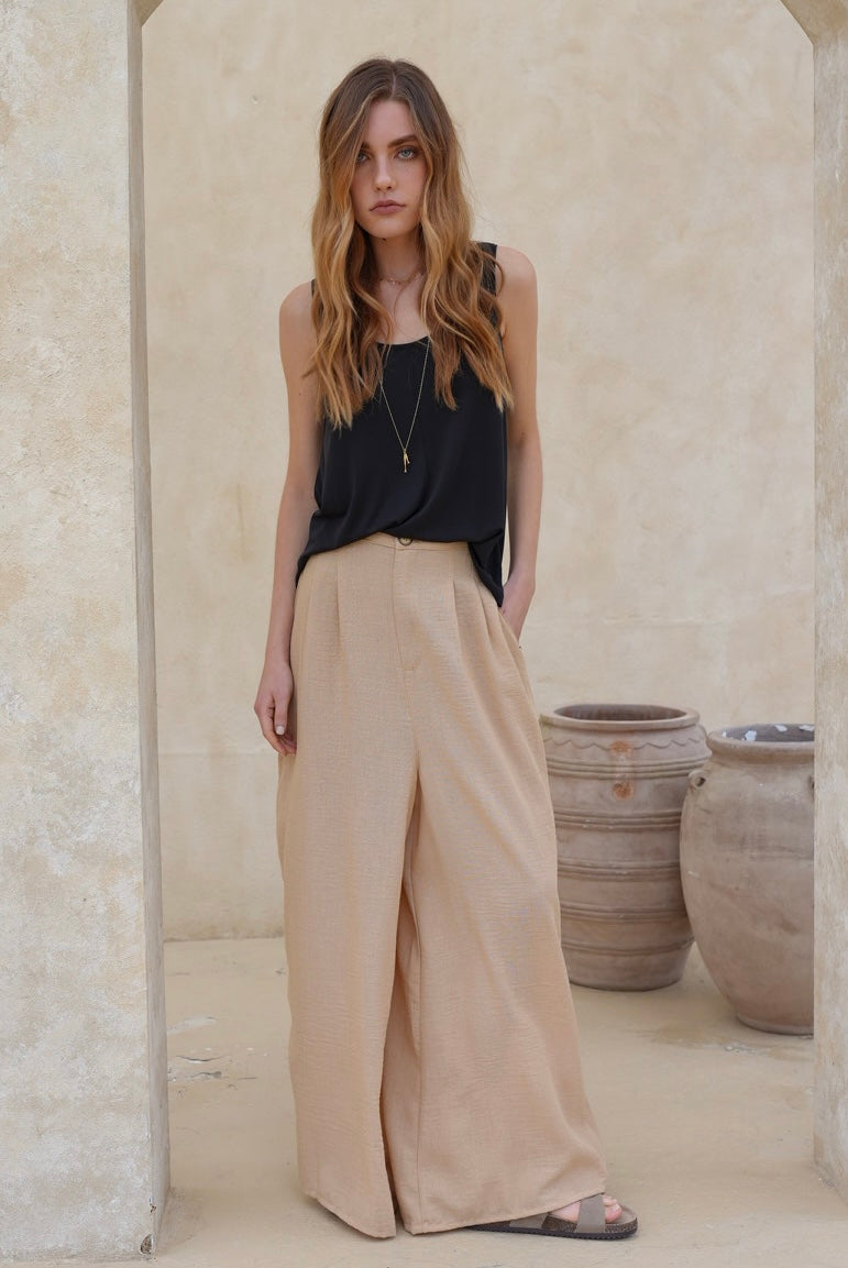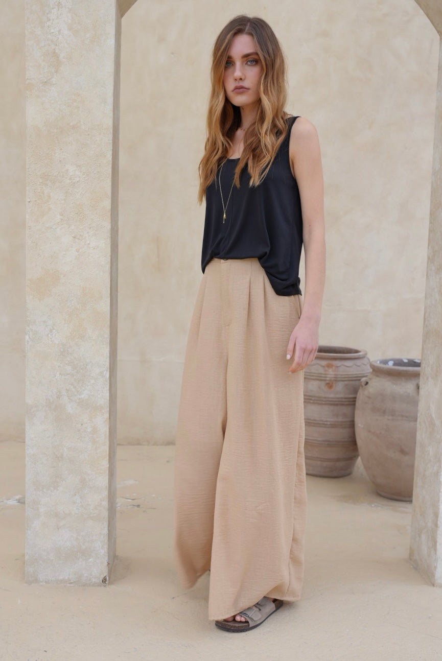 Pantalón camel, en tela rayón, tiro alto, botones, bota ancha, cierre y bolsillos lo hacen una prenda infaltable en el armario.