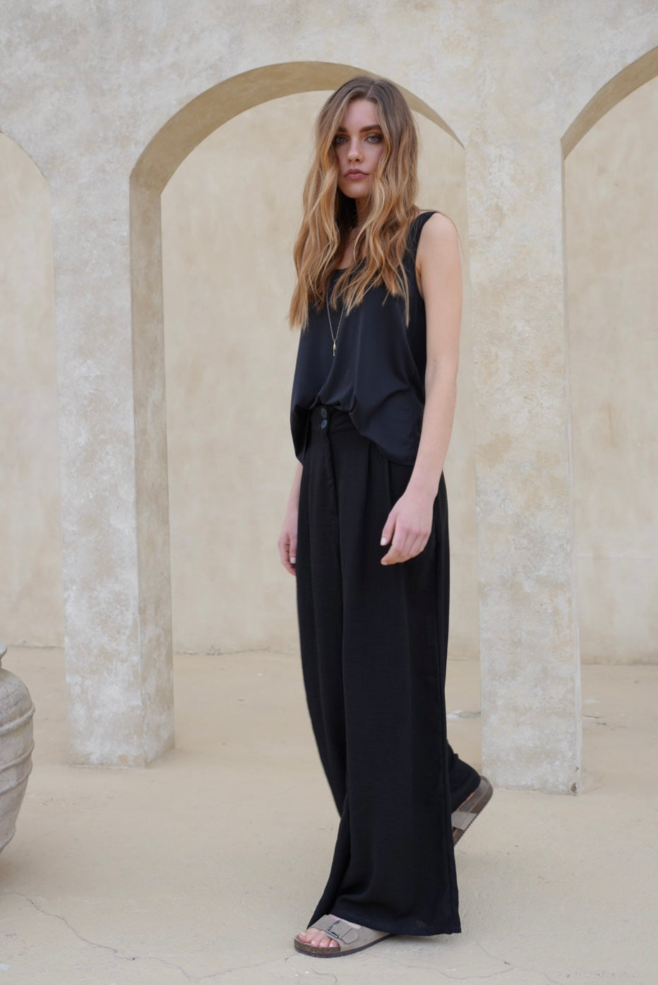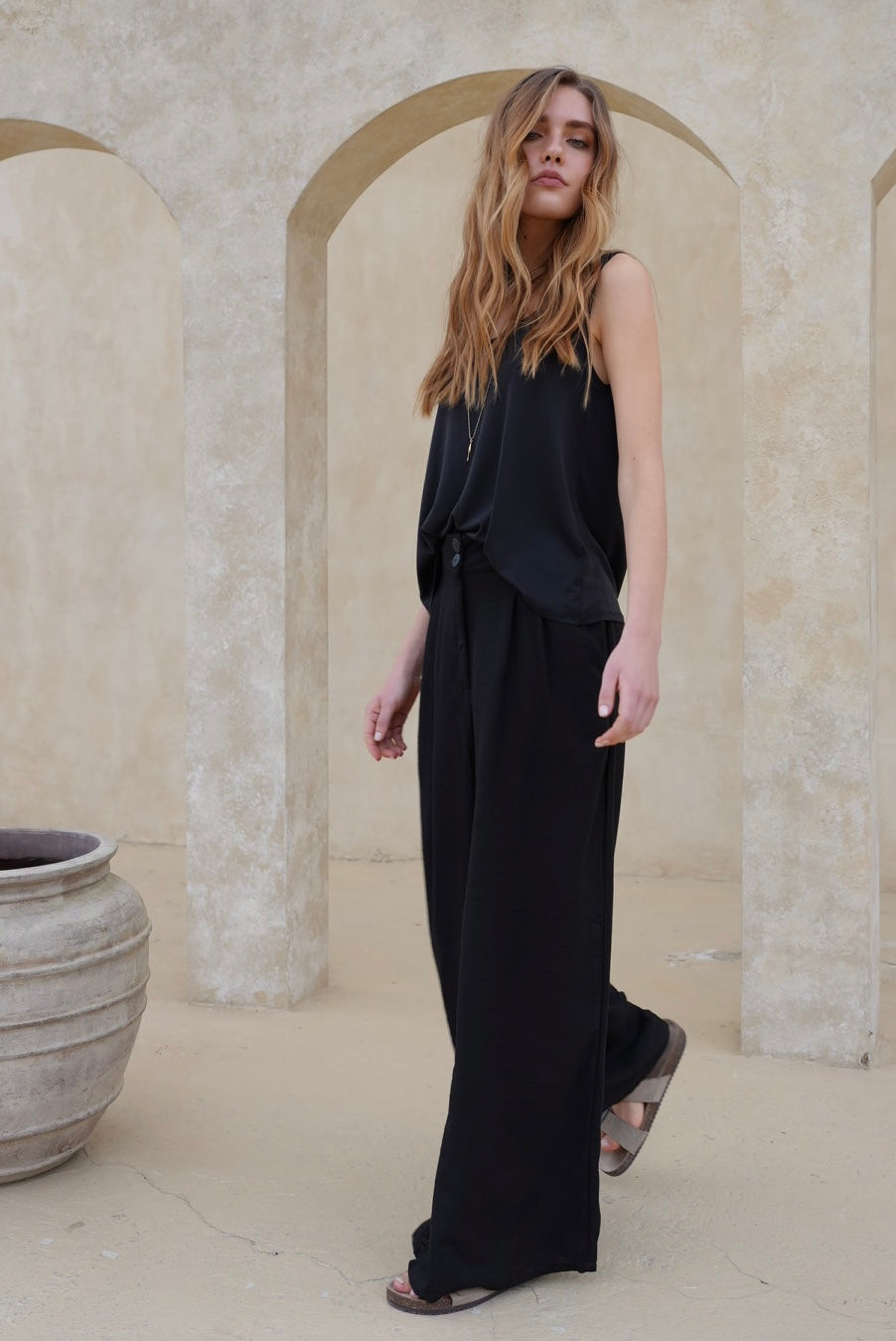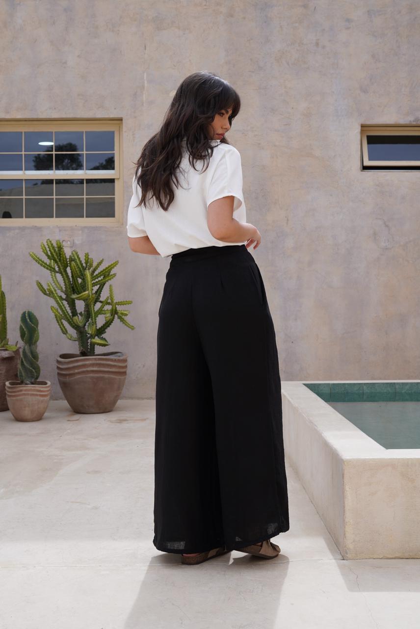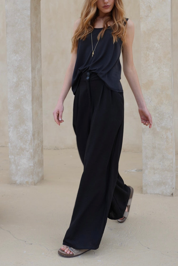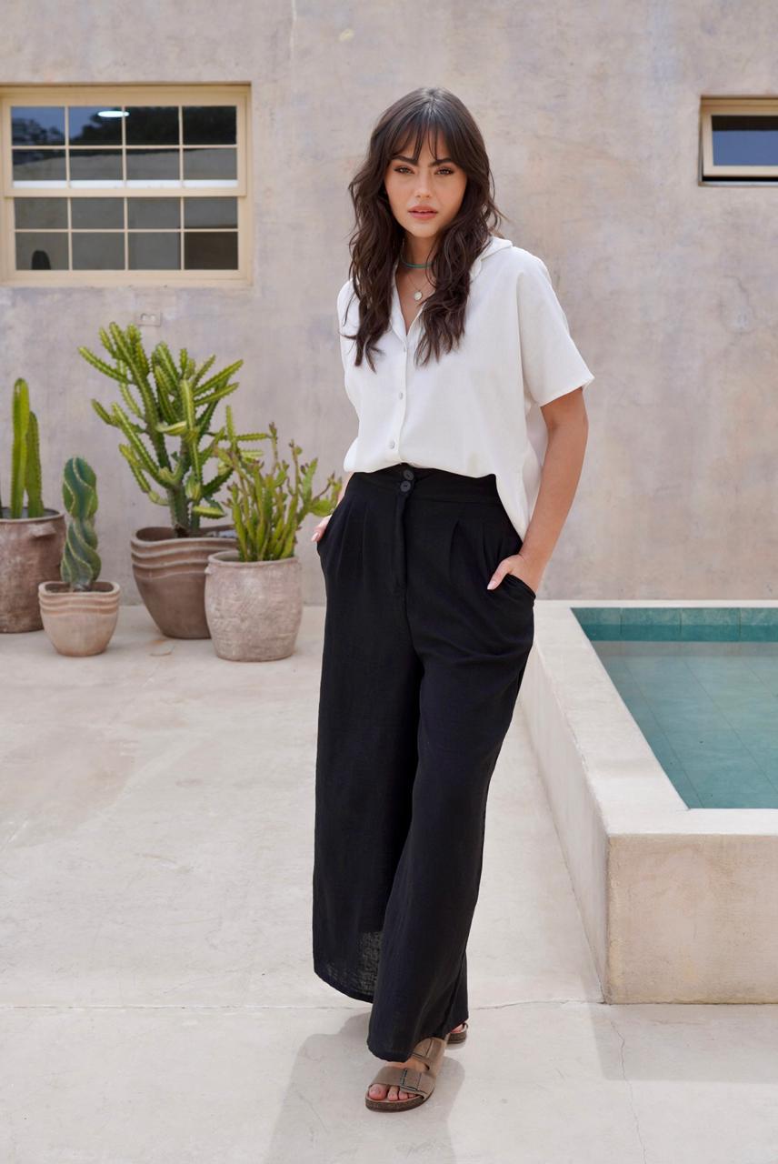 Pantalón negro, en tela rayón, tiro alto, botones, bota ancha, cierre y bolsillos lo hacen una prenda infaltable en el armario.