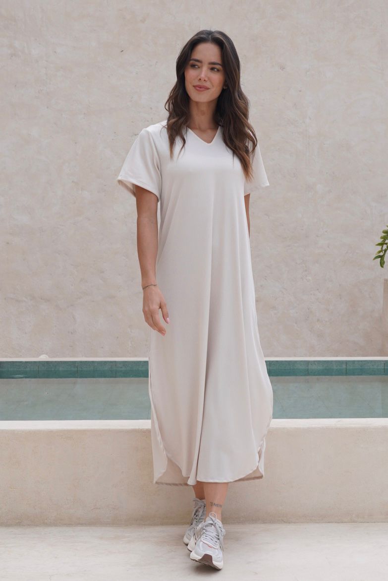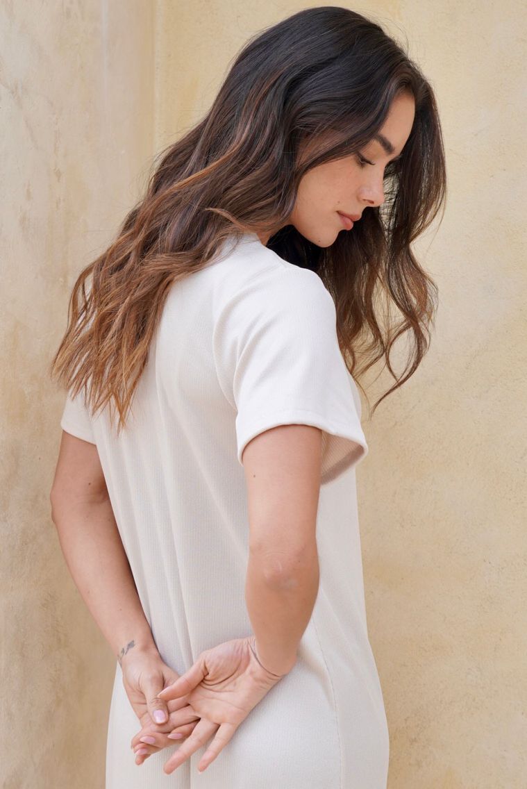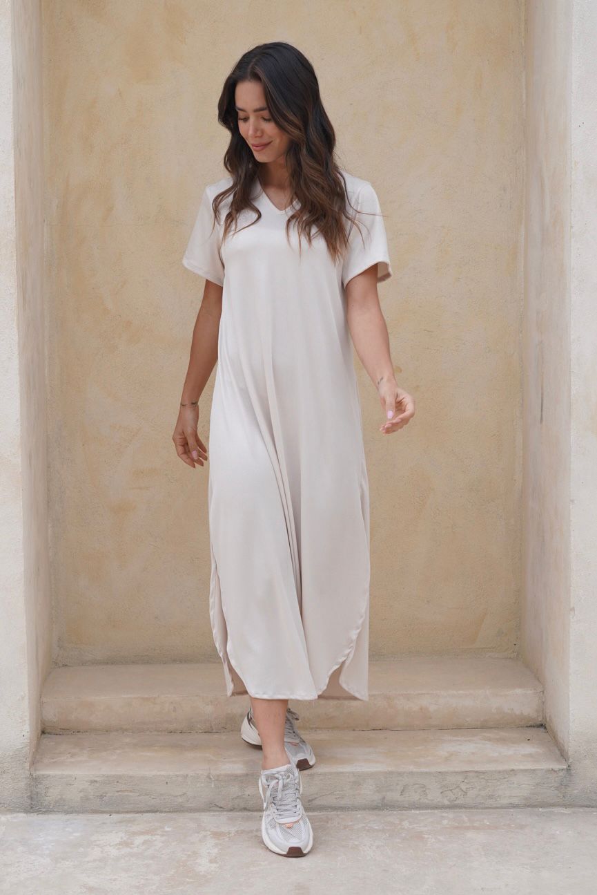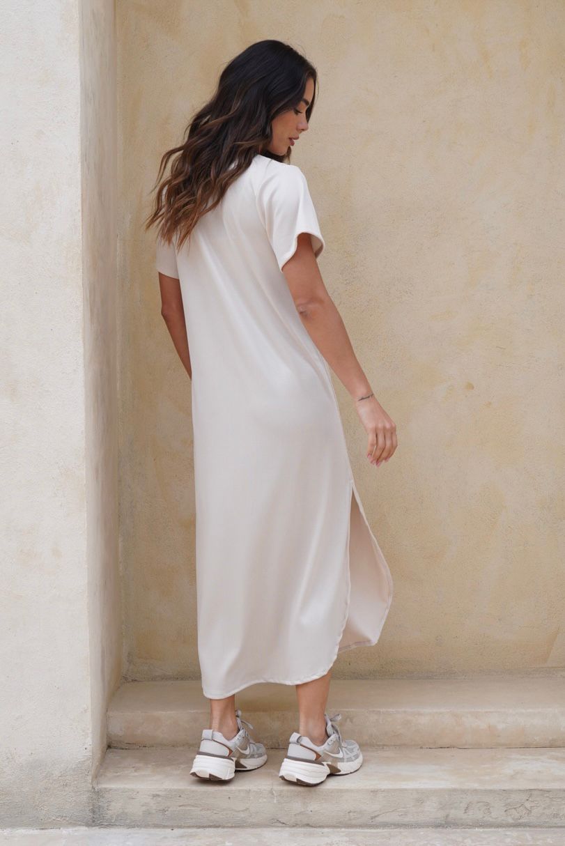 Vestido crema básico manga corta en tela poliéster con sutiles brillos, silueta cómoda con abertura al costado de la falda.