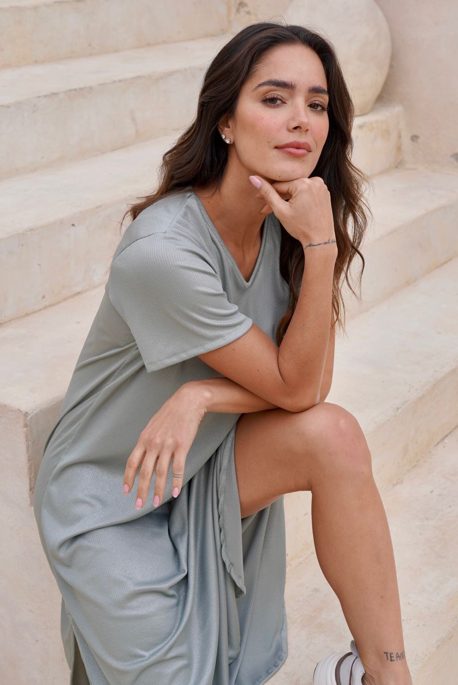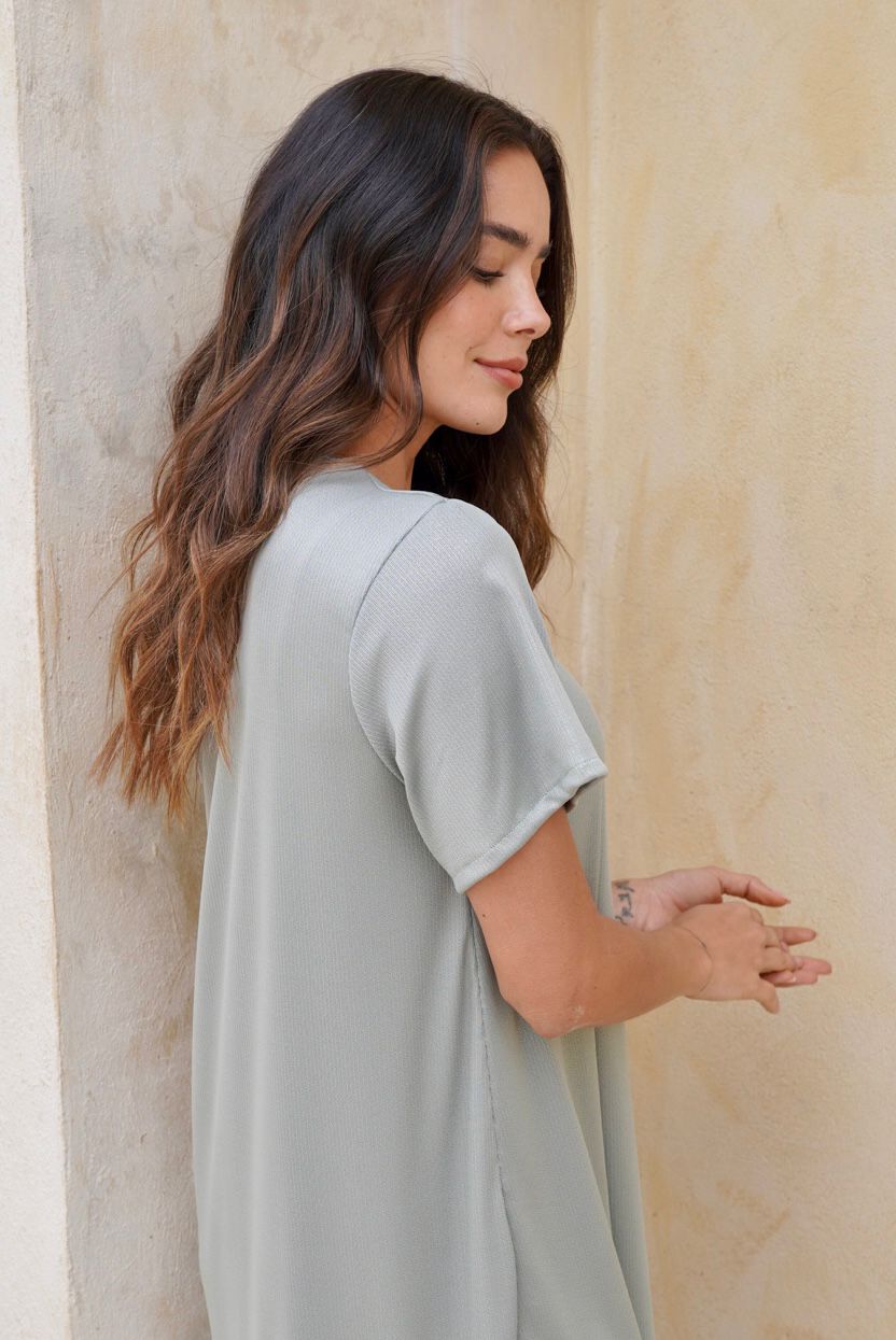 Vestido verde básico manga corta en tela poliéster con sutiles brillos, silueta cómoda con abertura al costado de la falda.