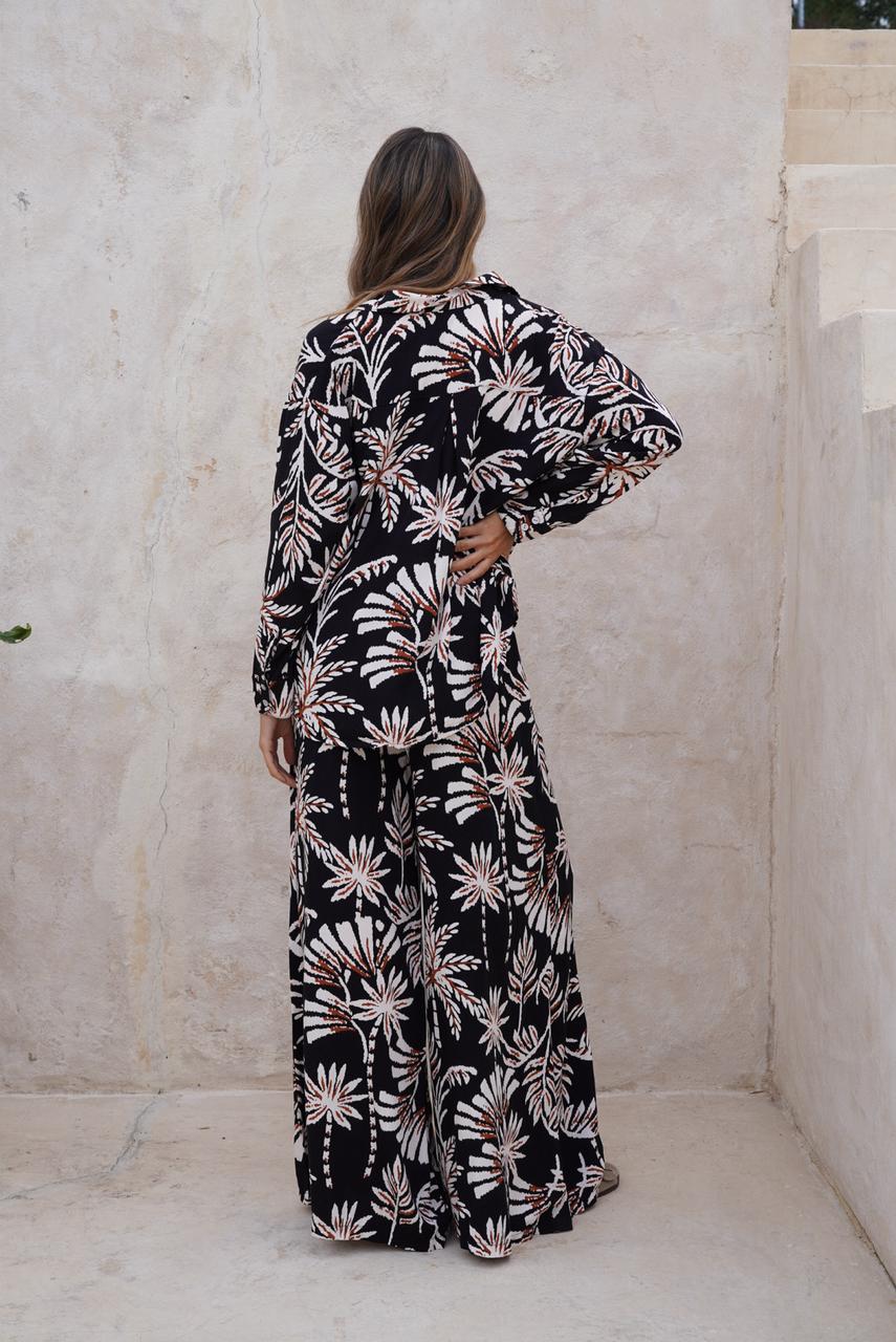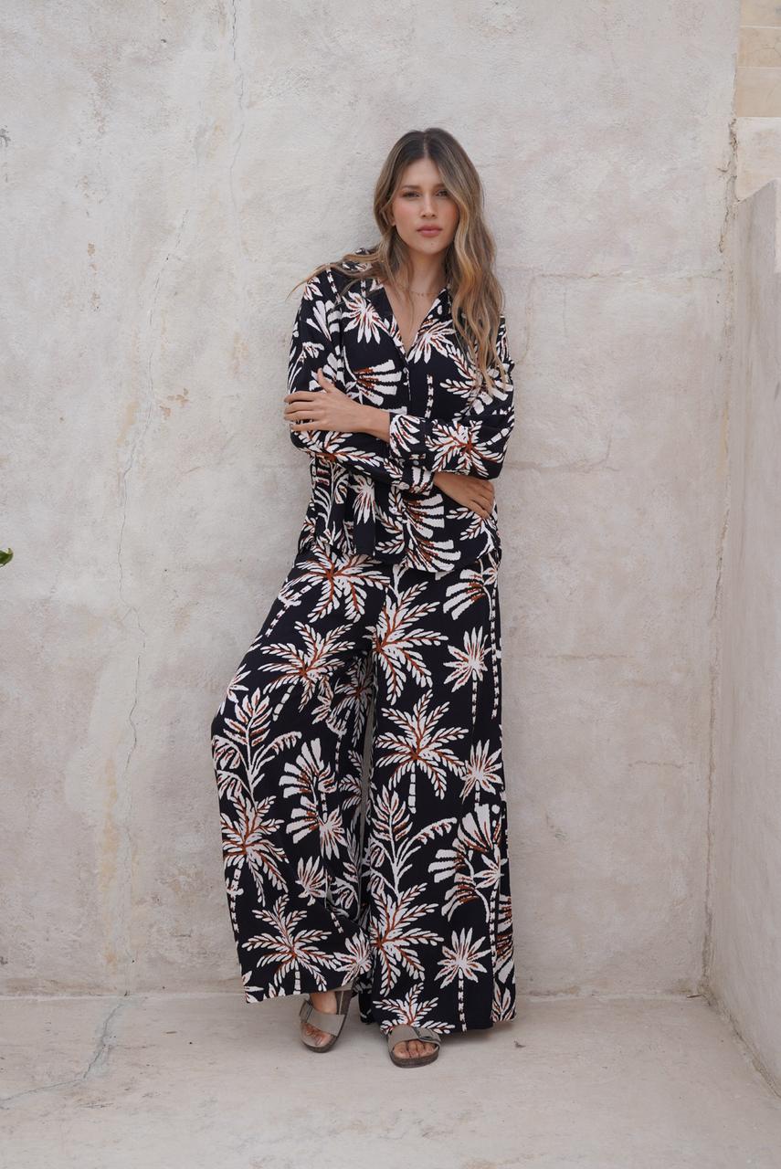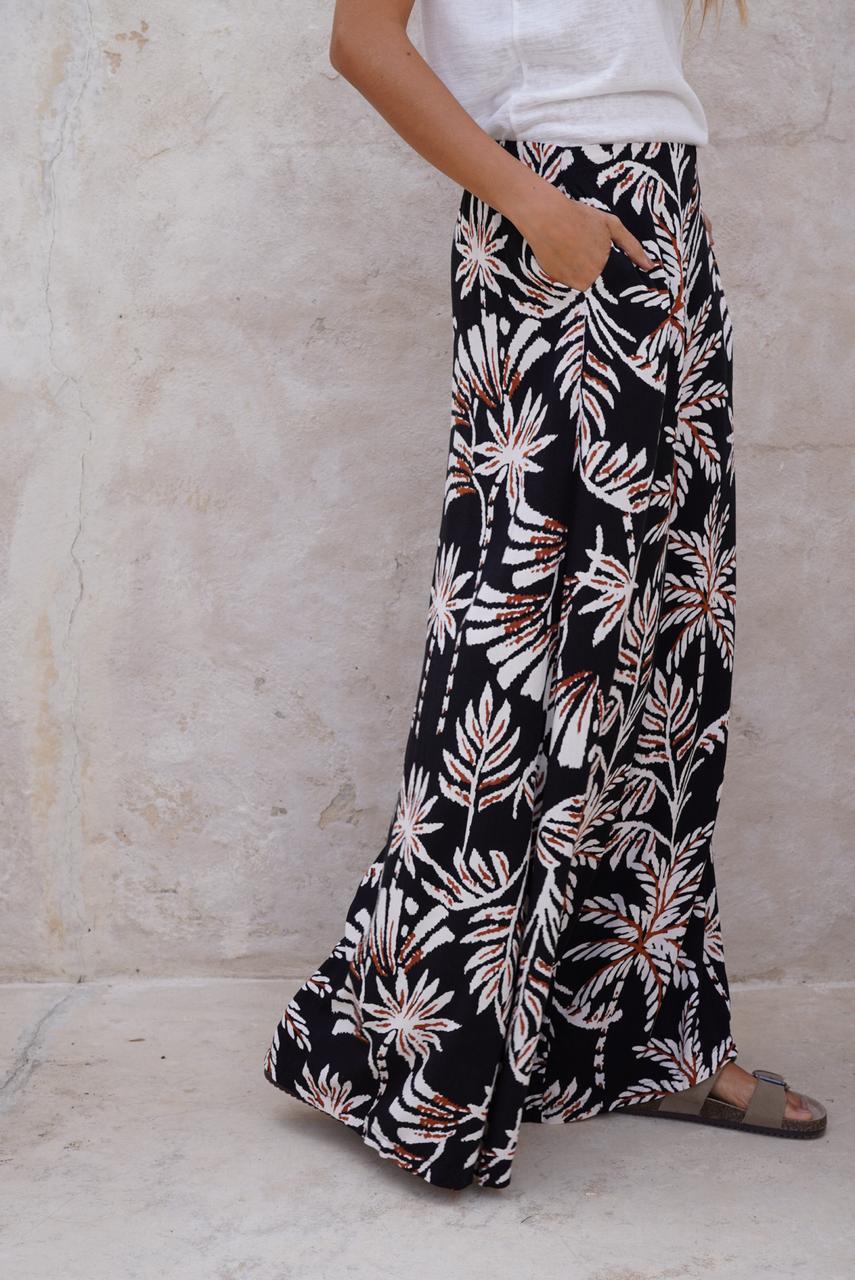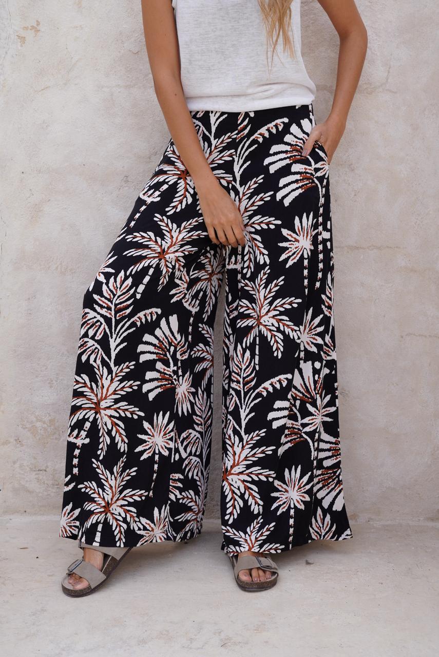 Pantalón Negro con estampado de palmas, de pierna ancha, tiro alto, elástico y bolsillos, en tela rayón ligera y fluida aporta movimiento y comodidad.