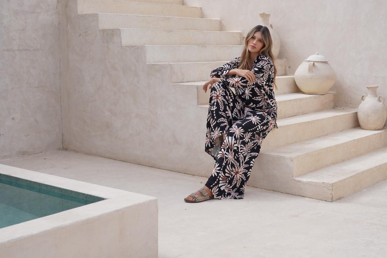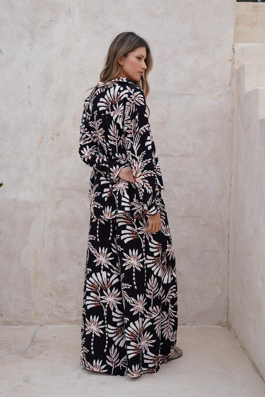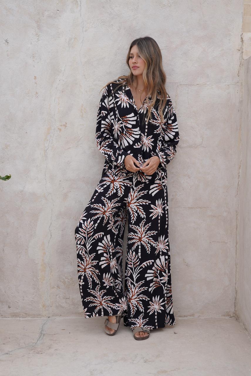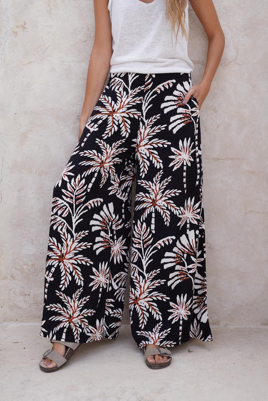 Pantalón Negro con estampado de palmas, de pierna ancha, tiro alto, elástico y bolsillos, en tela rayón ligera y fluida aporta movimiento y comodidad.