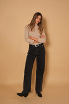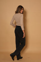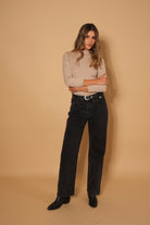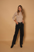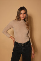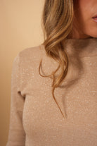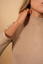 Buzo básico color taupe con sutil brillo, de manga tres cuartos y cuello ligeramente alto