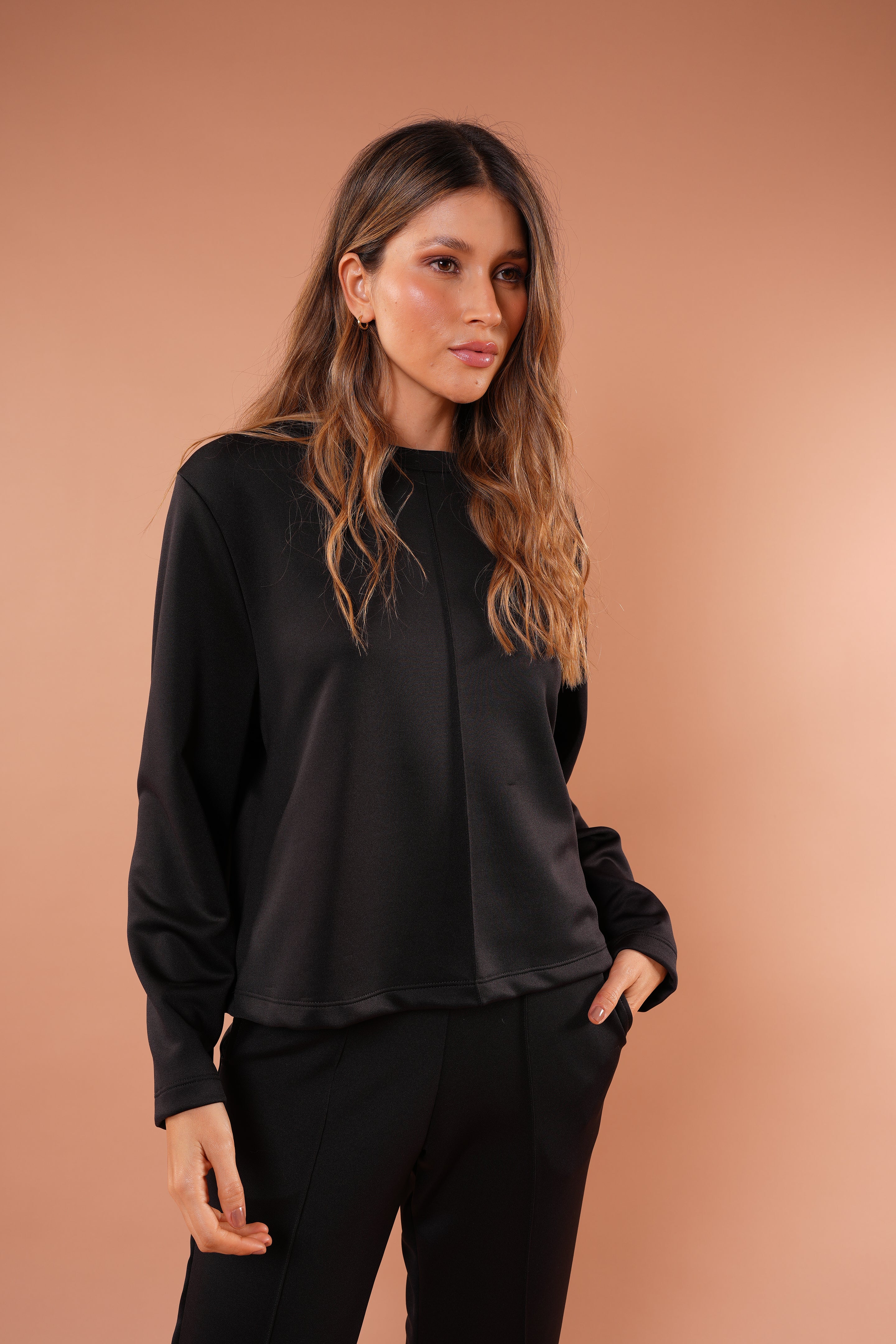 Prenda esencial elevada a otro nivel. Este buzo negro de silueta relajada combina minimalismo y sofisticación en una pieza atemporal que funciona para cualquier momento del día.