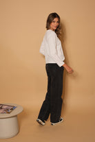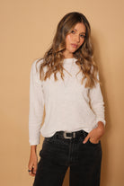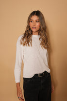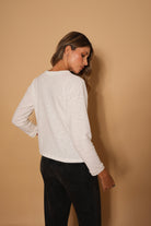 Buzo blanco de cuello redondo, en  tela tejido punto liviano acanalada, de estilo casual y cómodo.