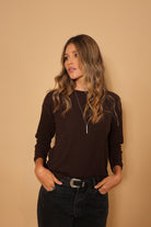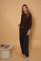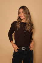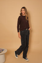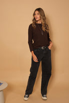 Buzo cafe  de cuello redondo, en  tela tejido punto liviano acanalada, de estilo casual y cómodo.