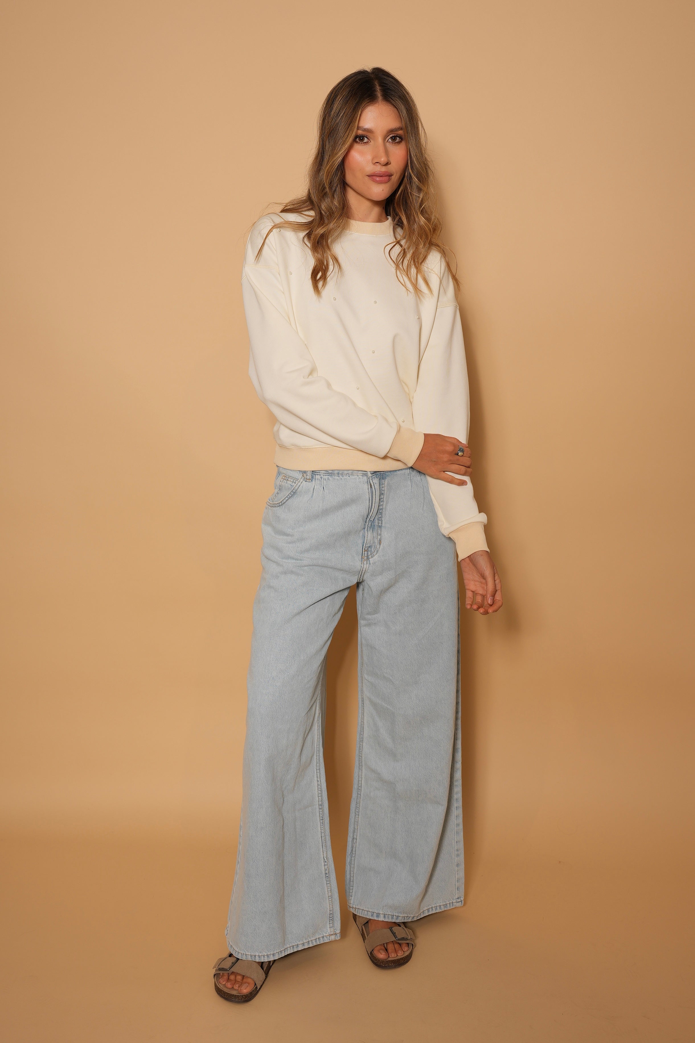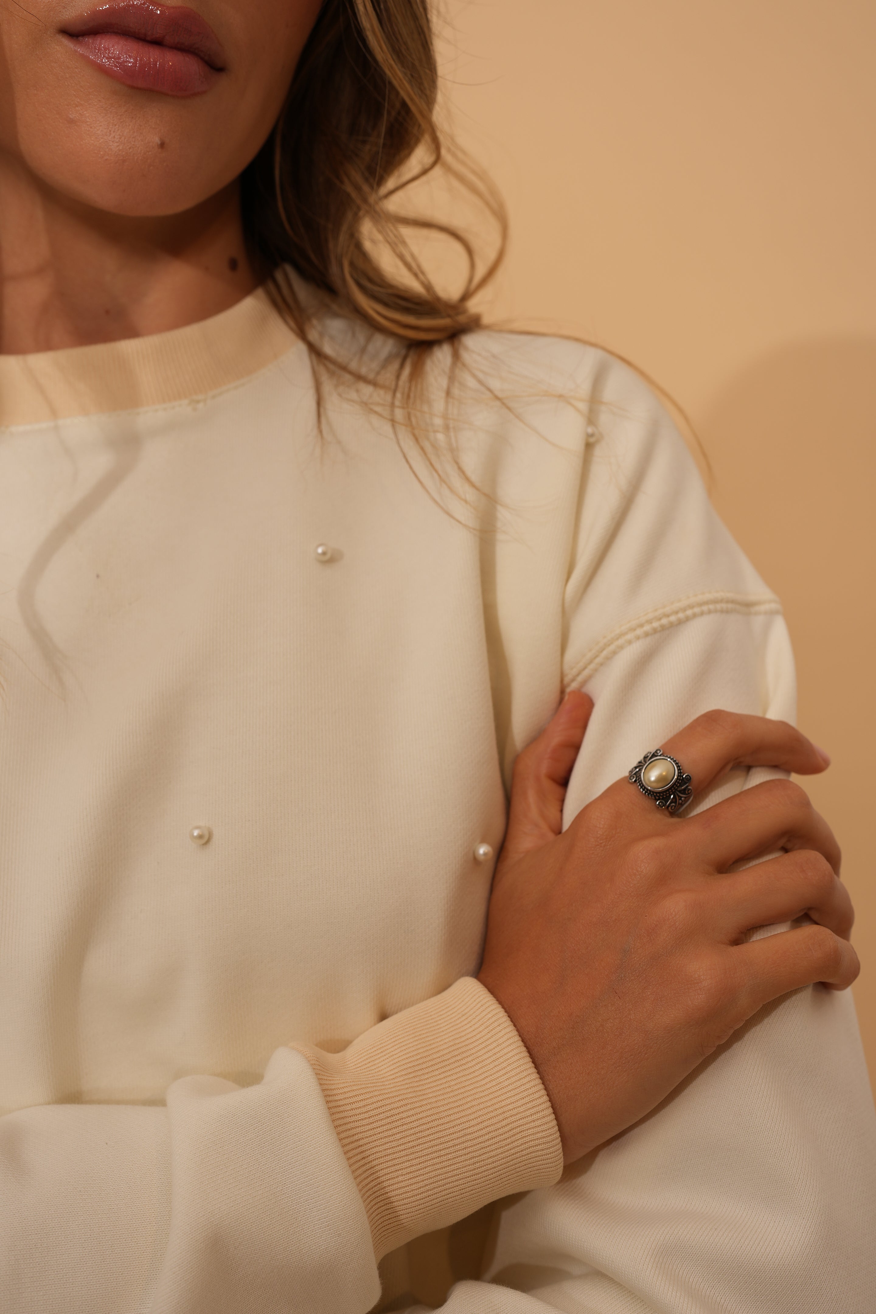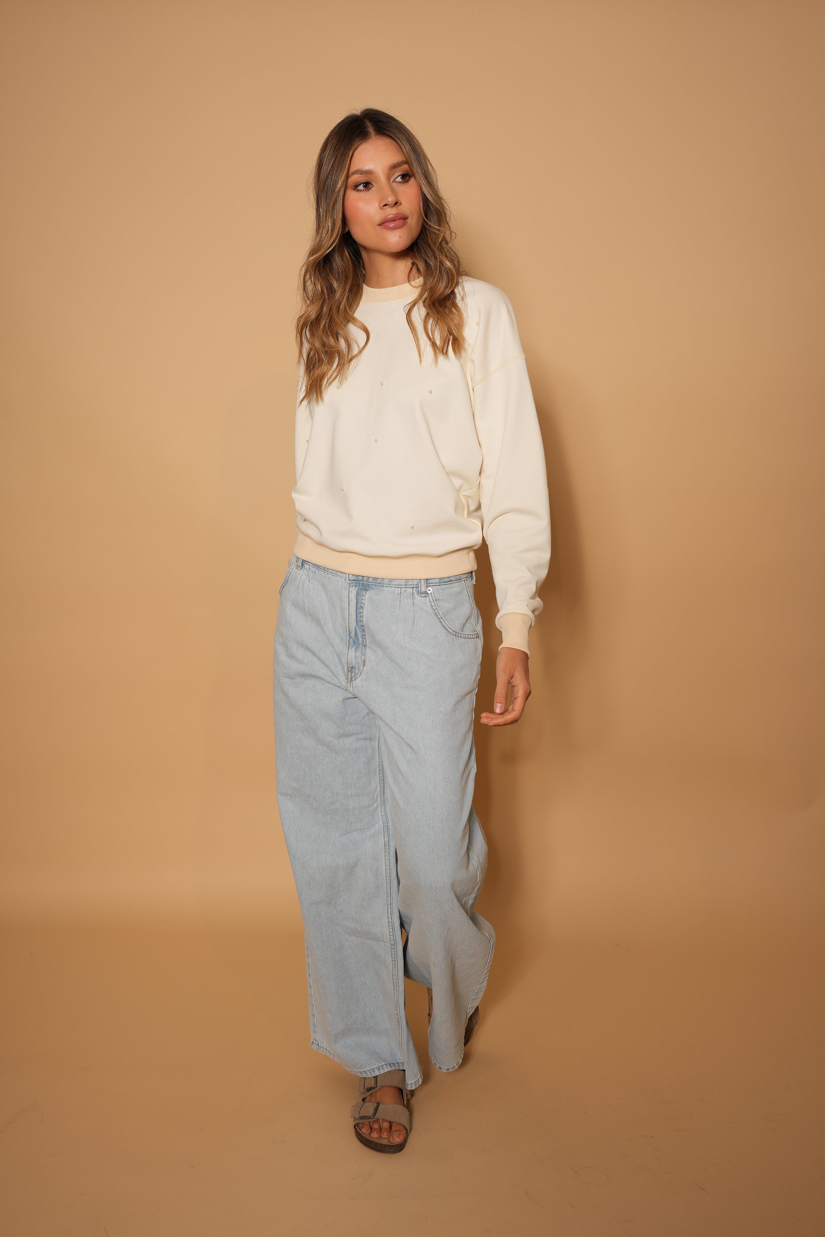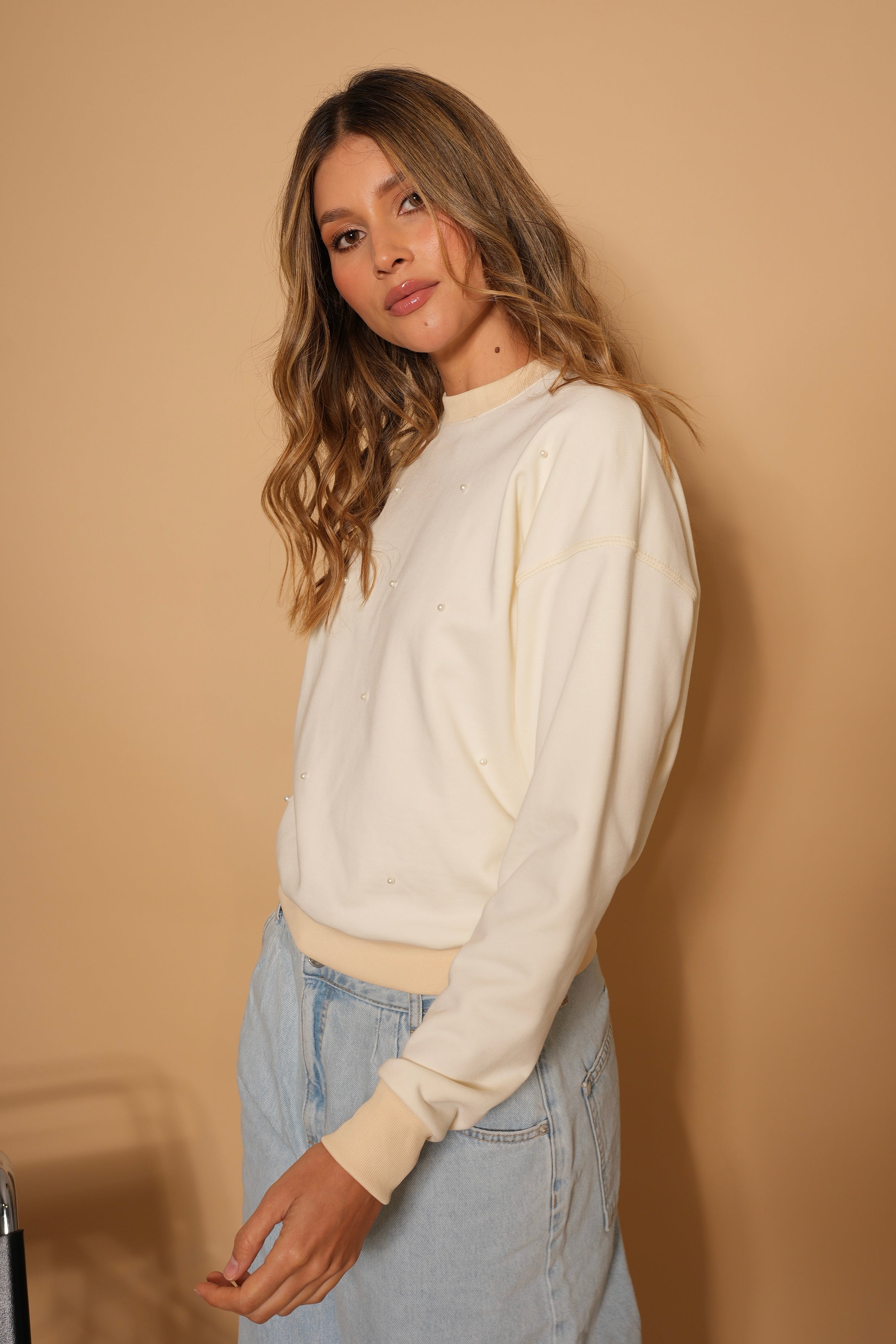 Buzo en color crema con detalle delicado de mini perlas al frente. Fit relajado, liviano, perfecto para elevar looks casuales con un toque femenino minimal. Ideal para uso diario, fácil de combinar y super cómodo.