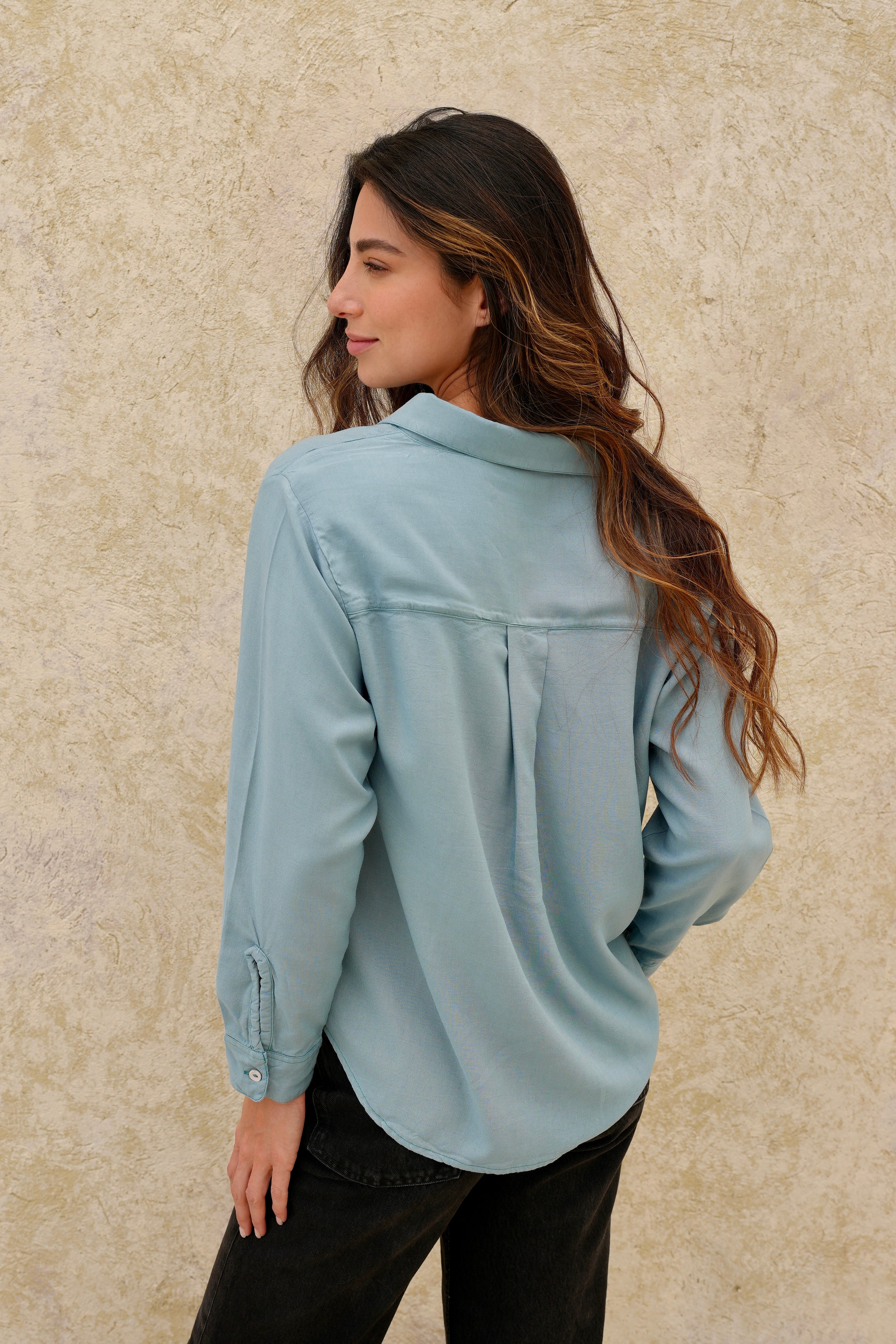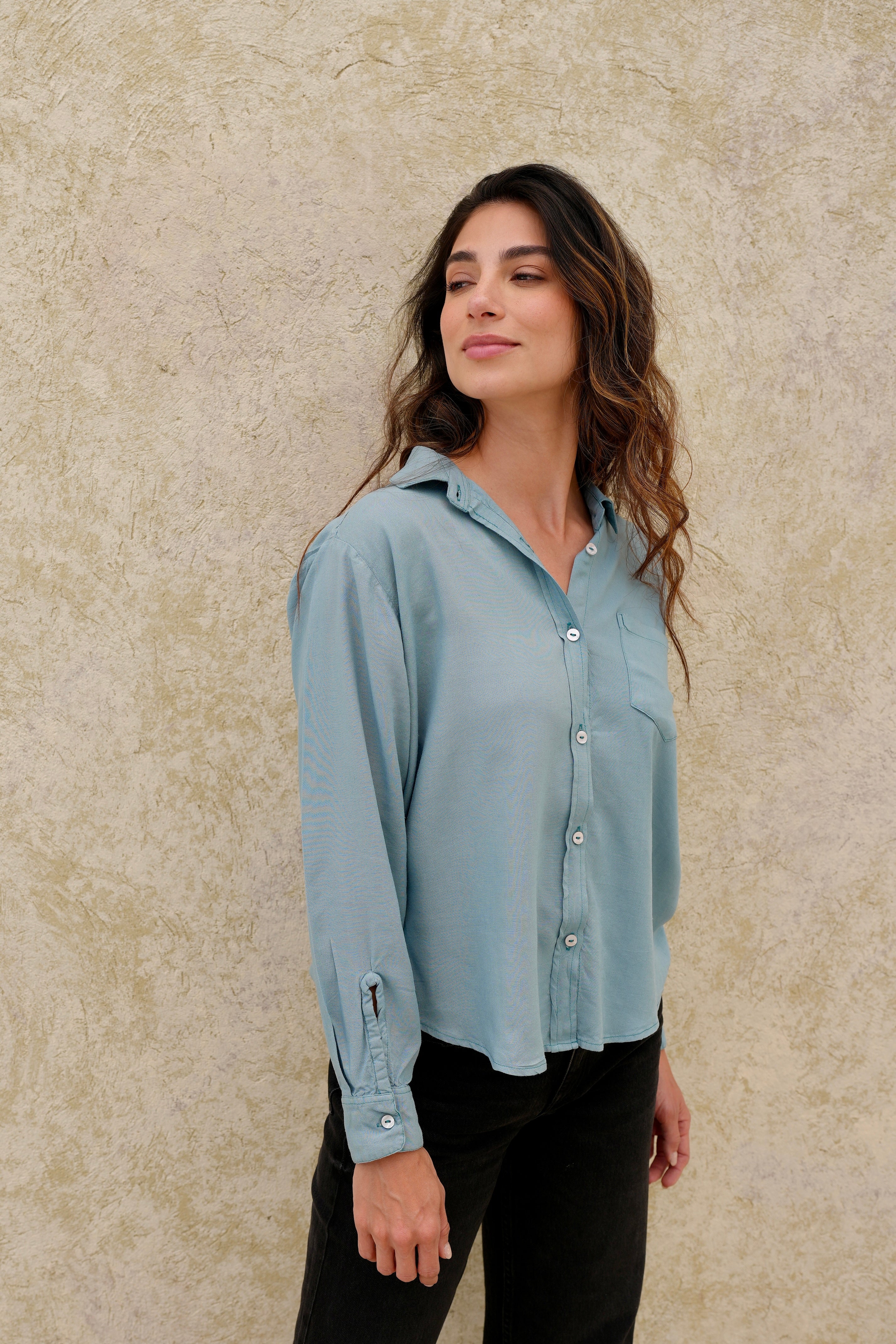 Camisa turquesa de tela poliester, manga larga, botones funcionales, perfecta para cualquier ocasión.