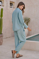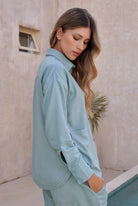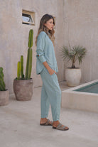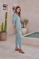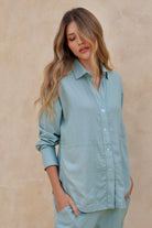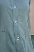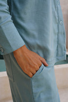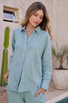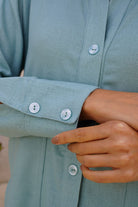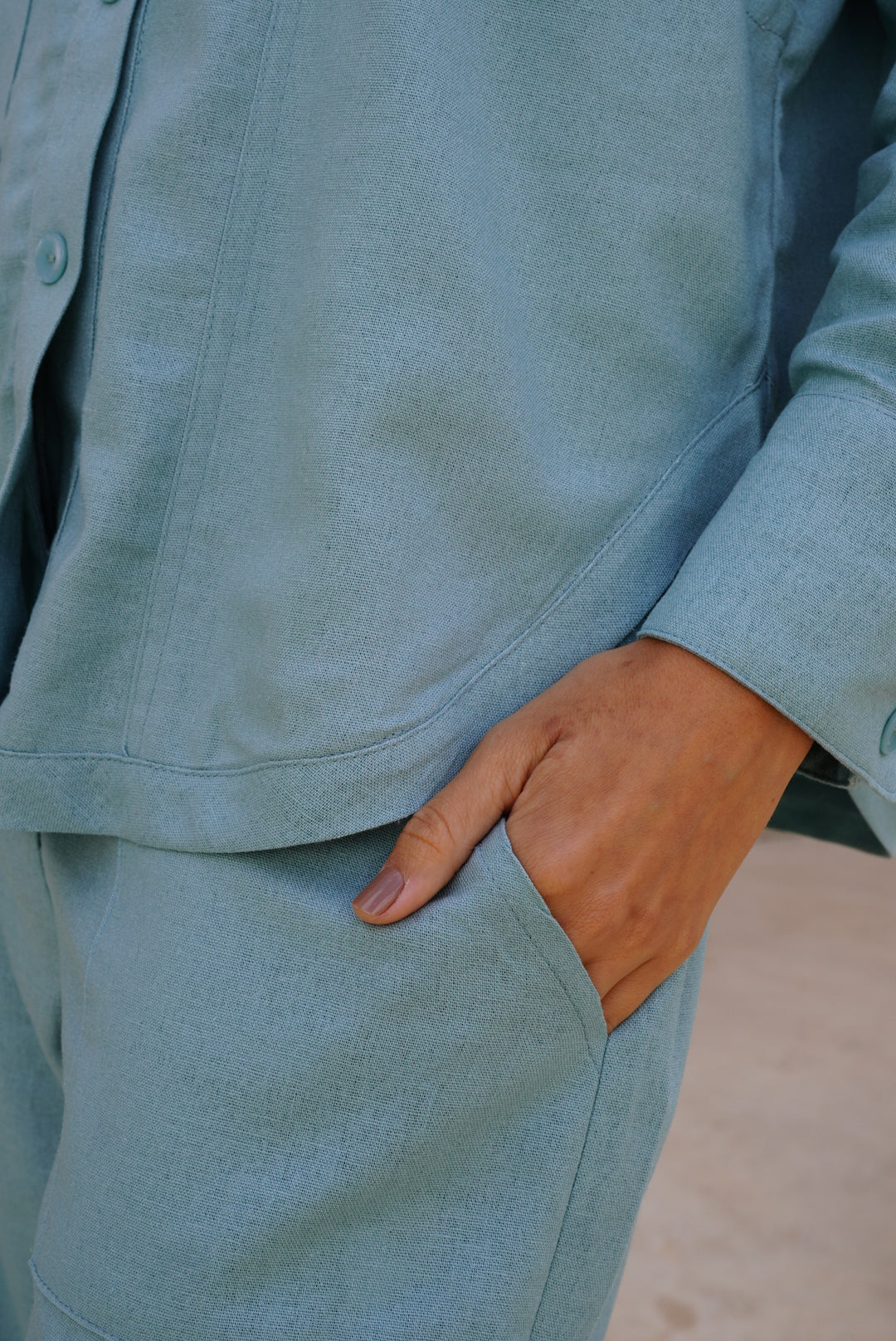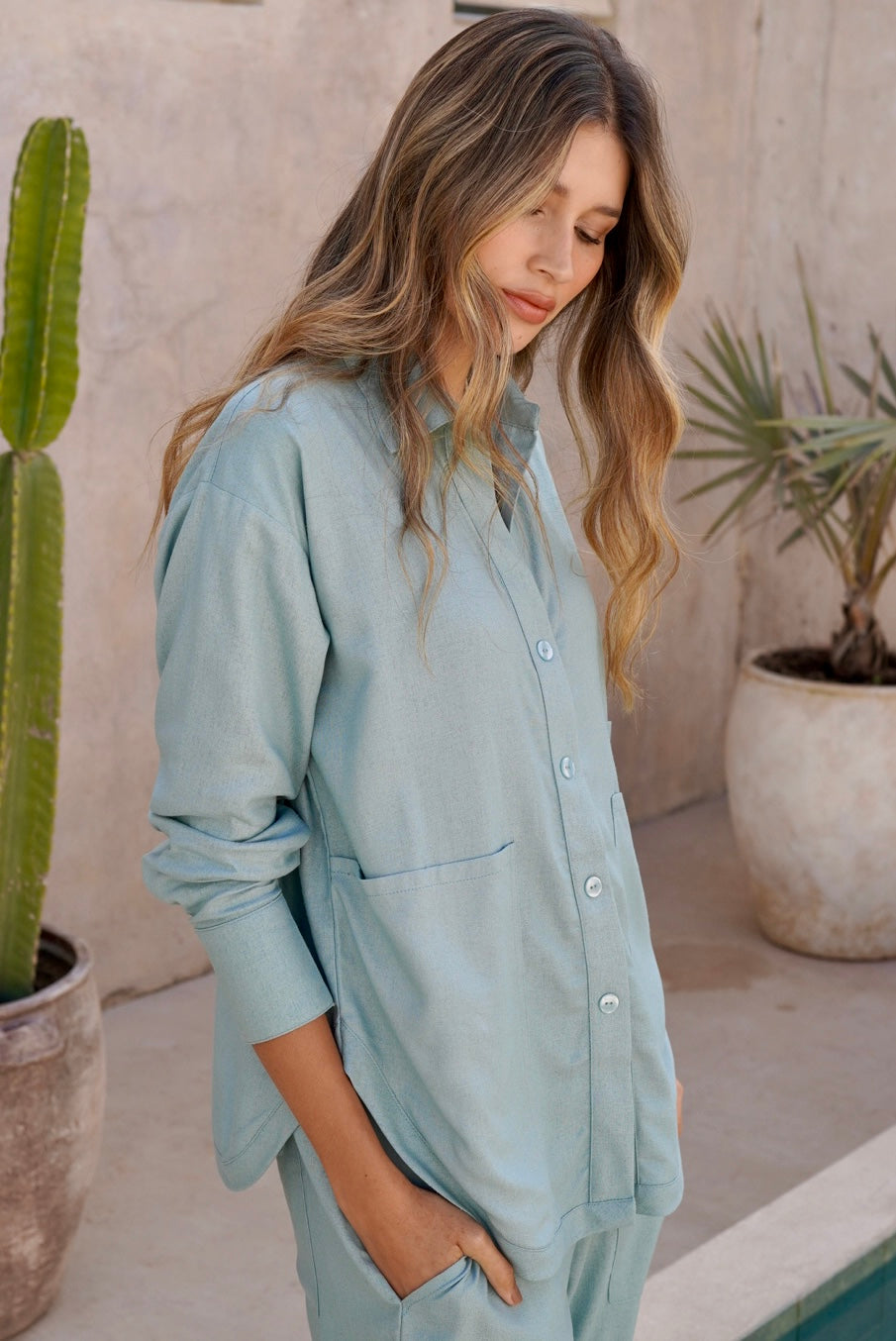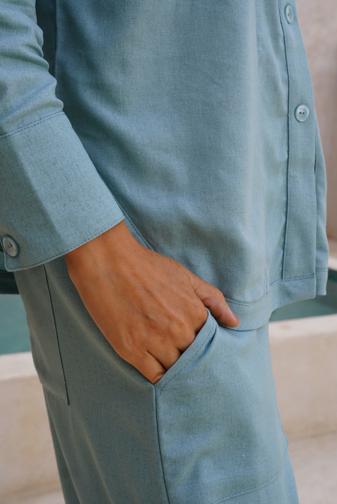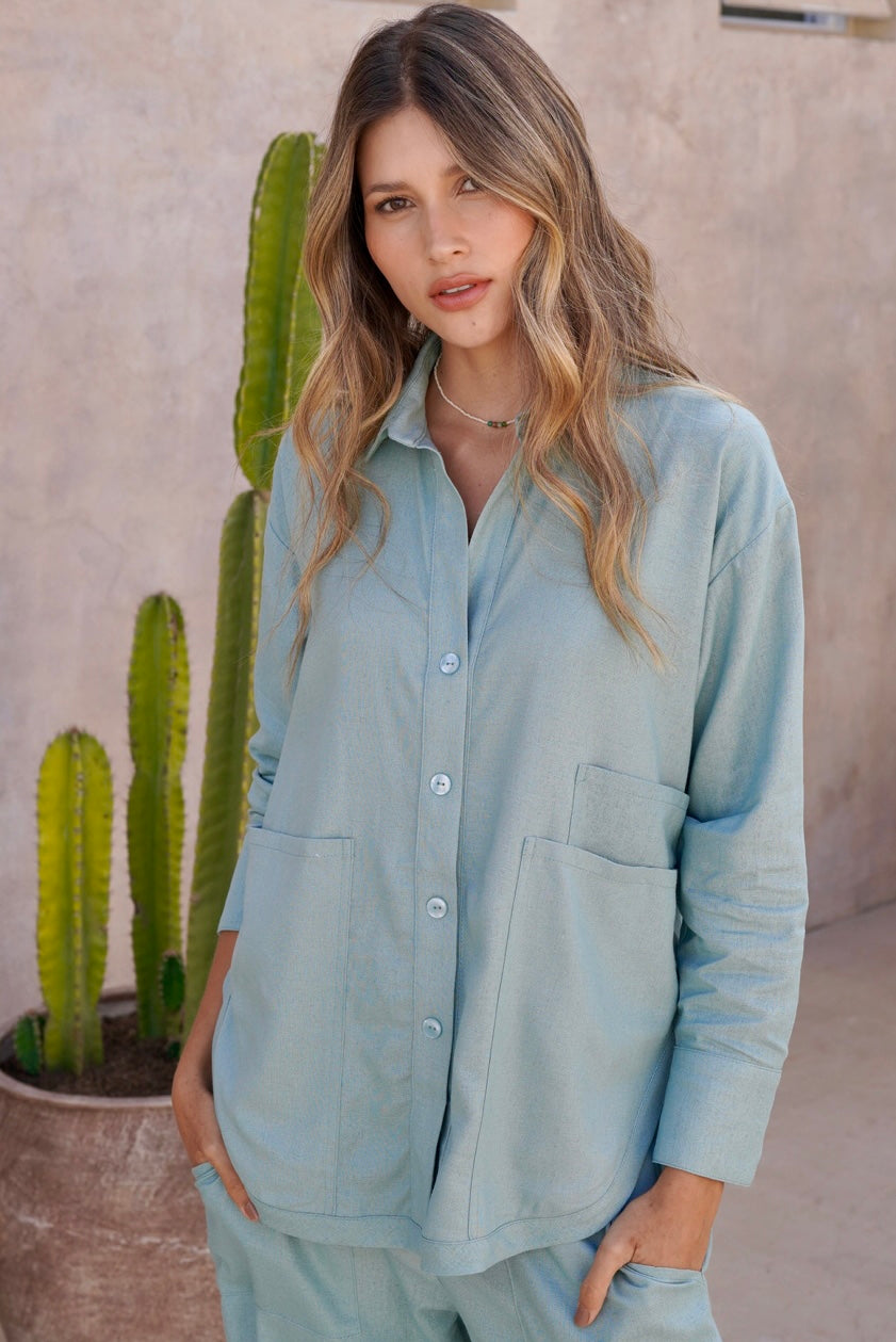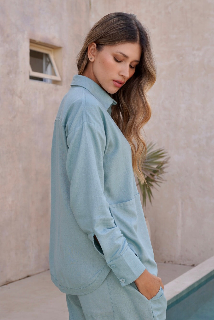 Camisa verde menta manga larga en tela lino rayón, bolsillos y botones funcionales.