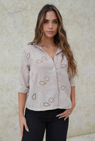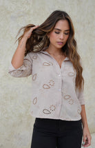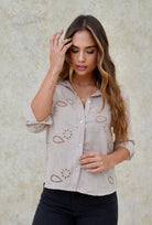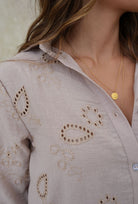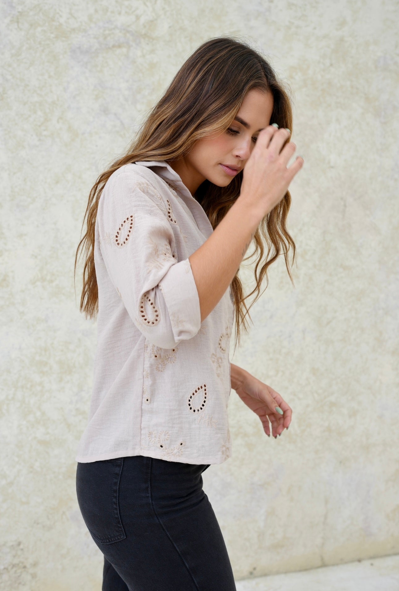 Camisa gris en ojalillo de poliester, con diseño fluido y delicado, botones funcionales y manga midi.