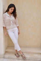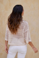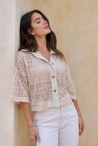 Camisa beige silueta amplia en tela poliéster tipo maya, diseño minimalista con botones funcionales. No incluye top interno