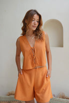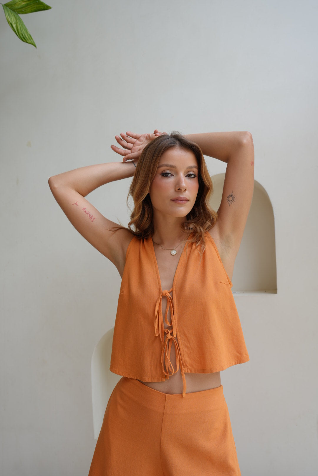 Chaleco naranja manga sisa, con escote en V, en tela rayón, ajustable al frente con dos delicados lazos del mismo tejido.