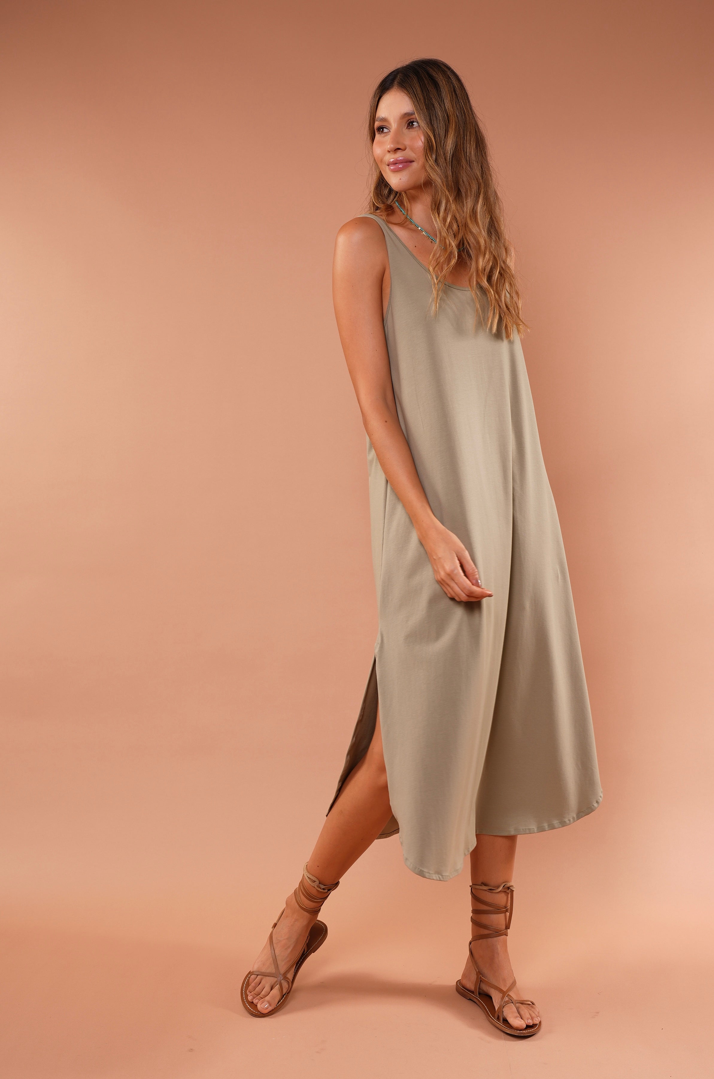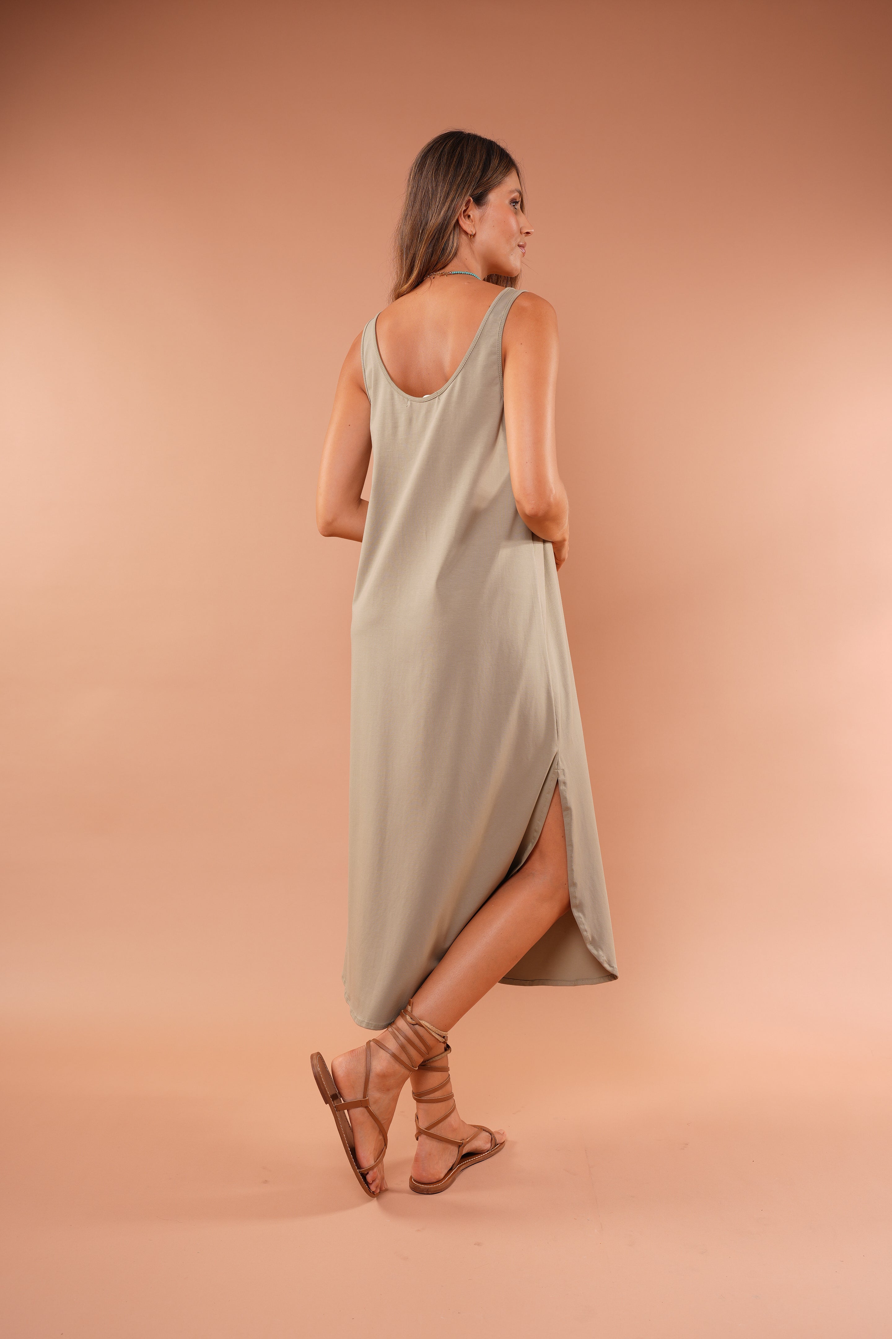 Un básico elevado que combina comodidad, movimiento y sofisticación natural. Este vestido midi de silueta amplia cae suavemente sobre el cuerpo, creando una línea limpia y favorecedora que estiliza sin marcar.