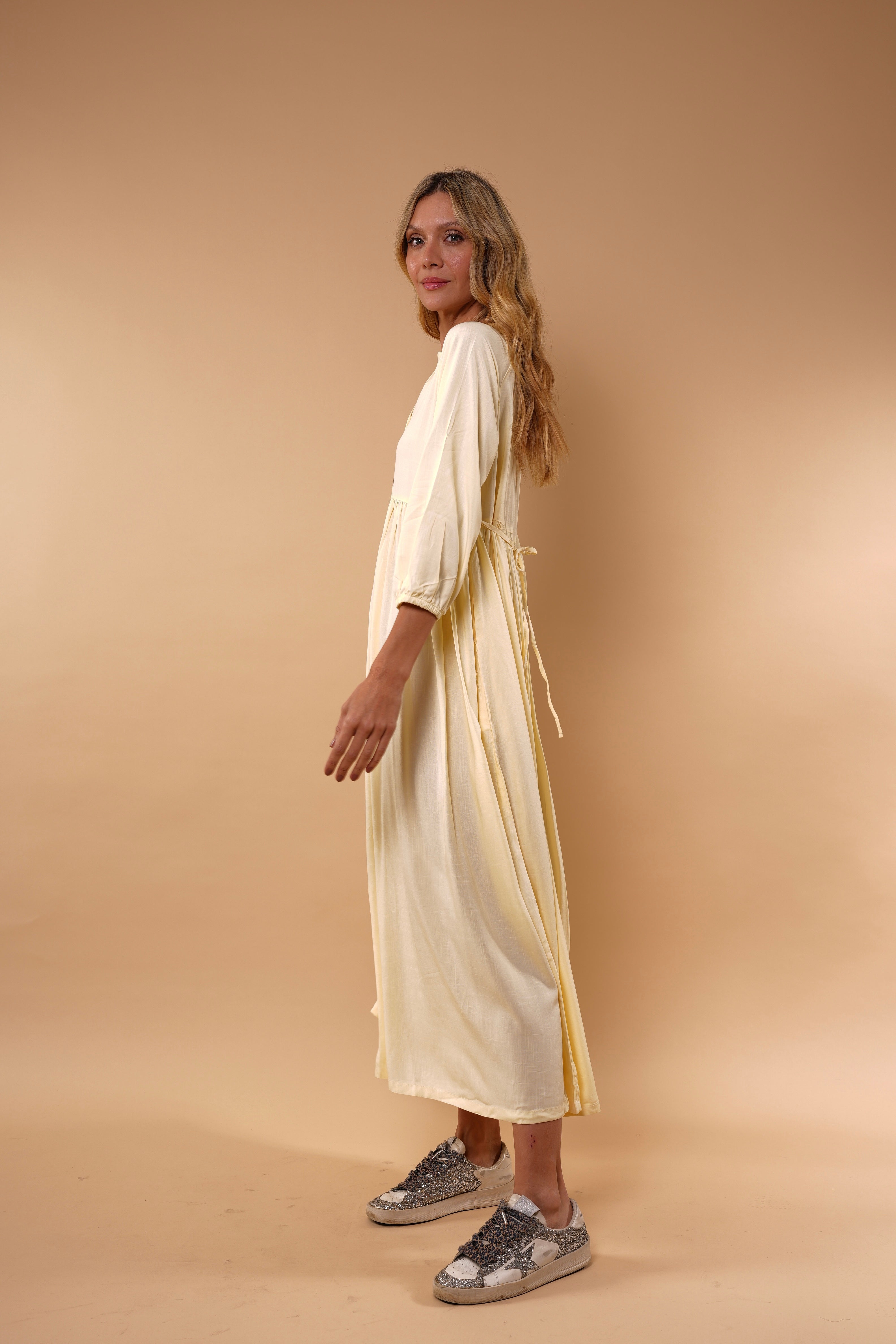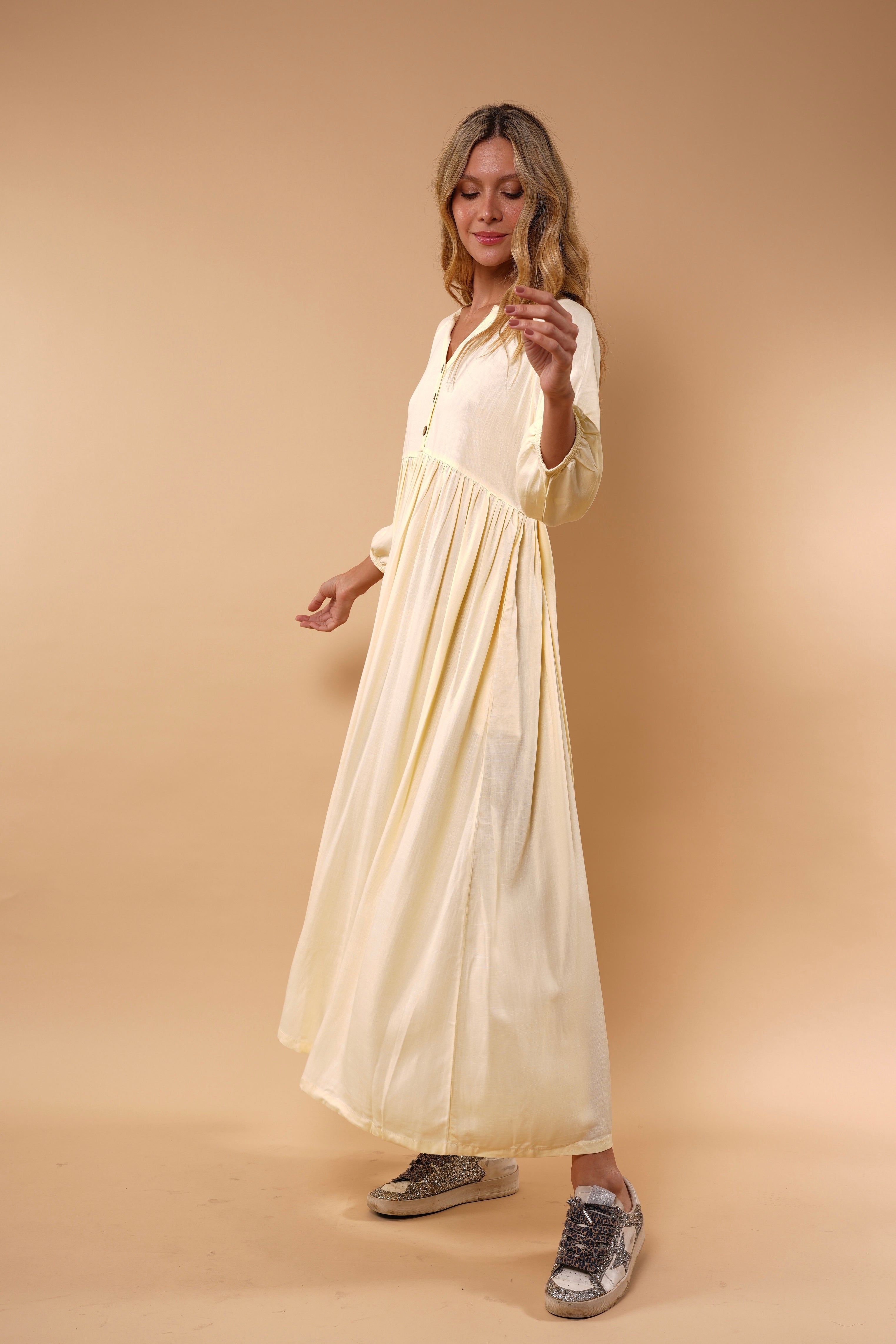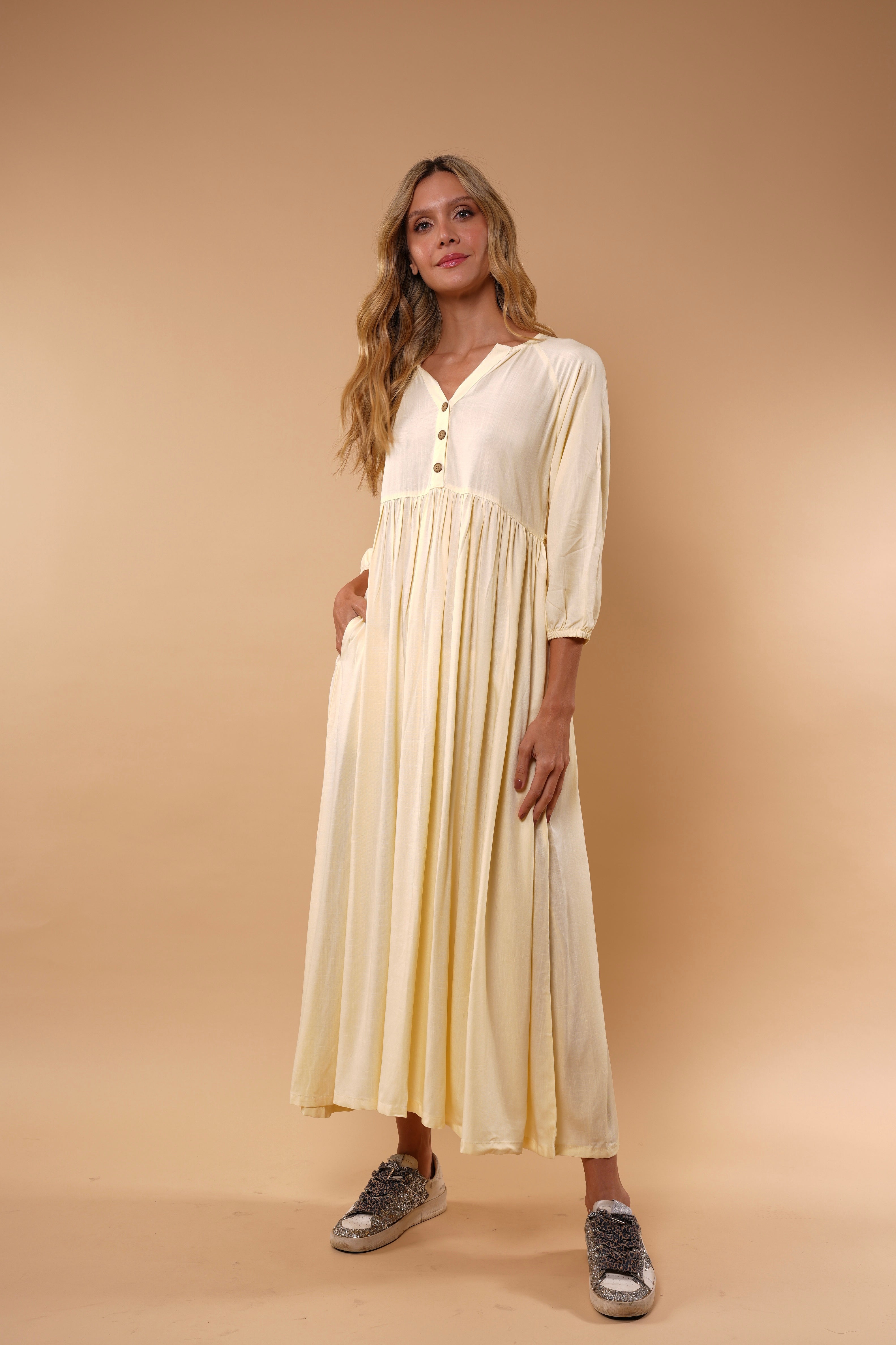 Ligero, femenino y naturalmente elegante. Este vestido está diseñado para acompañarte con suavidad y movimiento en cada paso. Su silueta amplia y fluida estiliza sin ajustar, brindando comodidad y sofisticación al mismo tiempo.