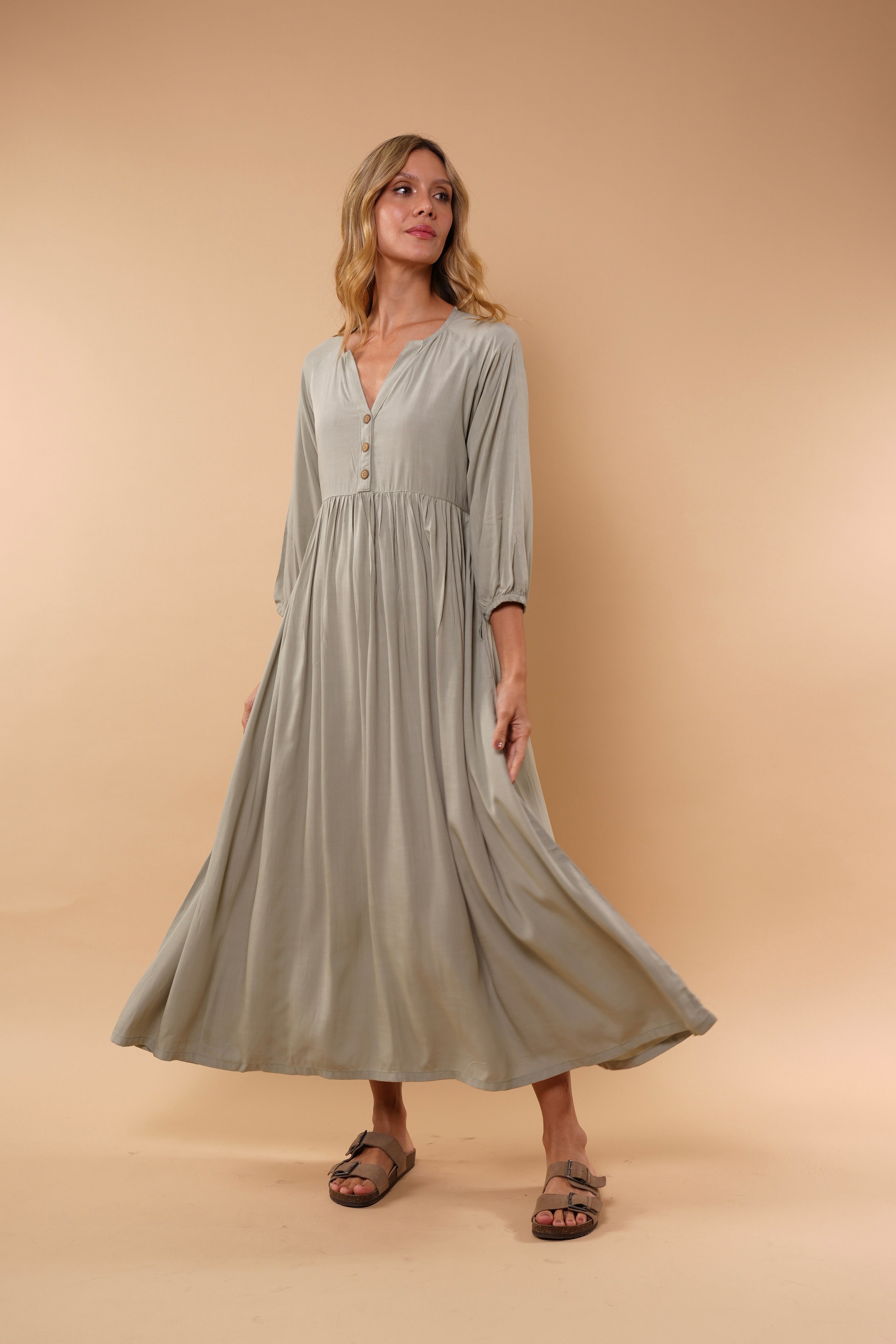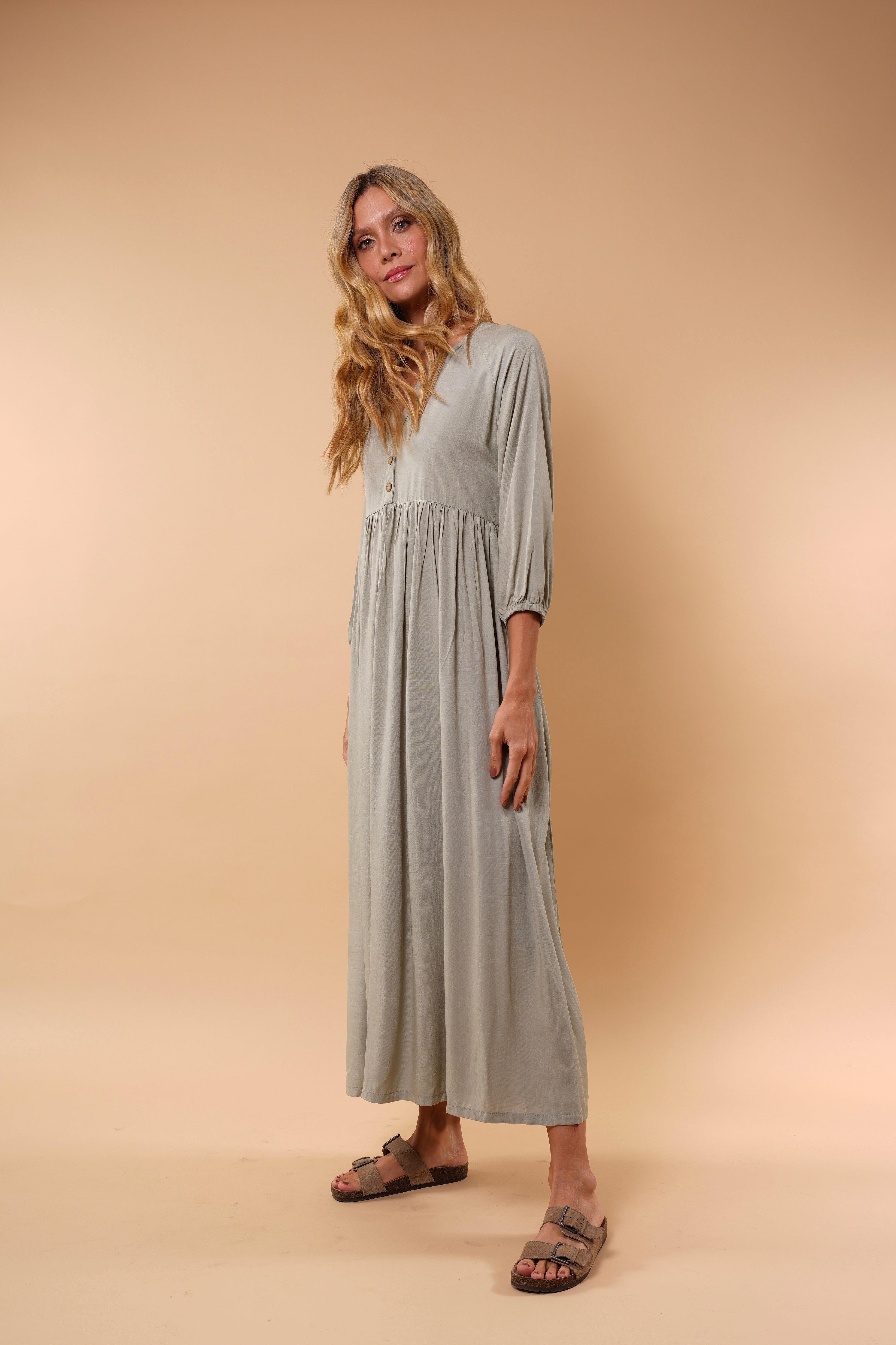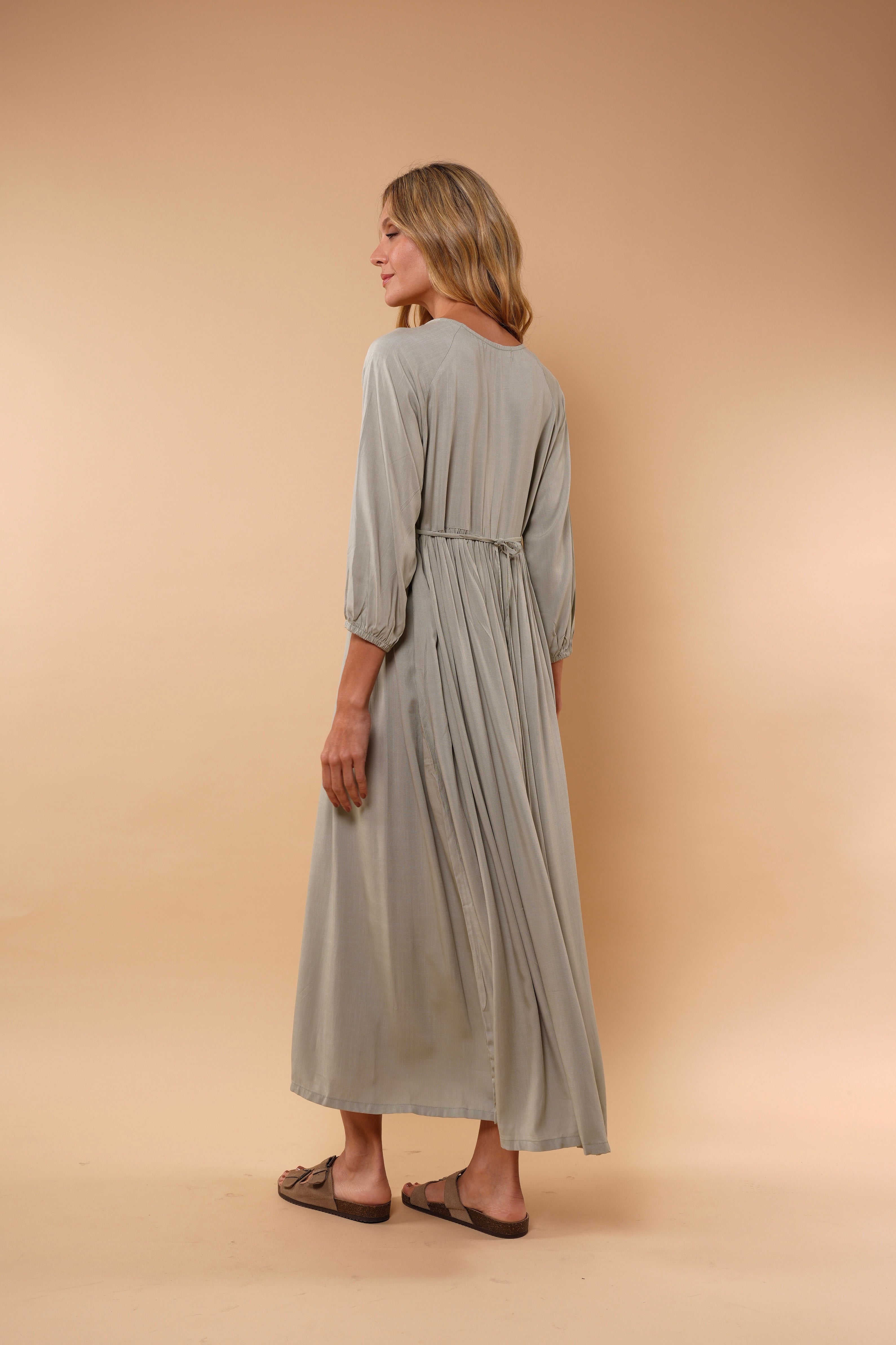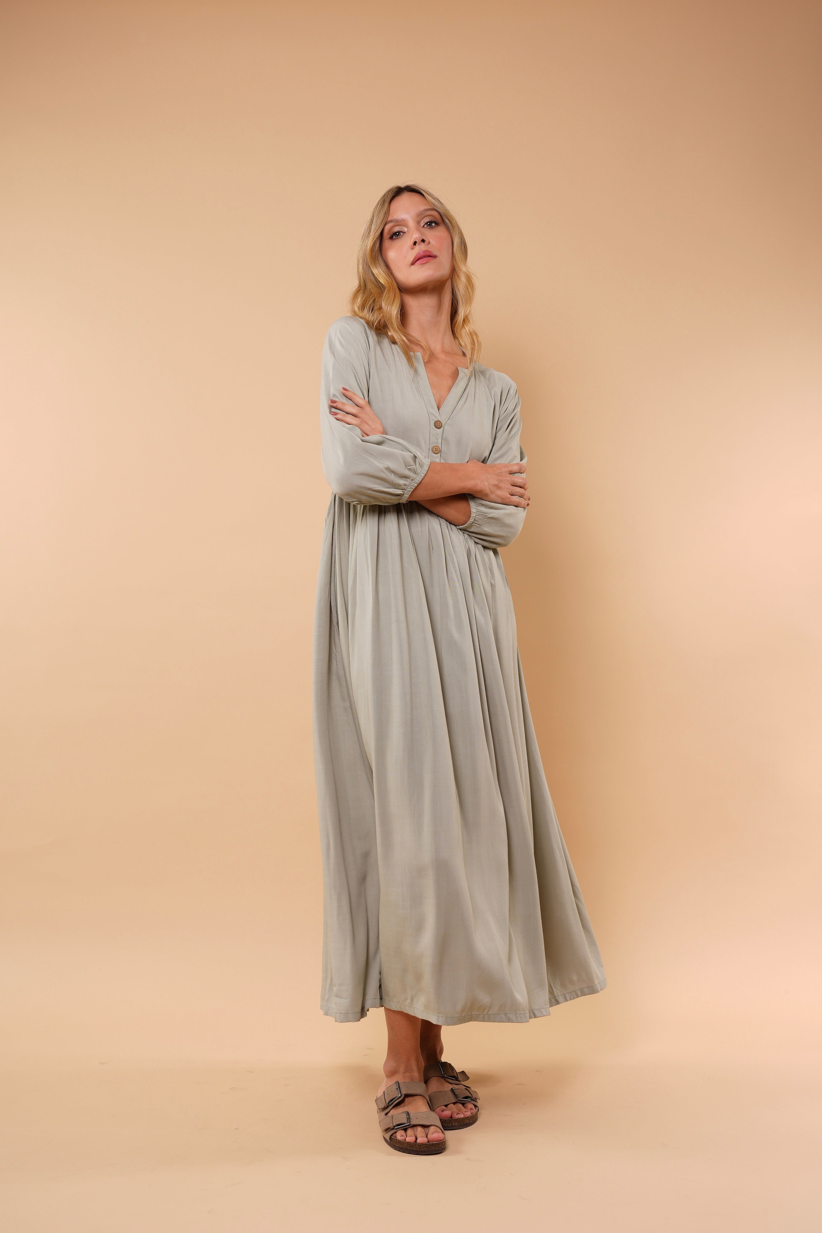 Ligero, femenino y naturalmente elegante. Este vestido está diseñado para acompañarte con suavidad y movimiento en cada paso. Su silueta amplia y fluida estiliza sin ajustar, brindando comodidad y sofisticación al mismo tiempo.
