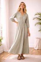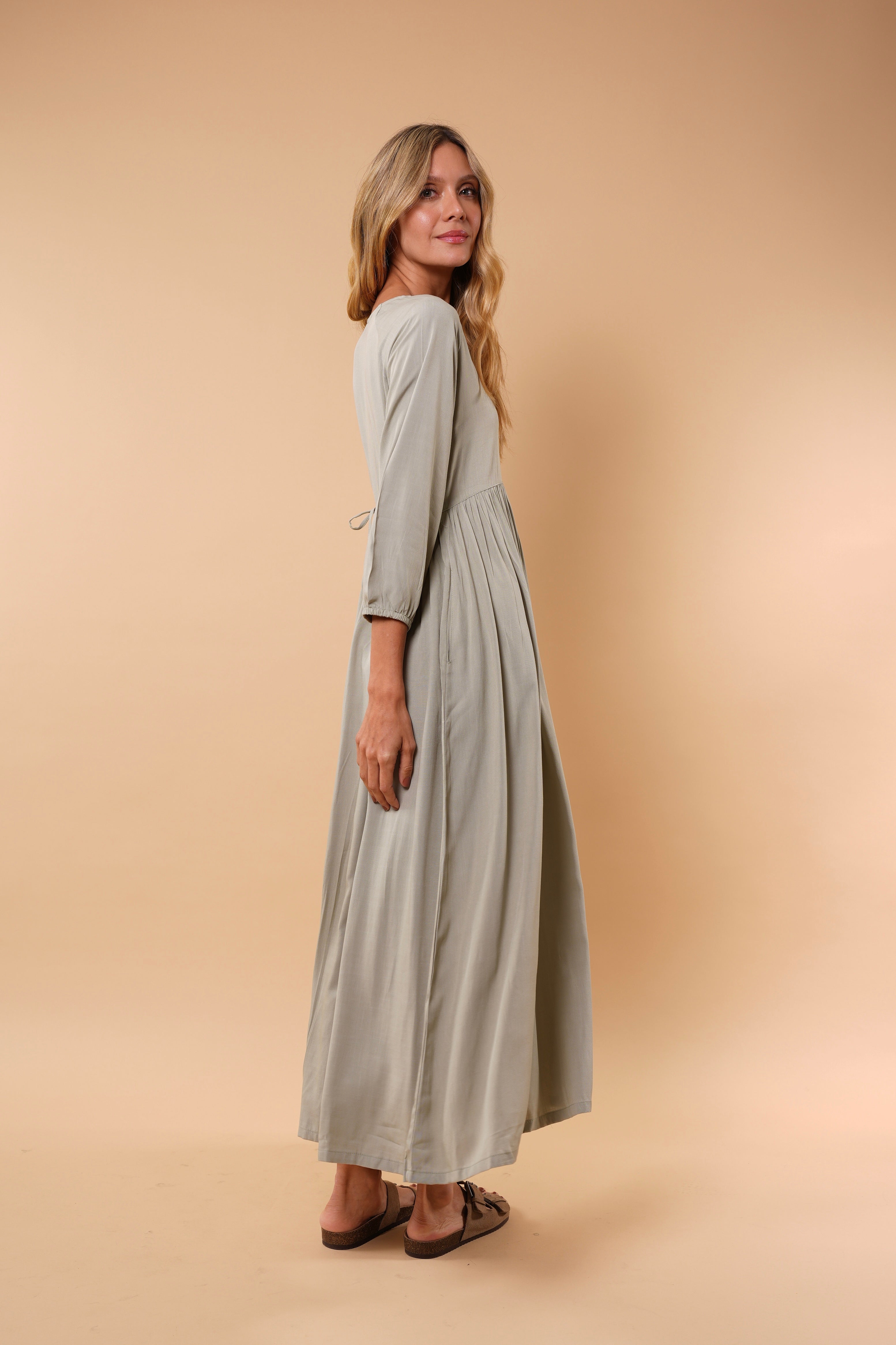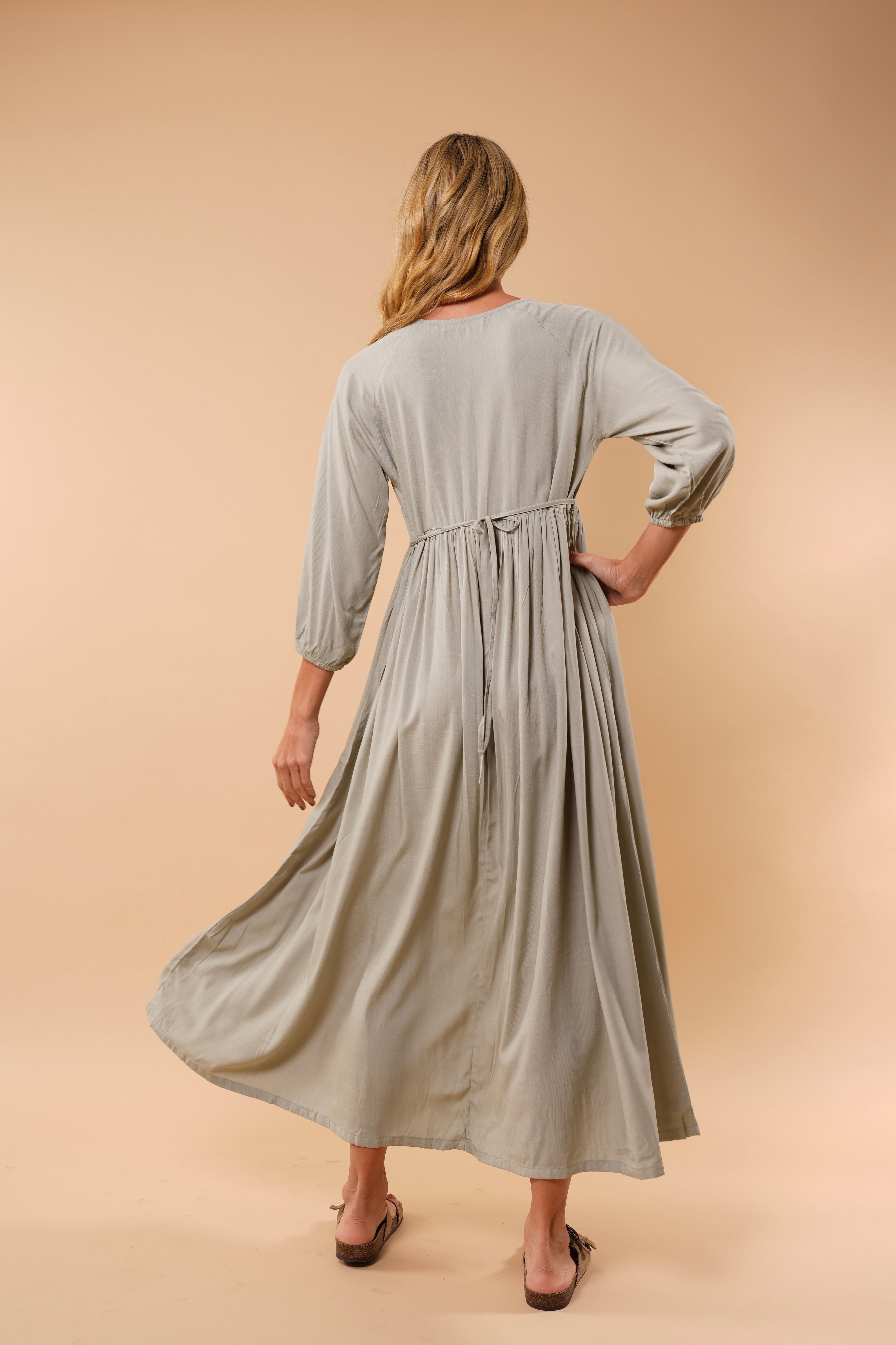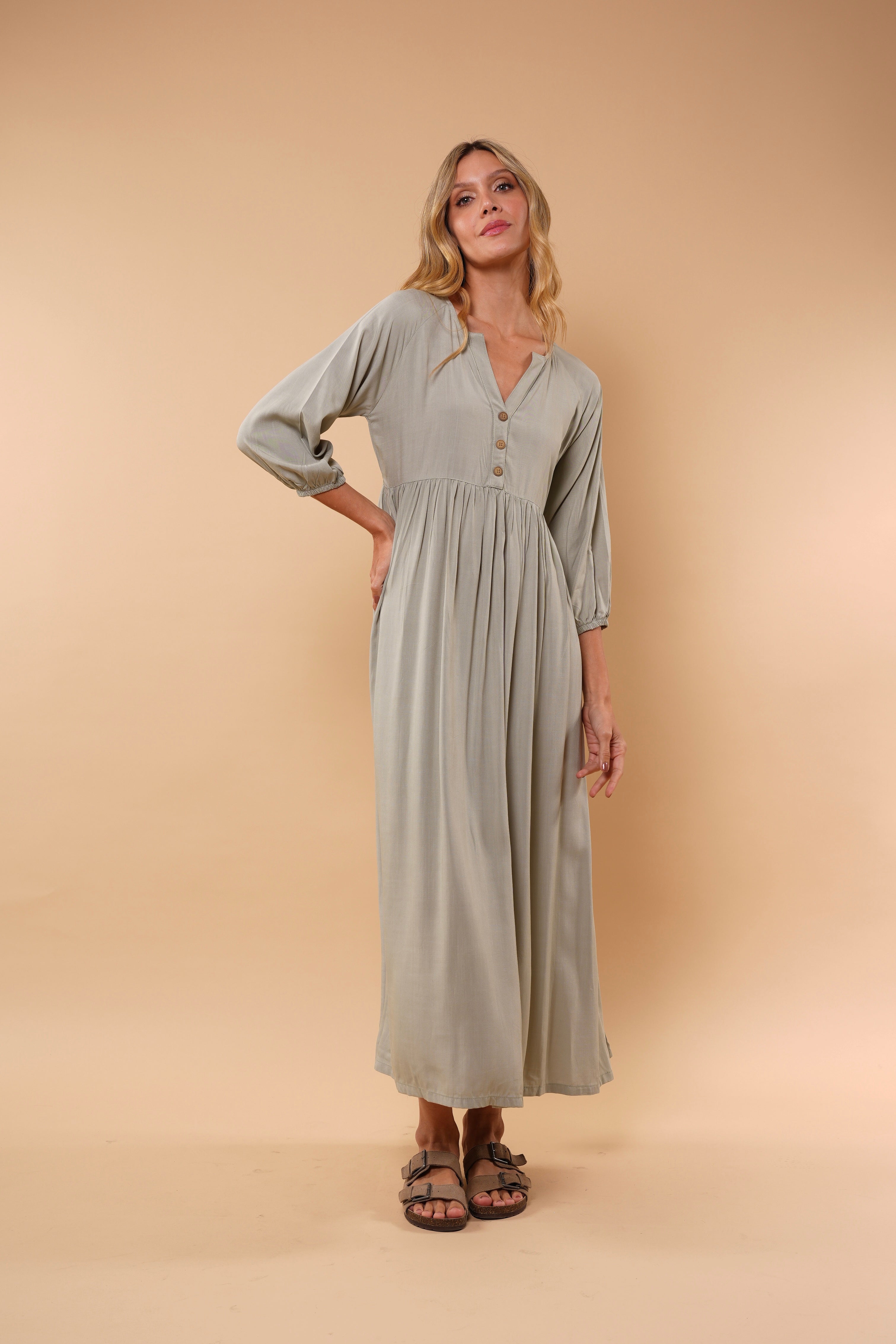 Ligero, femenino y naturalmente elegante. Este vestido está diseñado para acompañarte con suavidad y movimiento en cada paso. Su silueta amplia y fluida estiliza sin ajustar, brindando comodidad y sofisticación al mismo tiempo.