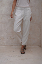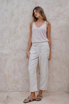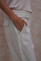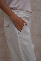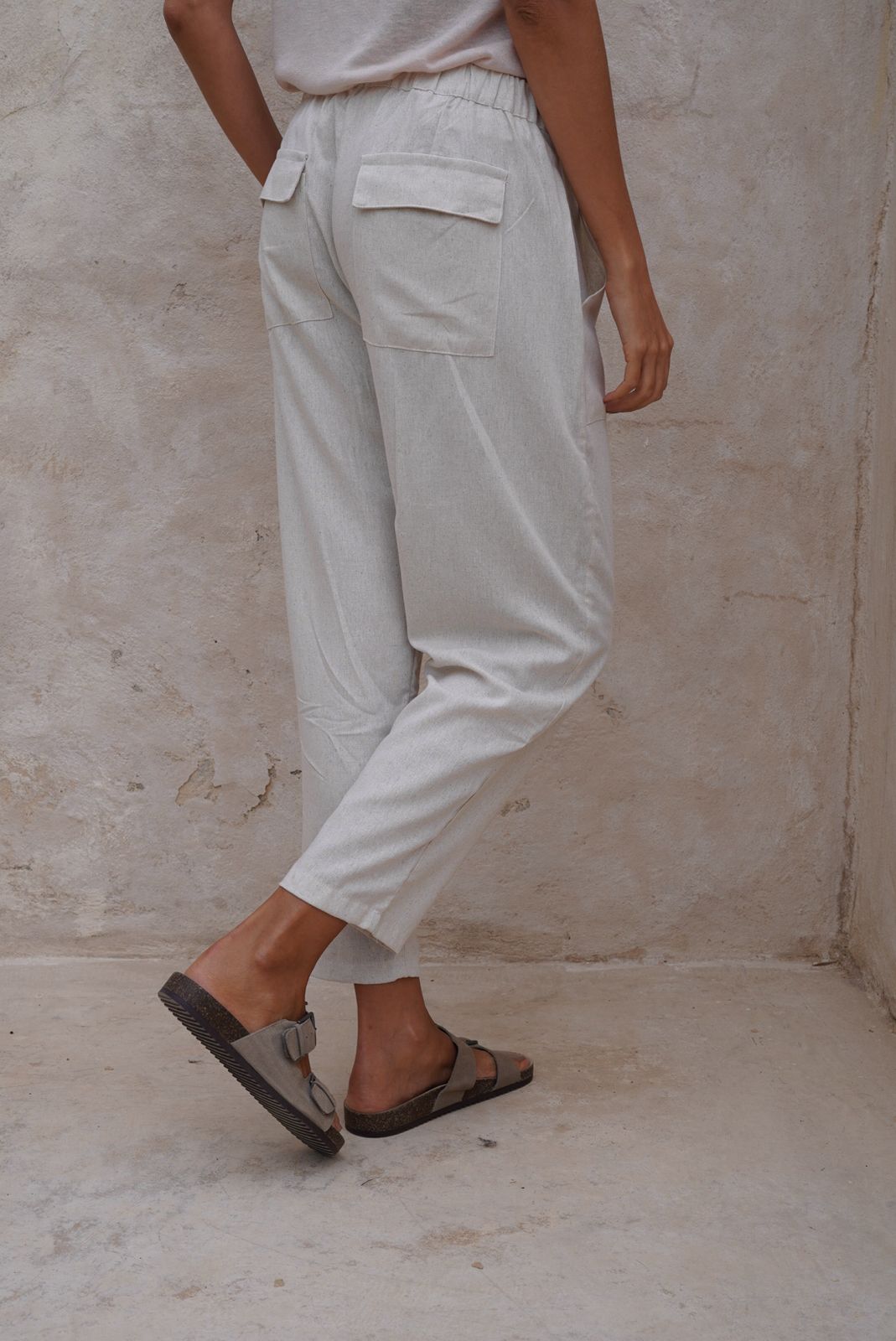 Pantalón beige tela lino rayón , con bolsillos, cierre y cómodo elástico en cintura.