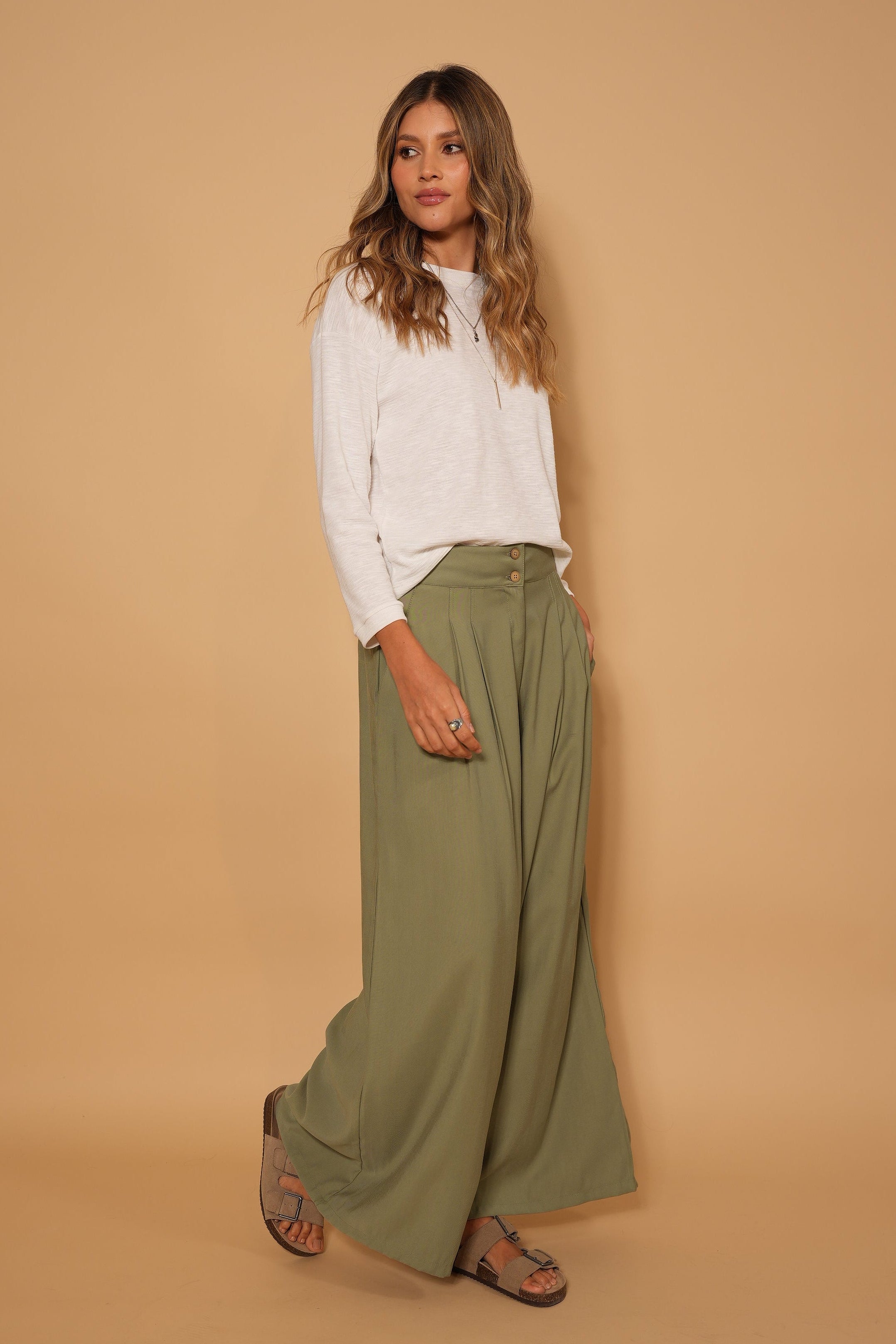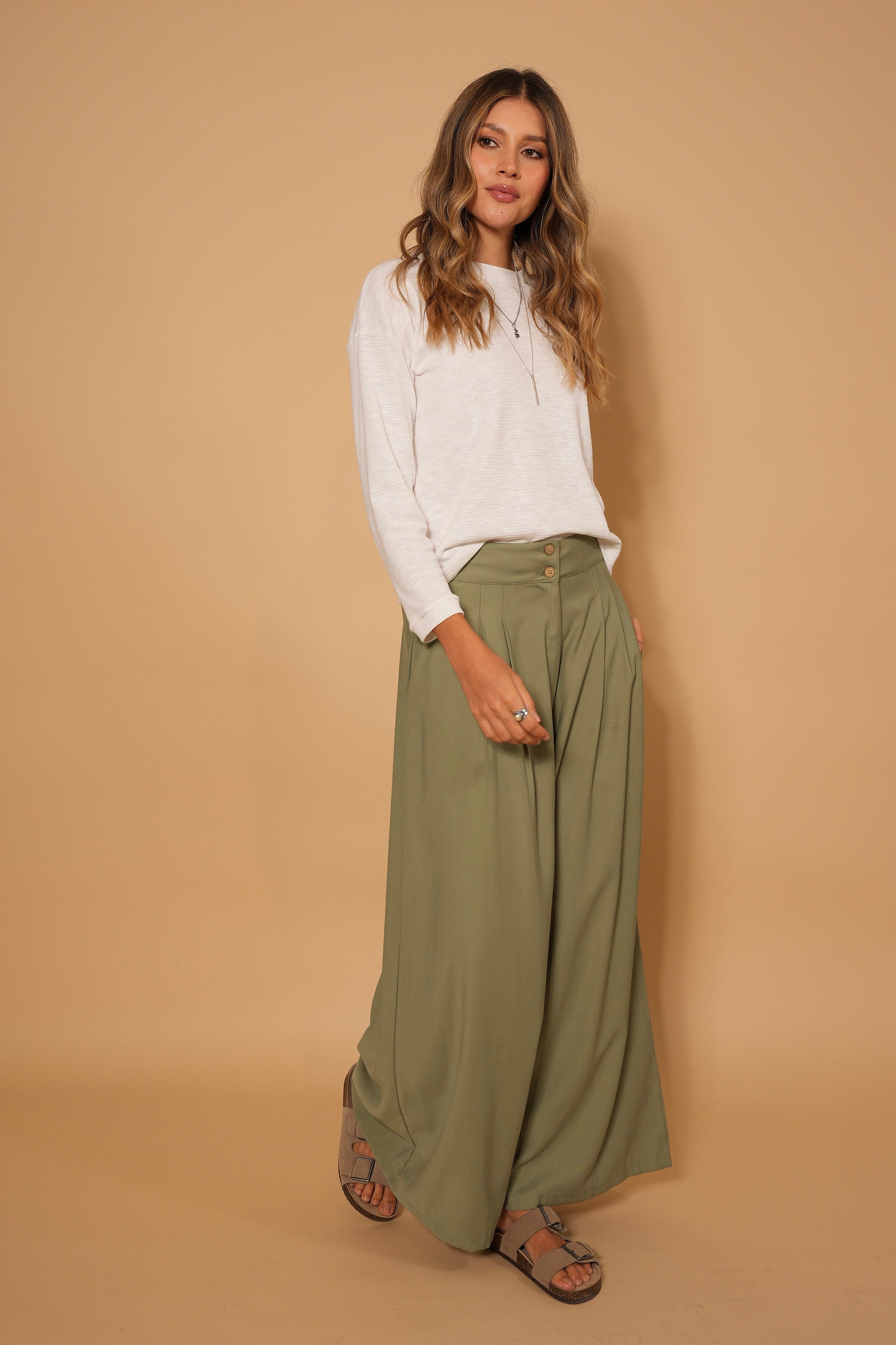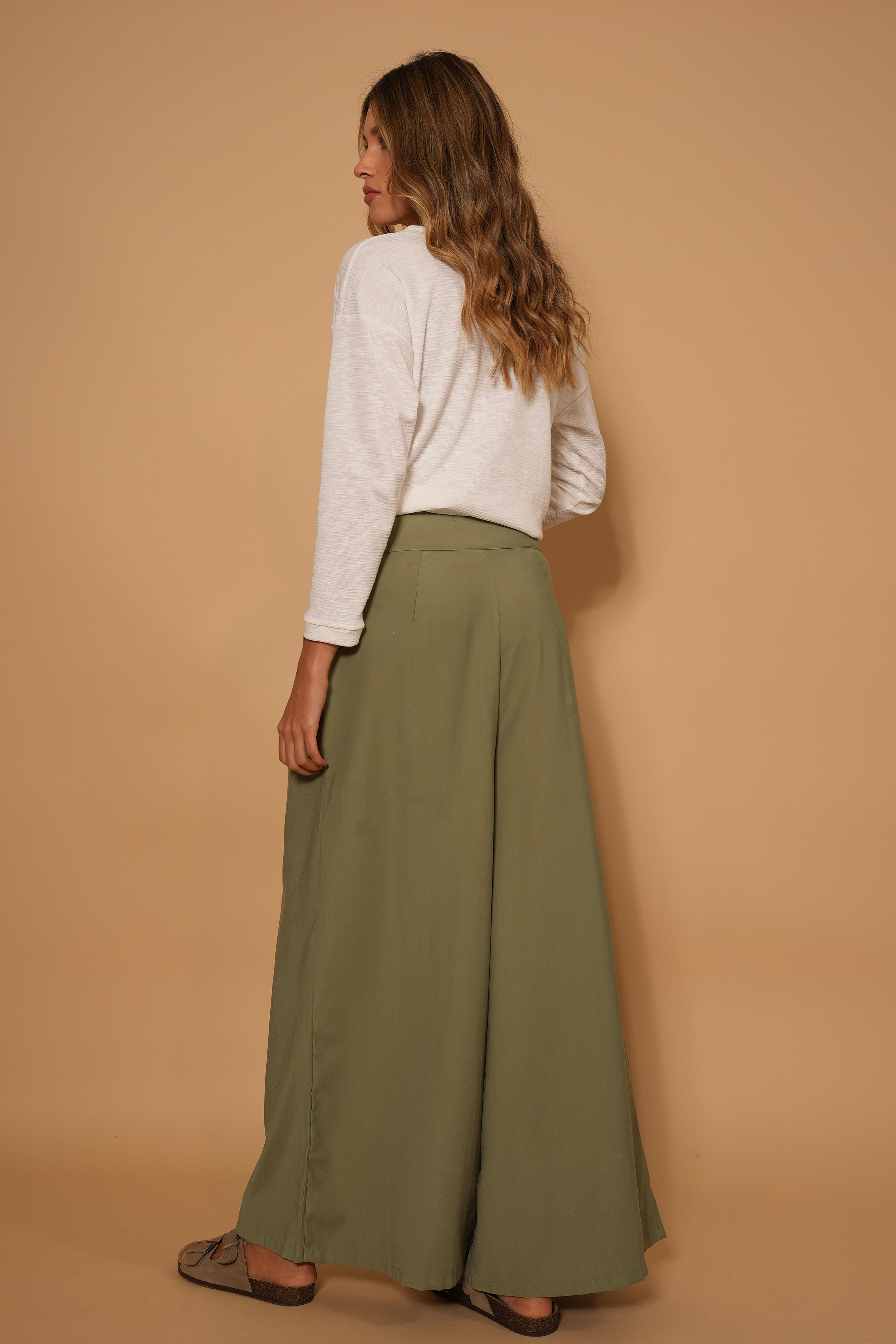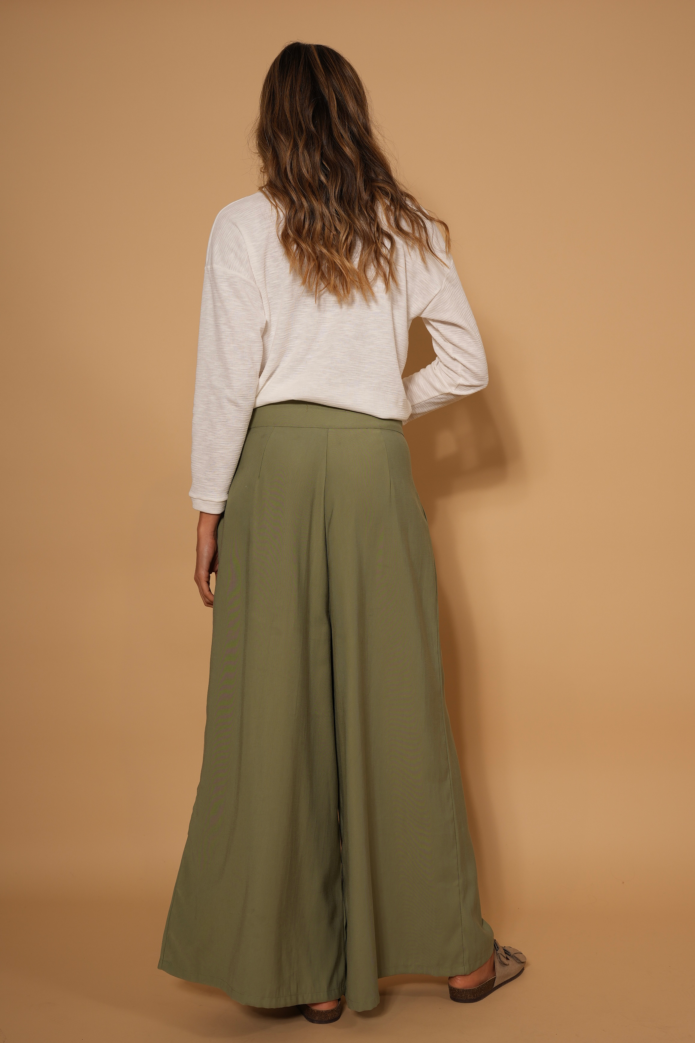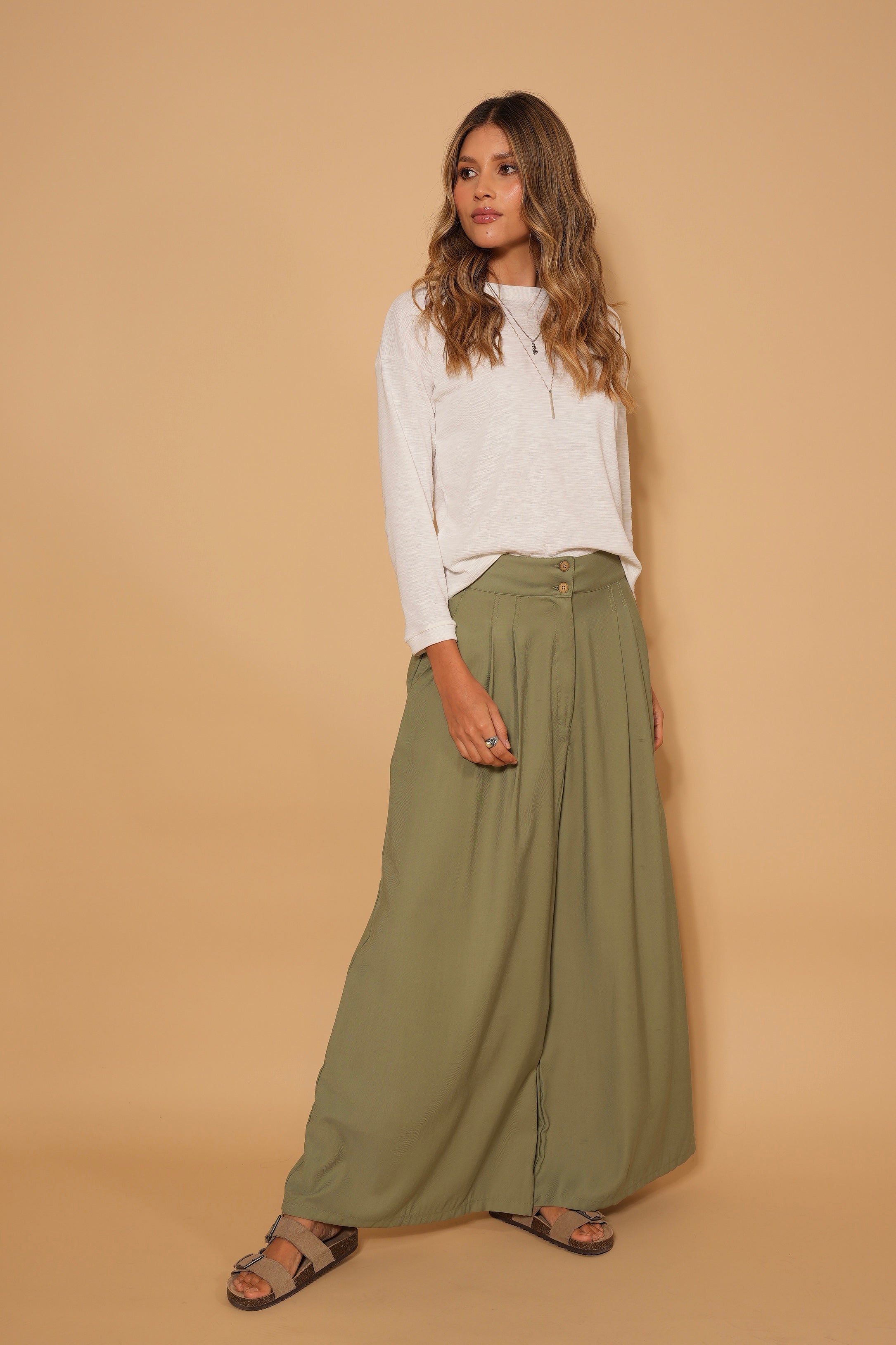 Pantalón verde, en tela rayón, tiro alto, botones, bota ancha, cierre y bolsillos lo hacen una prenda infaltable en el armario.