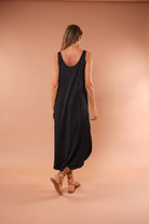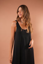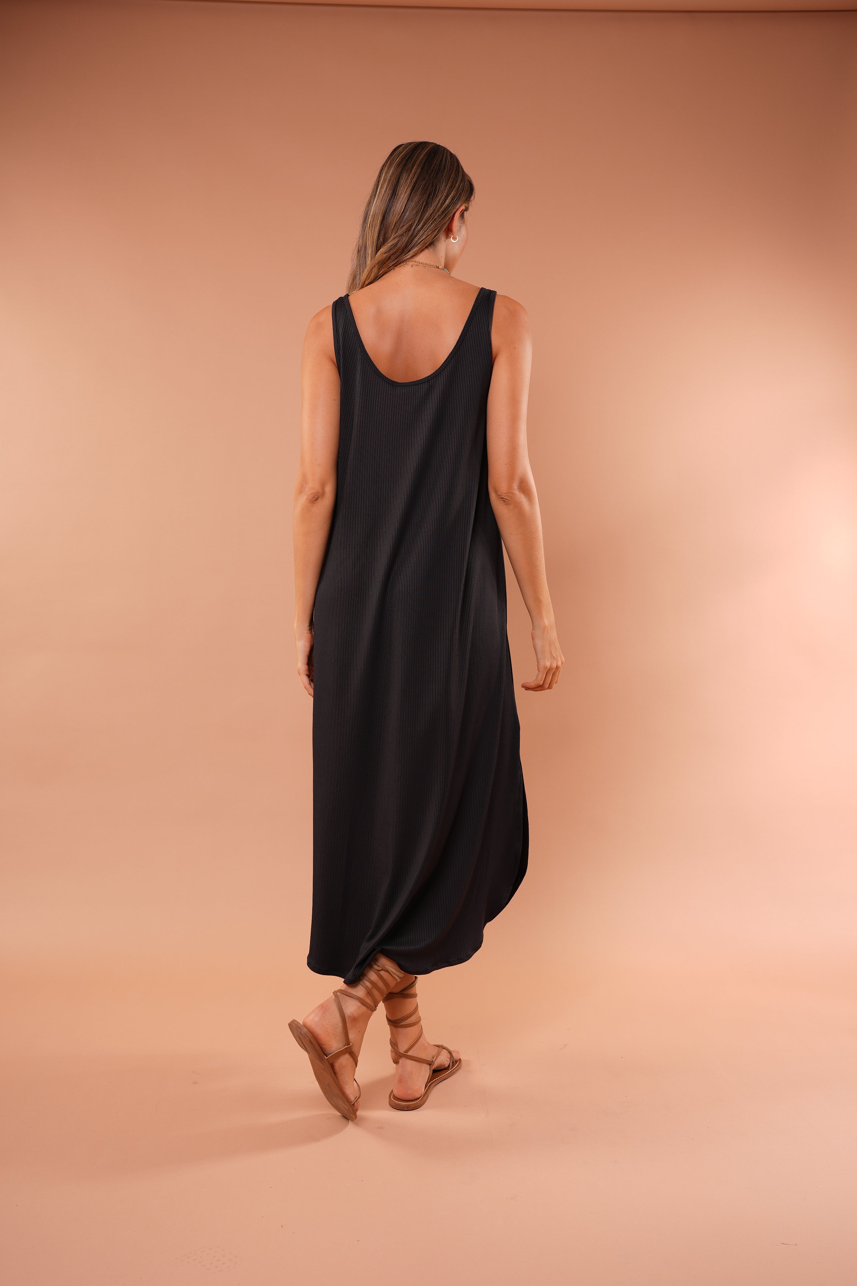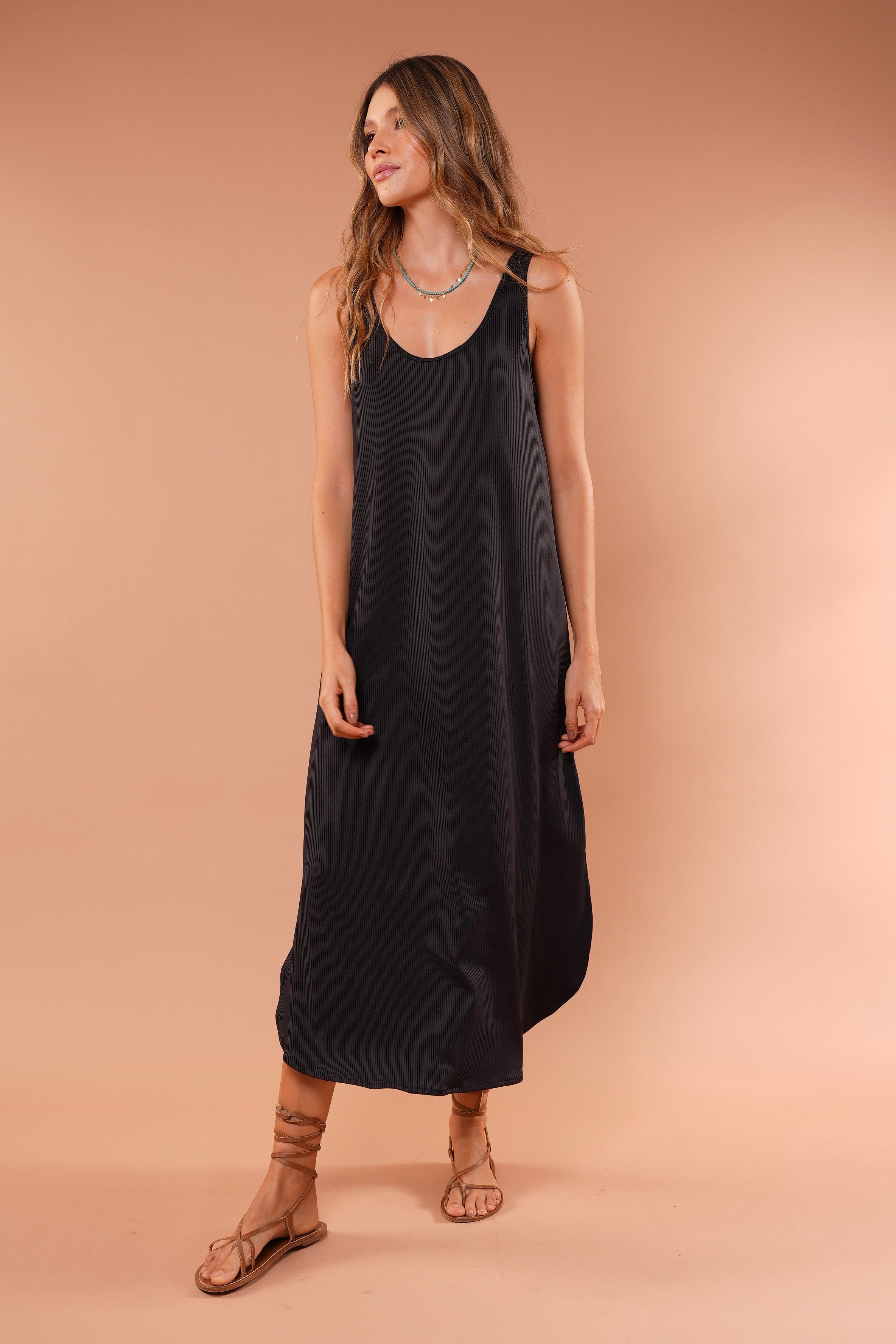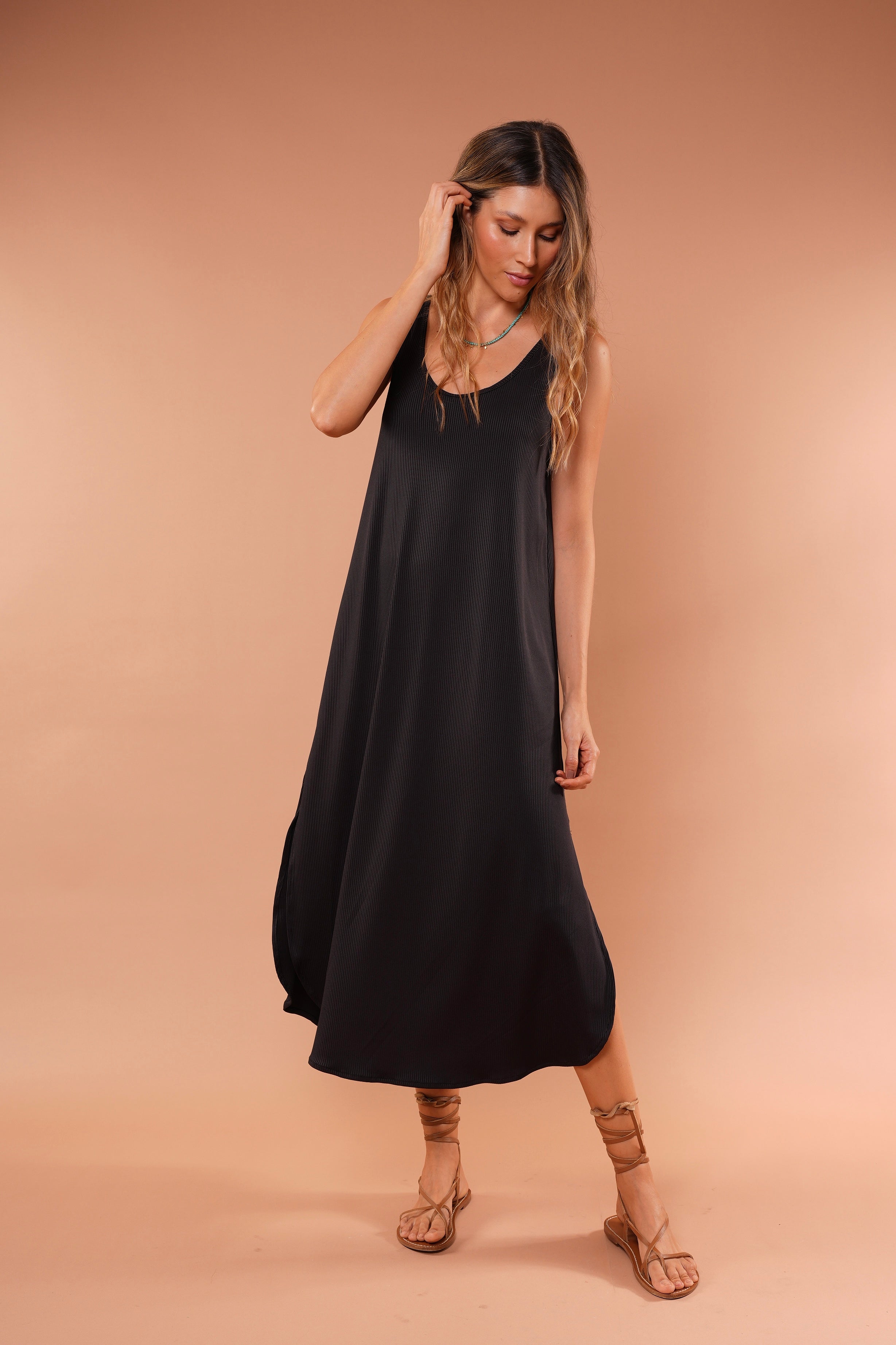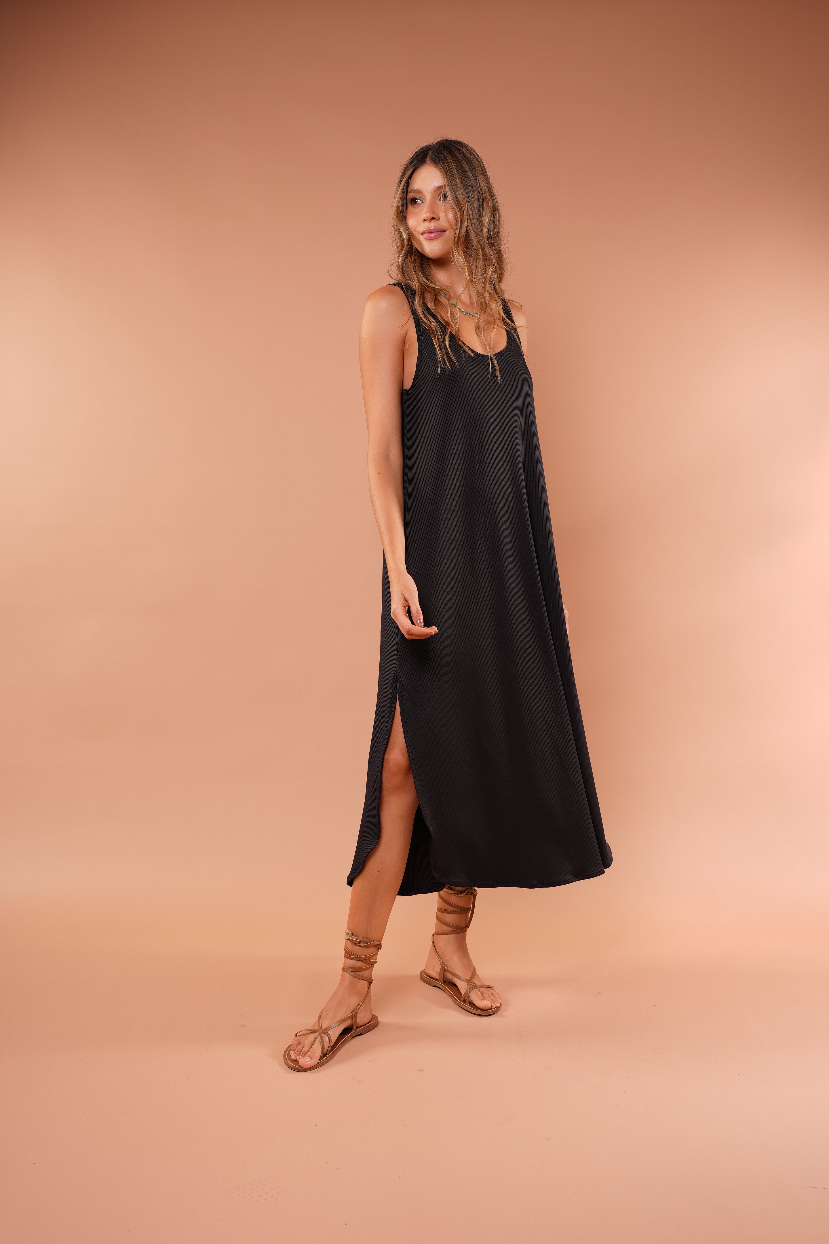 Vestido cafe largo básico, en tela Rib con elongación, manga sisa y abertura al costado de la falda, fresco y cómodo.