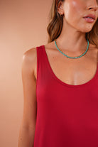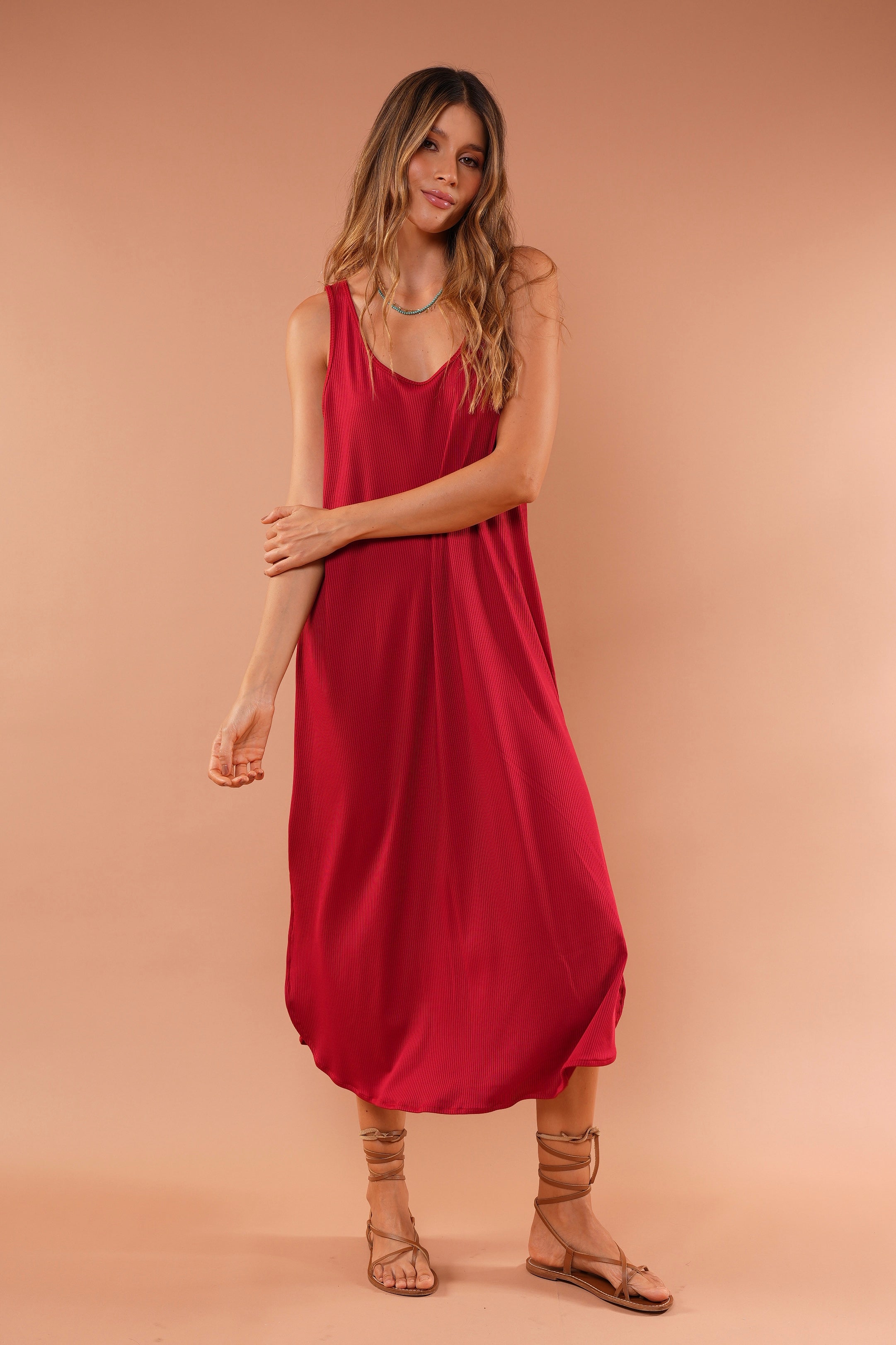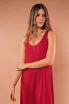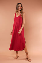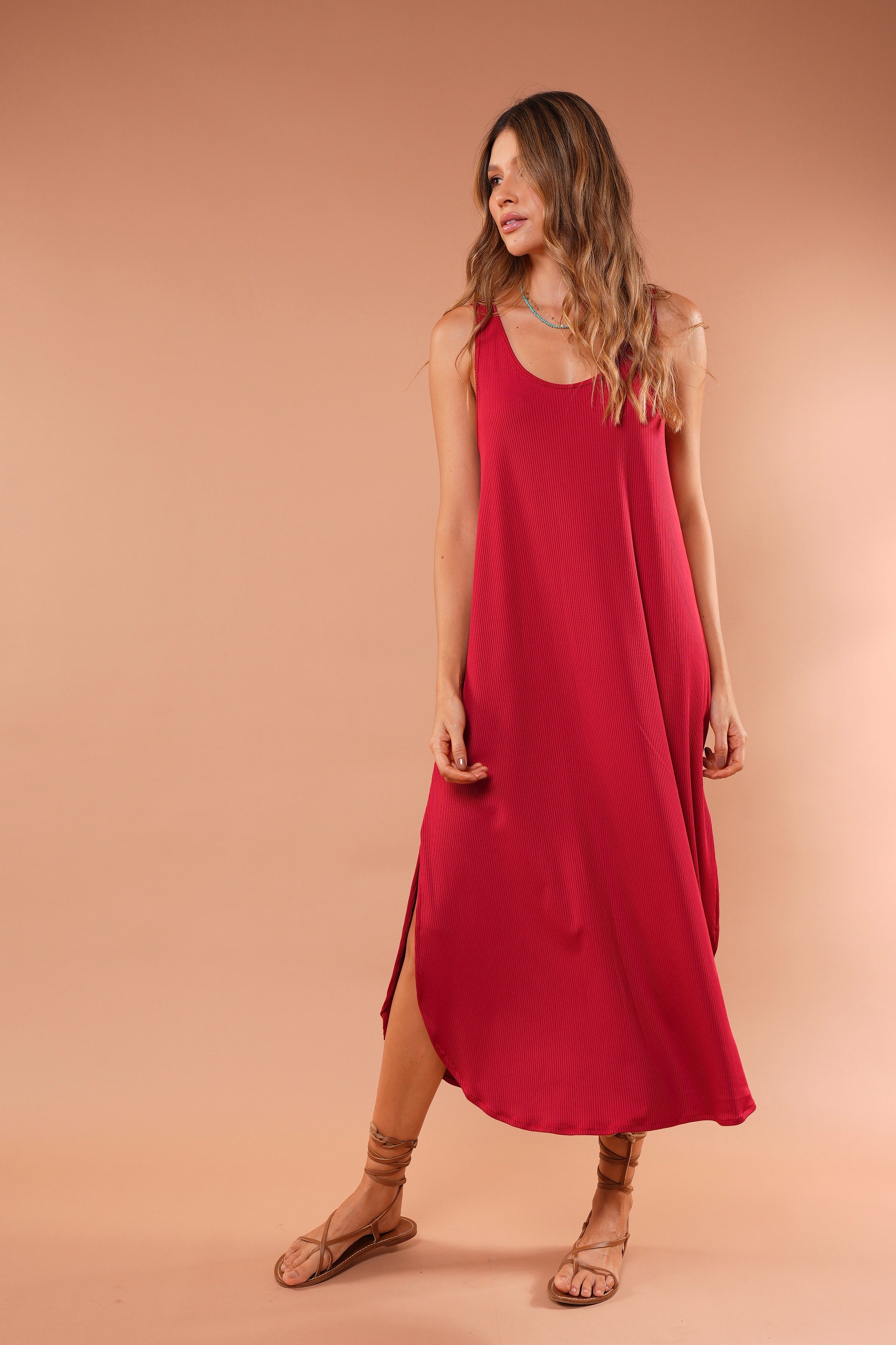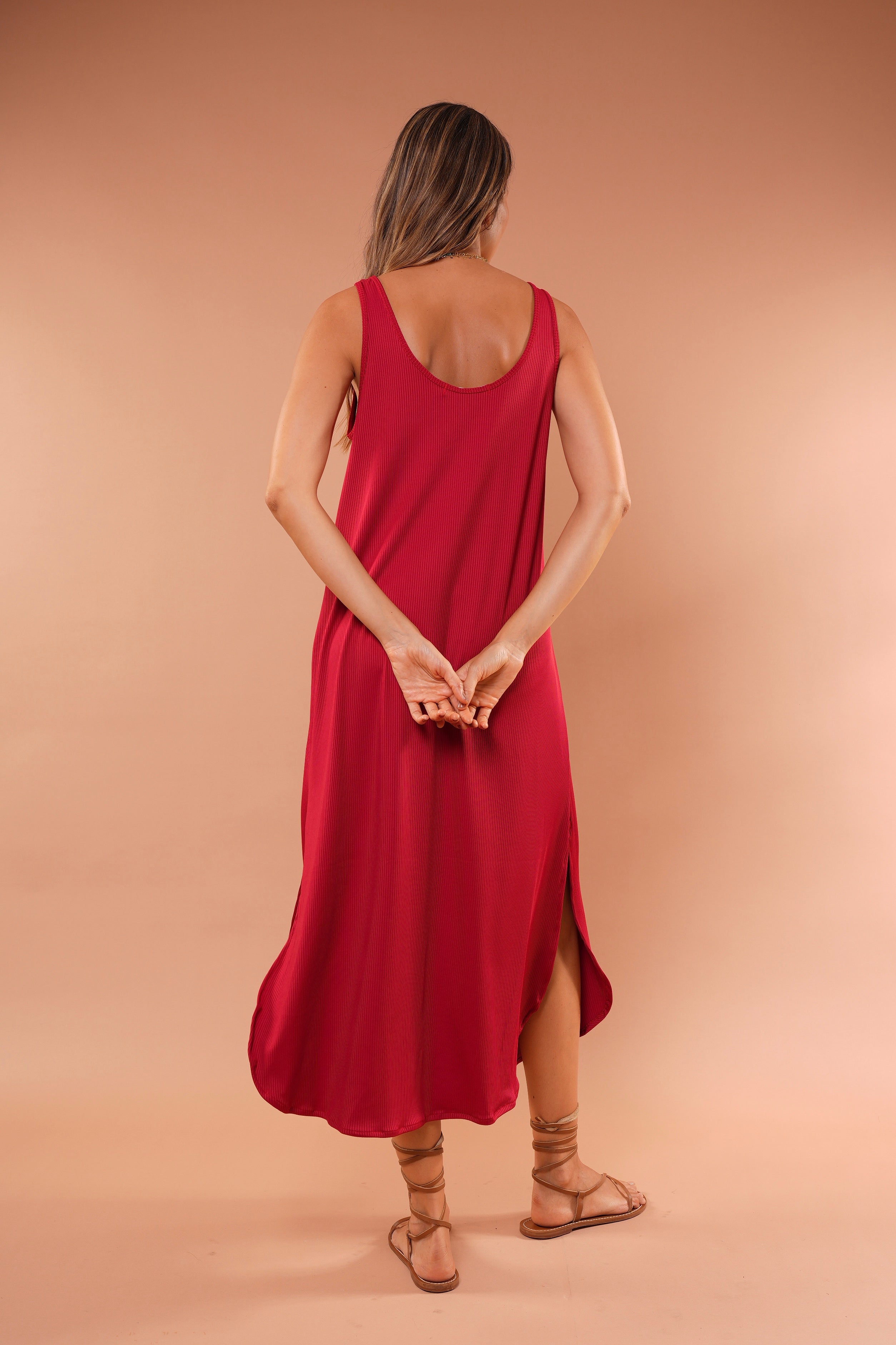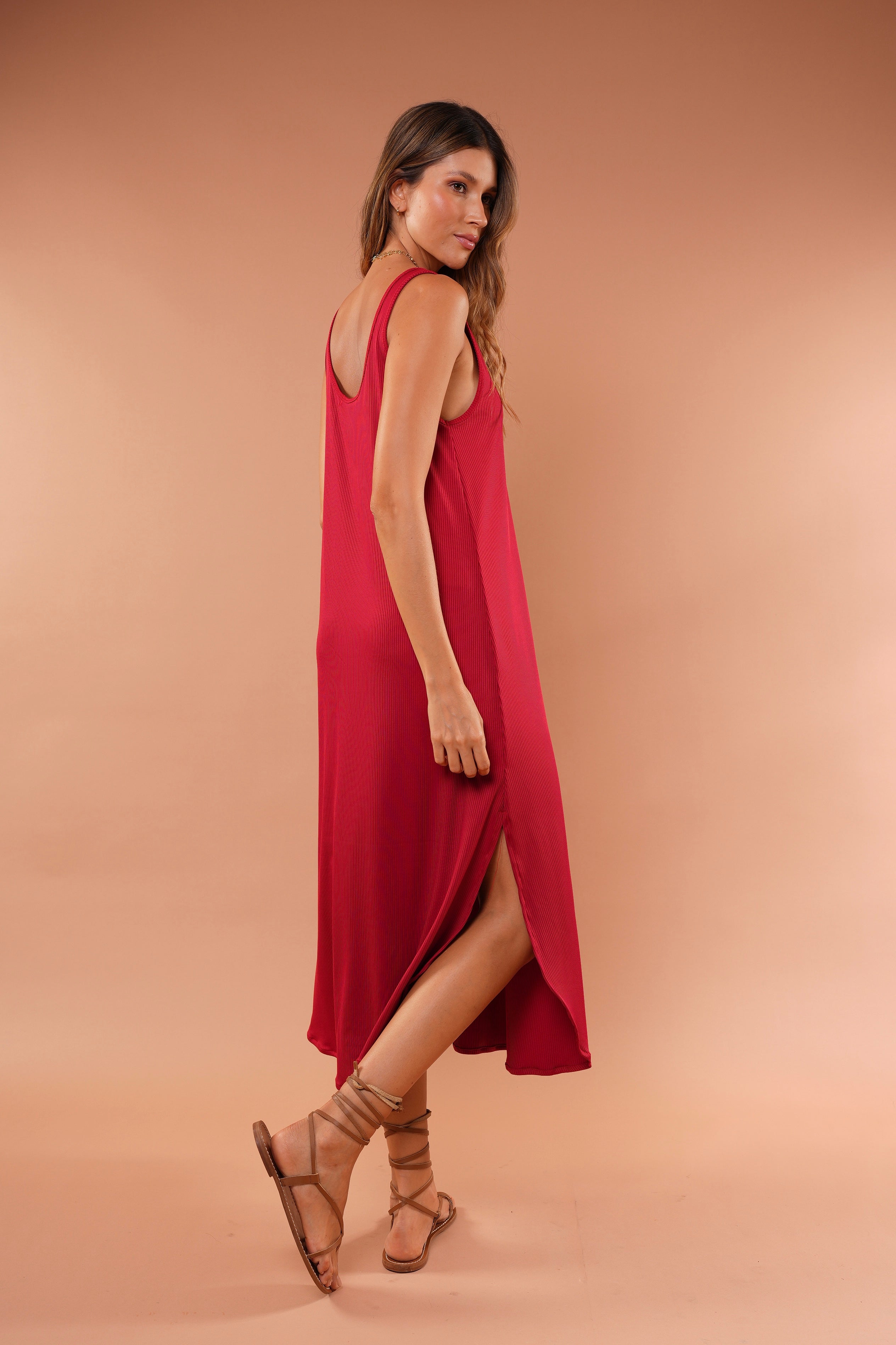 Vestido rojo largo básico, en tela Rib con elongación, manga sisa y abertura al costado de la falda, fresco y cómodo.
