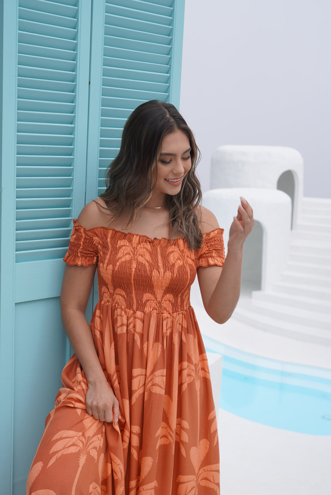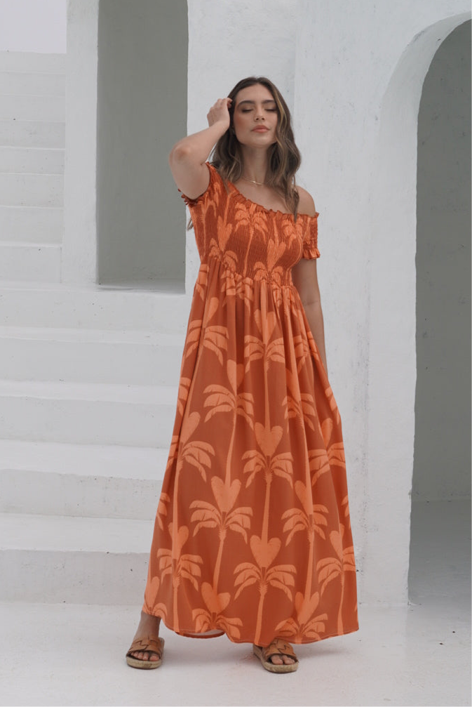 Vestido naranja largo con estampado de palmas en tela rayón, escote bandeja con elástico y bolsillos.