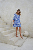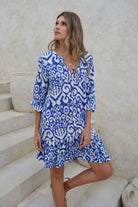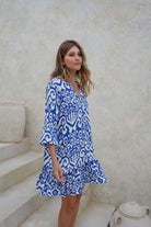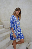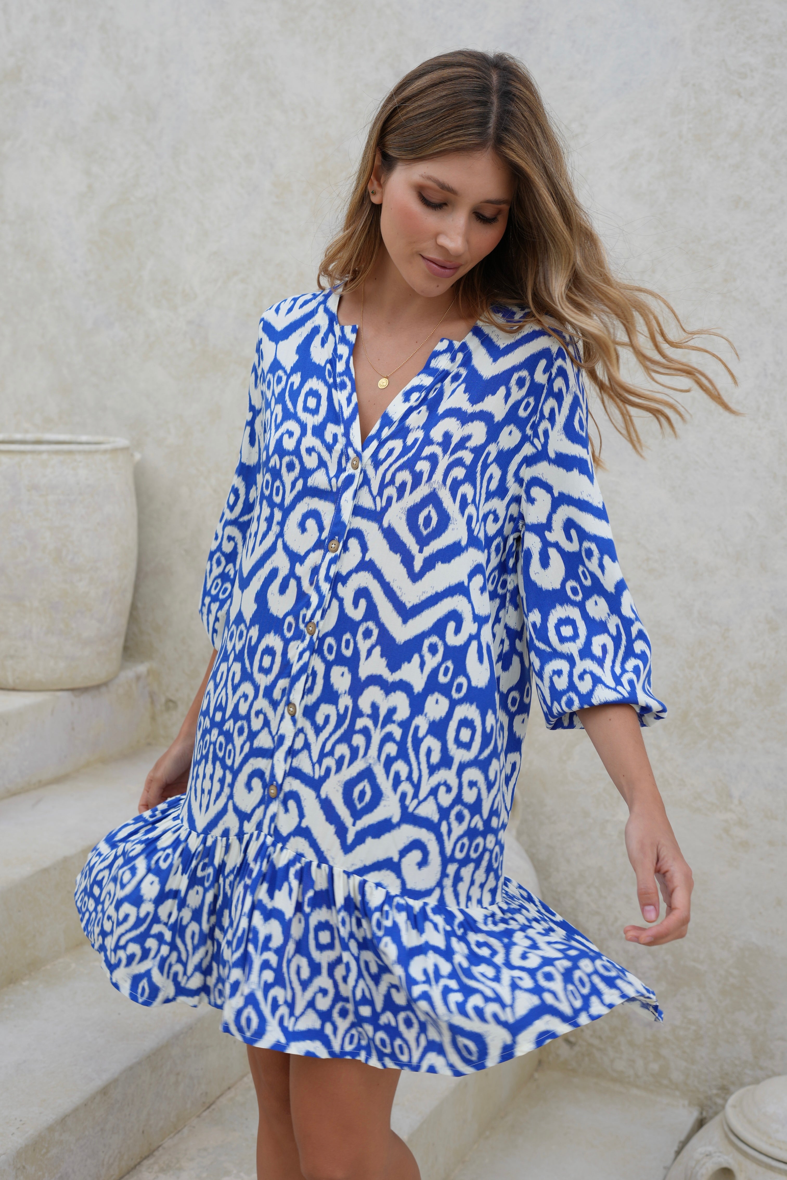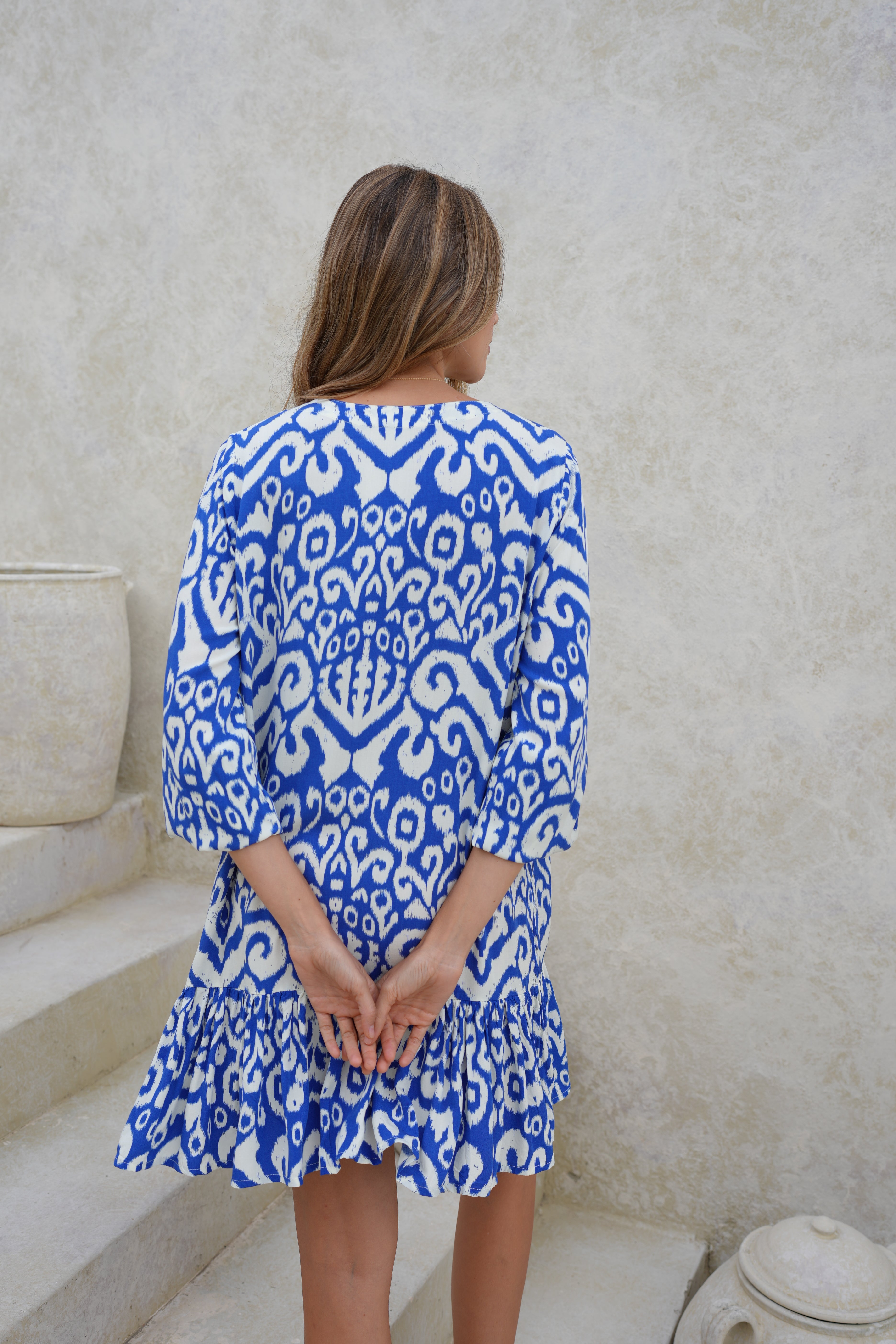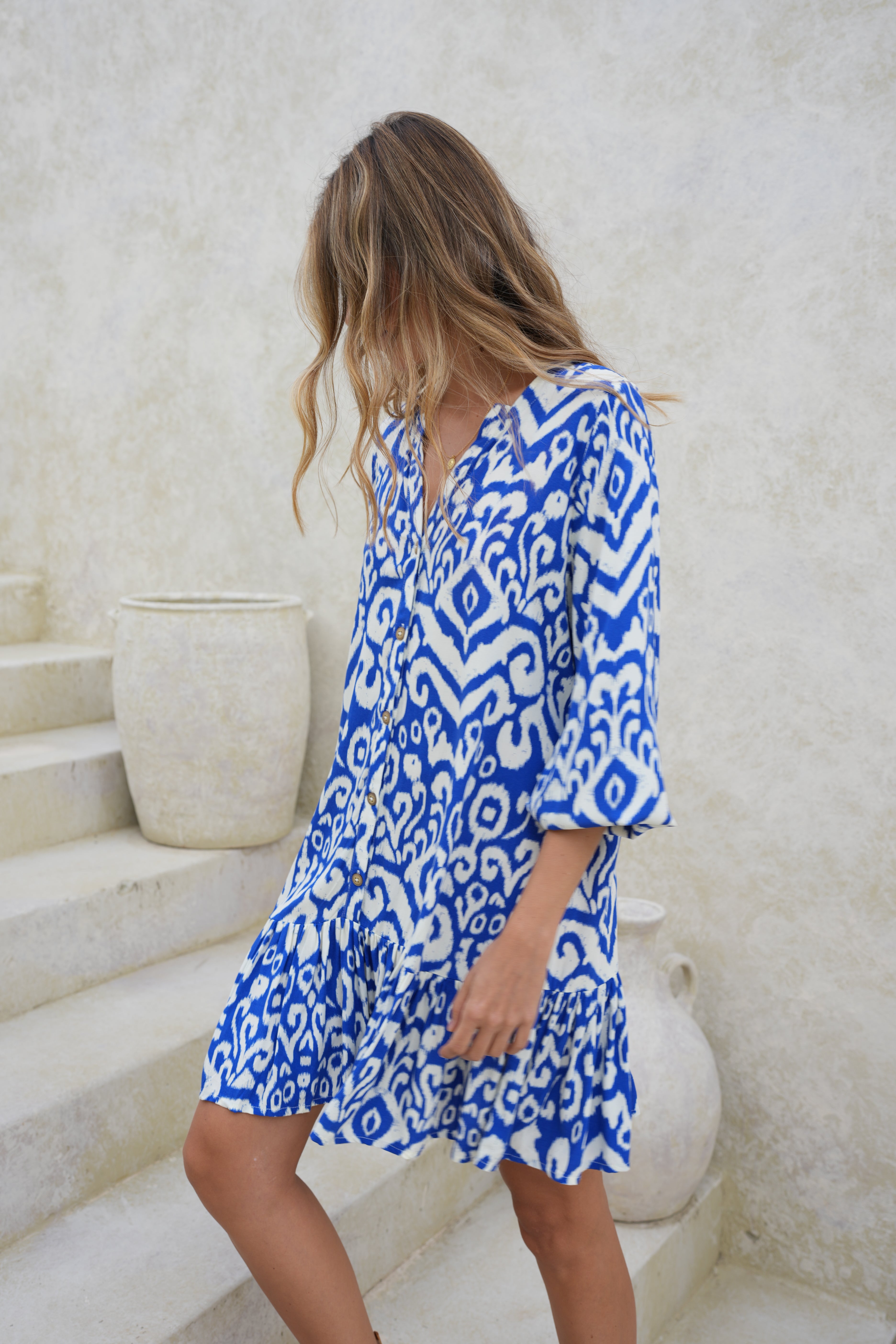 Vestido azul rey y blanco con estampado de arabesco, corto en tela rayón, es ligero y fresco, con elástico en la manga para ajustar su altura y botones funcionales