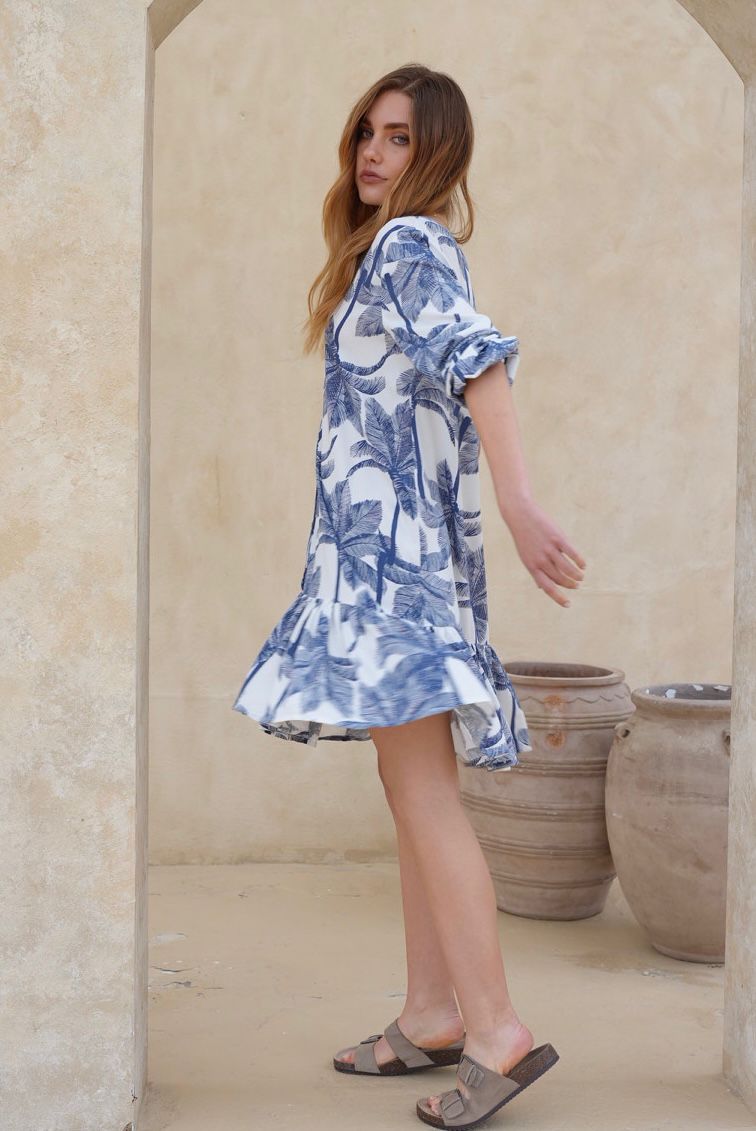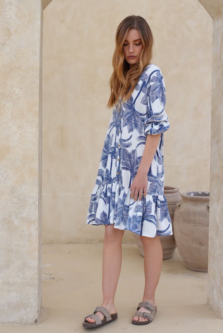 Vestido azul y blanco con estampado de palmas, corto en tela rayón, es ligero y fresco, con elástico en la manga para ajustar su altura y botones funcionales