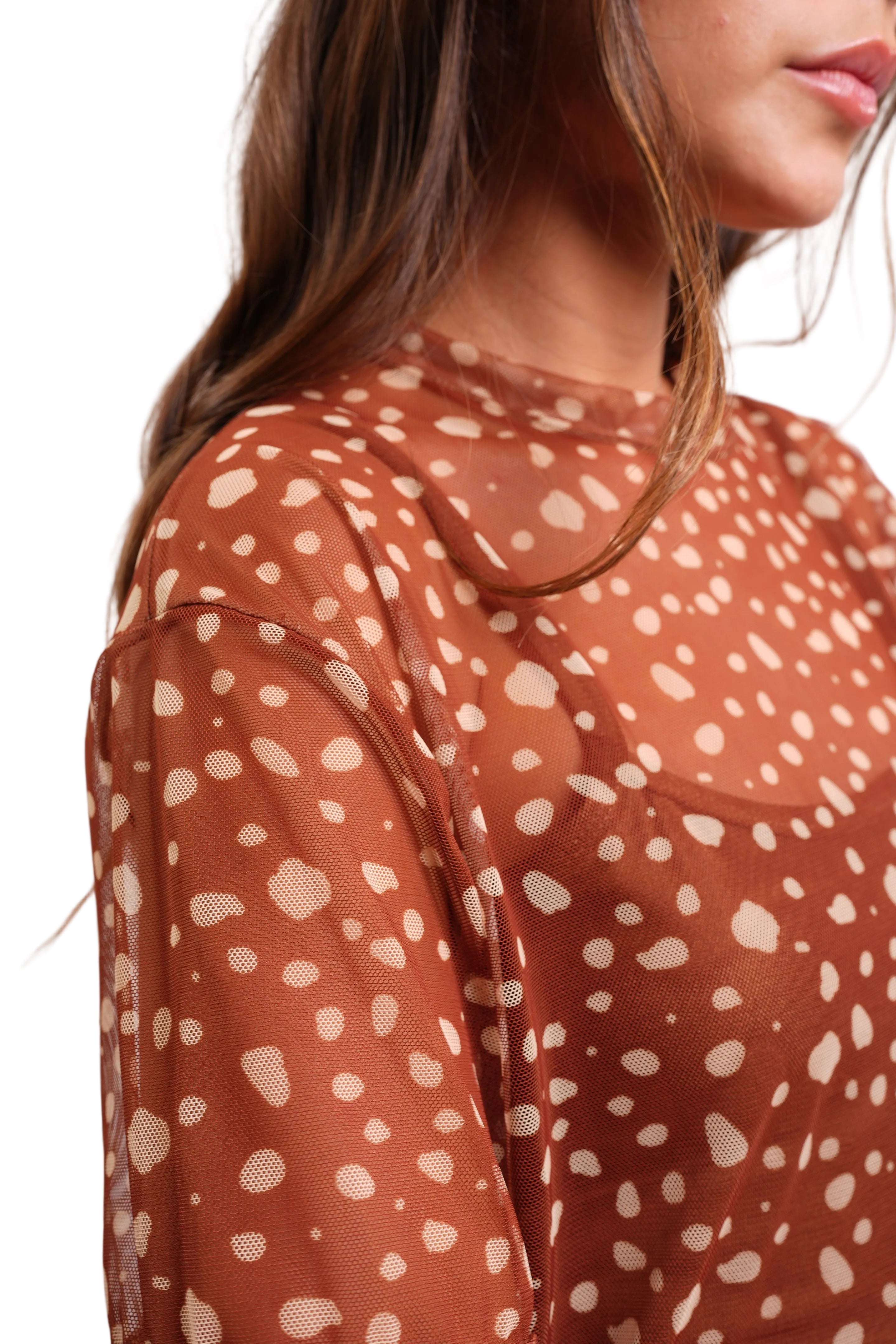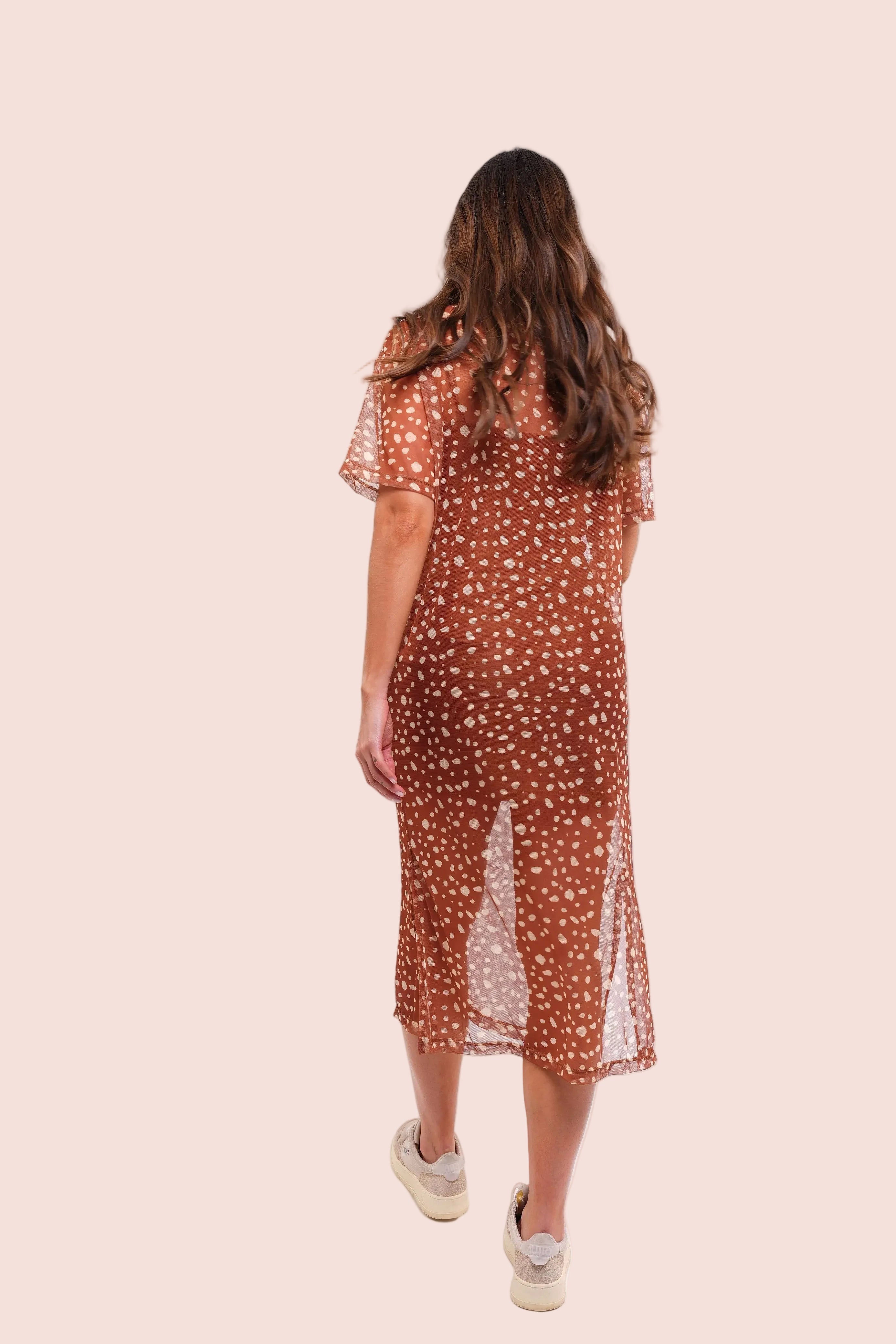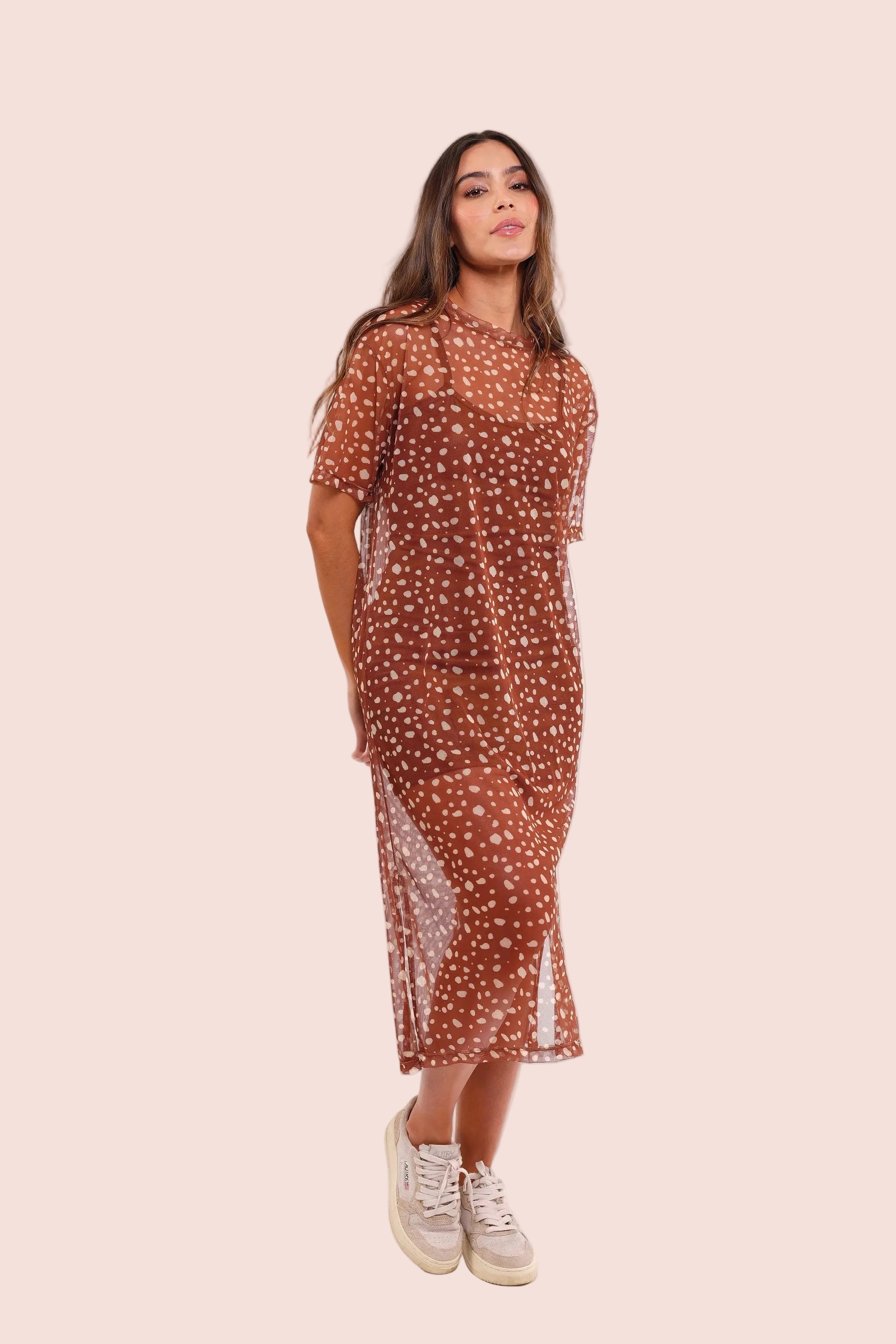 Vestido en mesh semitransparente con estampado bambi en tendencia, de silueta recta y ligera. Tiene mangas cortas y aberturas laterales que aportan movimiento y frescura.