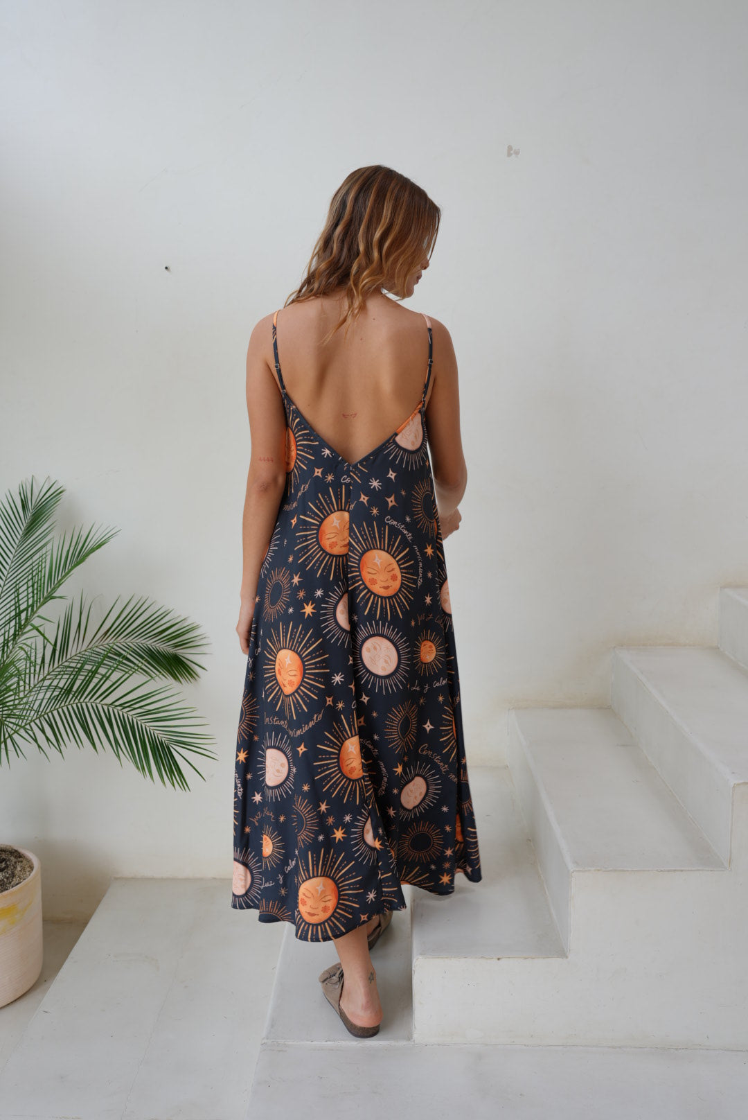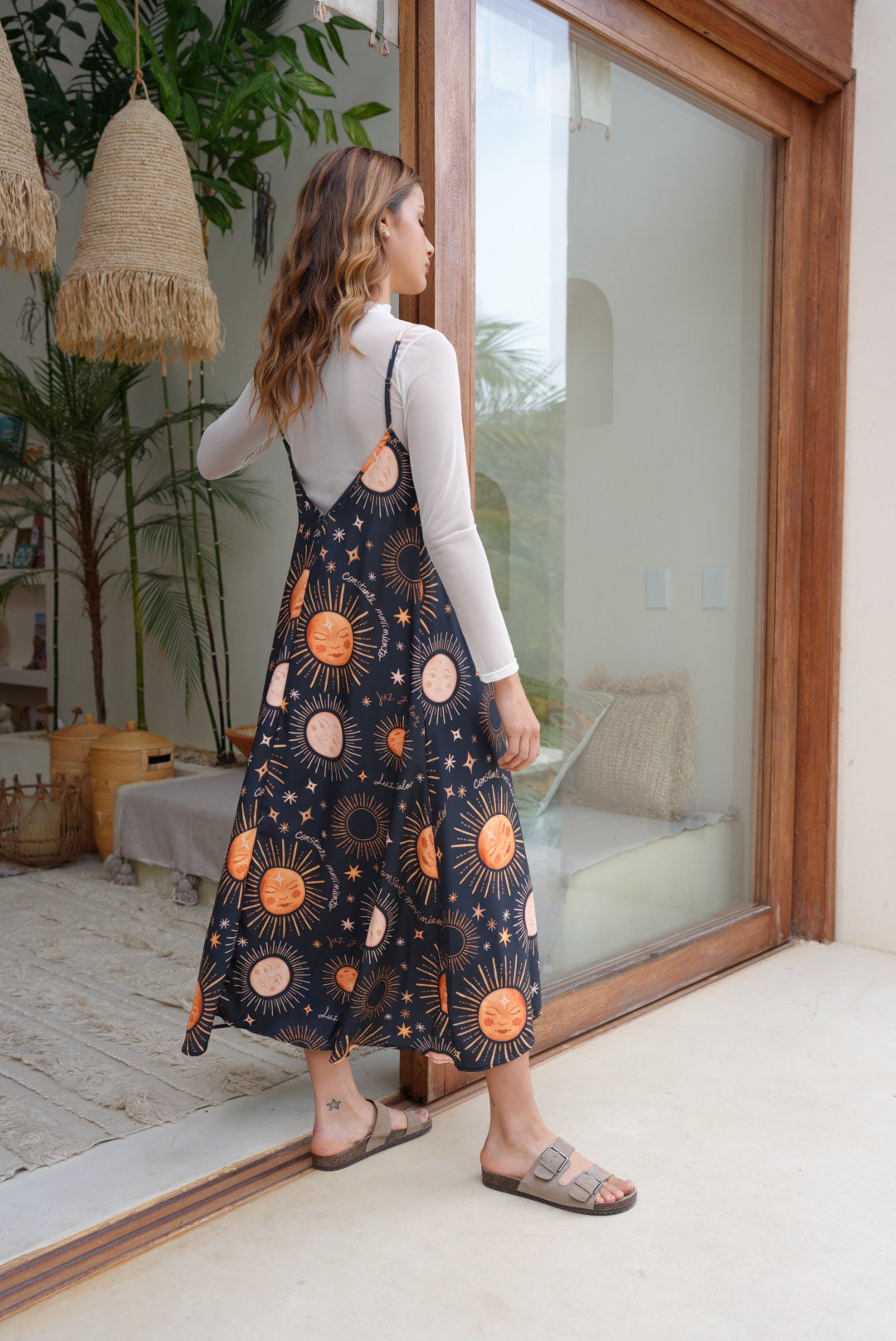 Vestido negro largo con estampado de soles, en tela rayón, de tirantes sisa con escote en la espalda, fresco y cómodo.