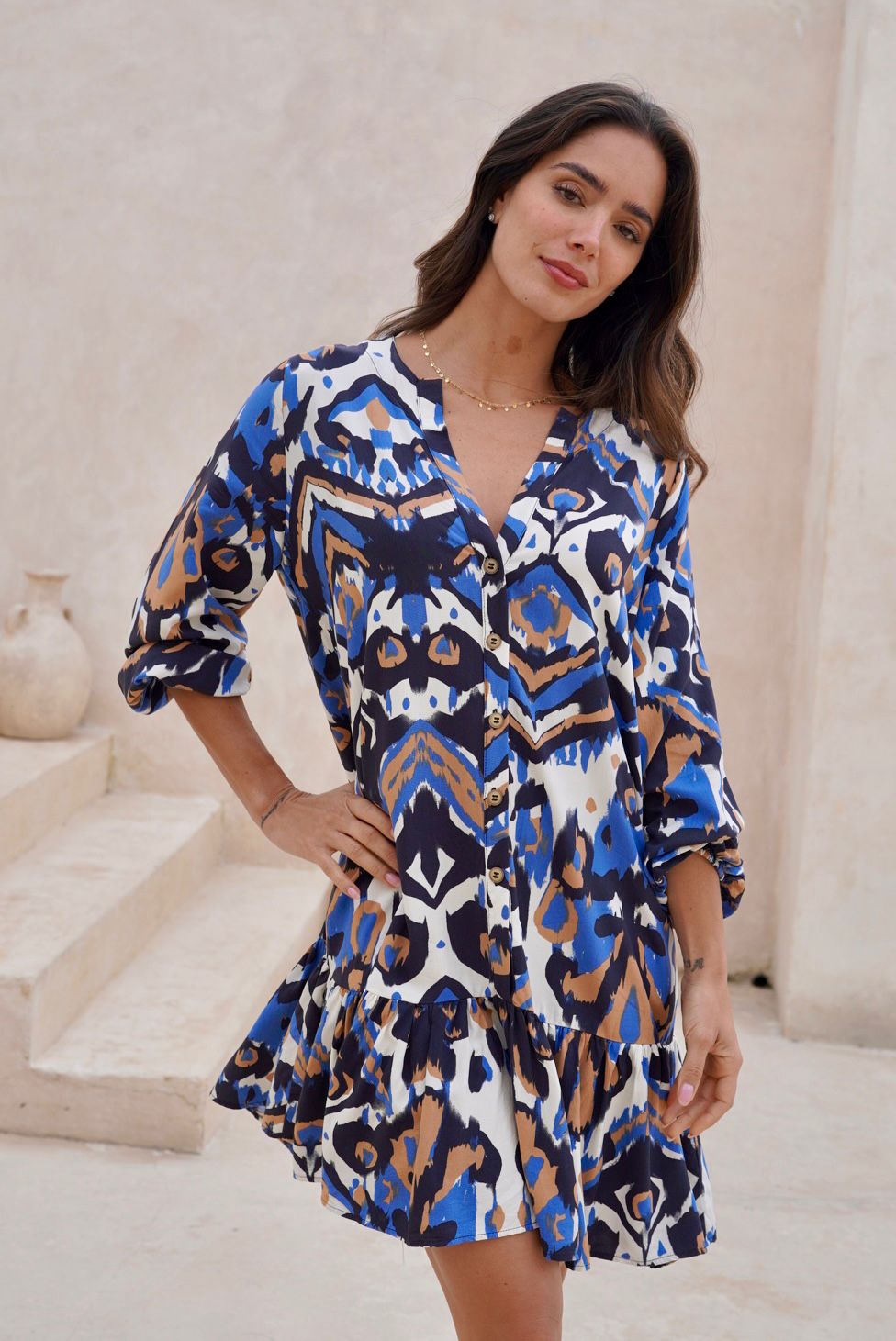 Vestido de colores, corto en tela rayón, es ligero y fresco, con elástico en la manga para ajustar su altura y botones funcionales