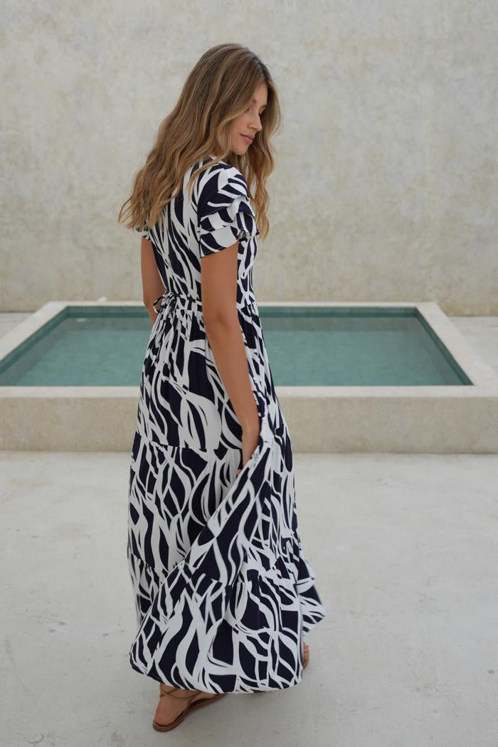 Vestido azul oscuro con blanco largo con estampado de rayas en tela rayón, bolsillos y ajuste en la cintura, manga con bolero y escote en V.