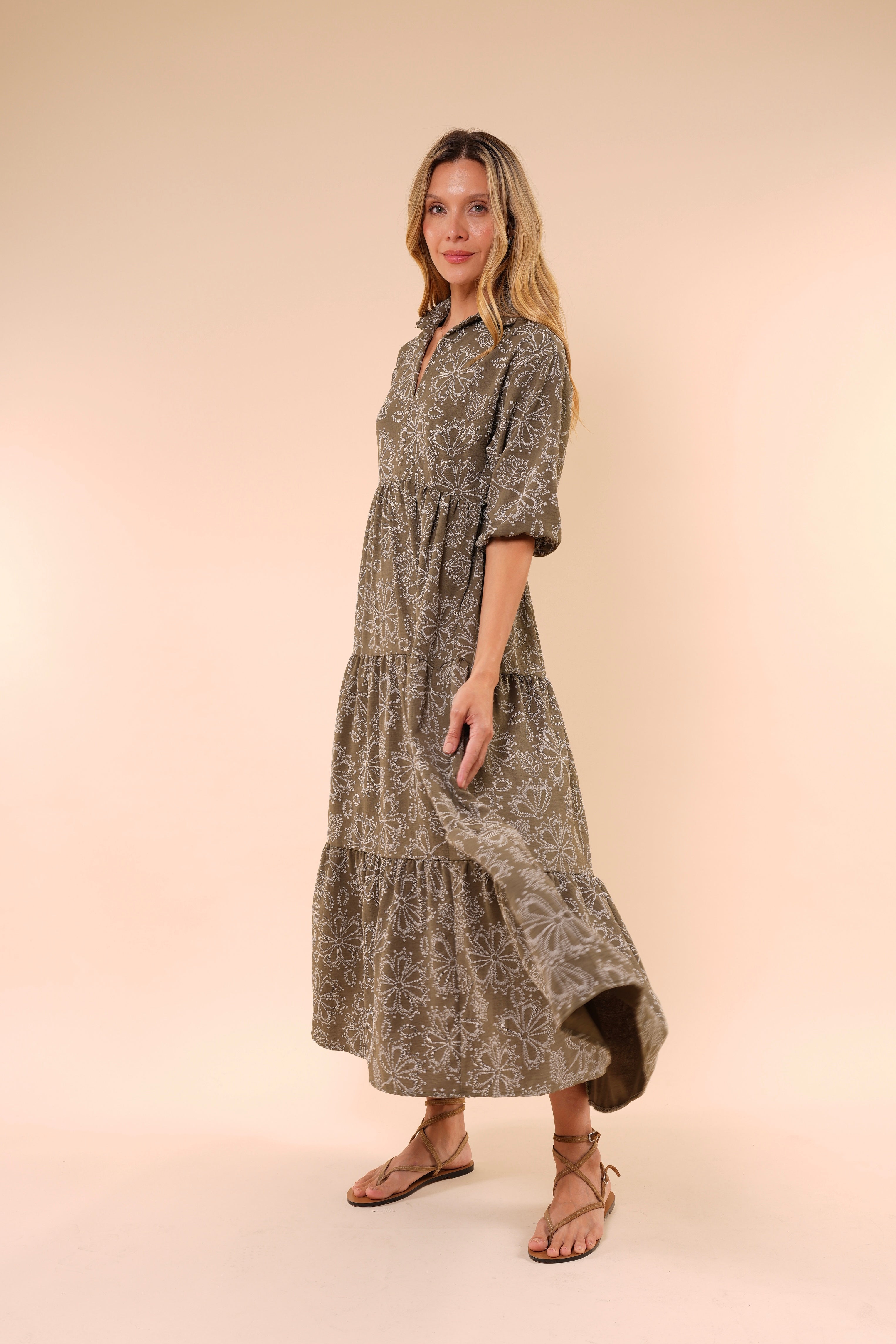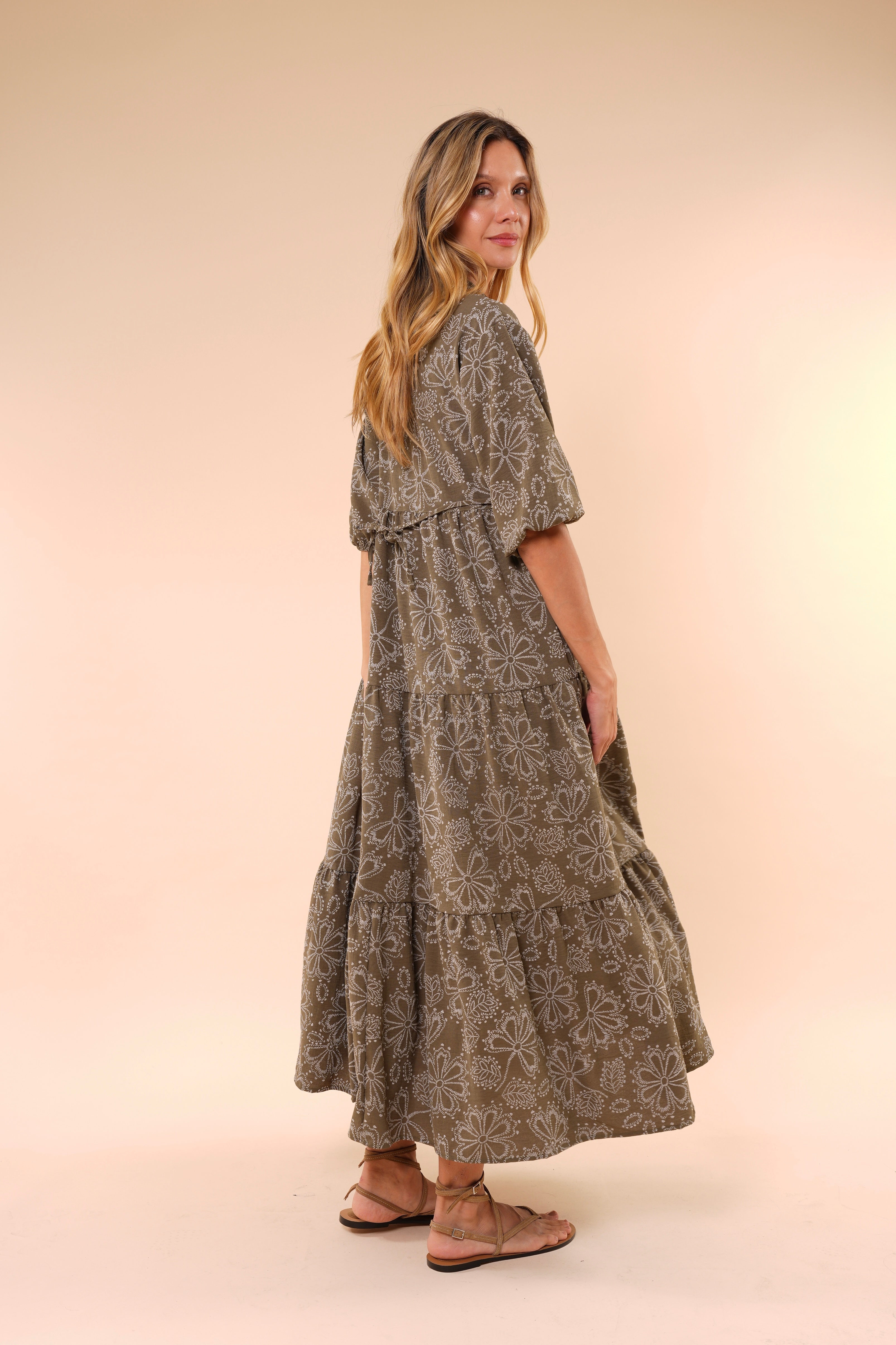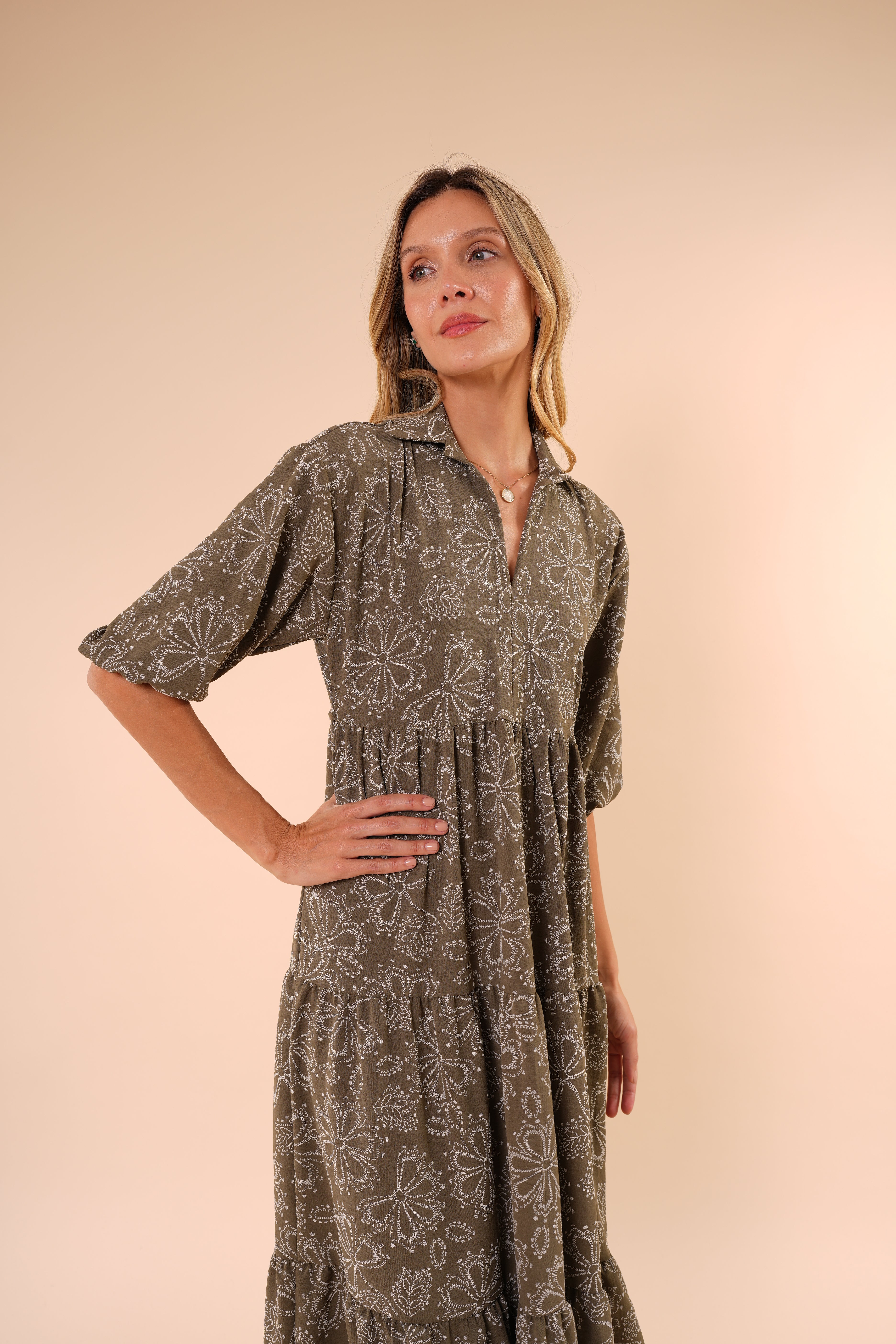 Su silueta amplia y fluida estiliza sin ajustar, mientras el escote en “V” y las mangas con volumen aportan un toque femenino y sofisticado. El estampado floral en tonos neutros lo convierte en una opción atemporal y fácil de combinar.