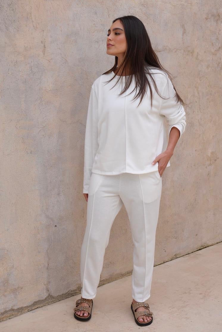 Buzo en tela burda liviana color marfil, diseñado para ofrecer frescura y comodidad. Su textura suave lo convierte en un básico ideal para el día a día, mientras que la costura central y su fit relajado aportan un aire moderno y minimalista.
