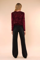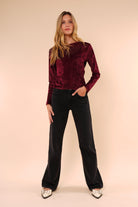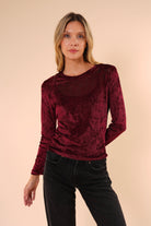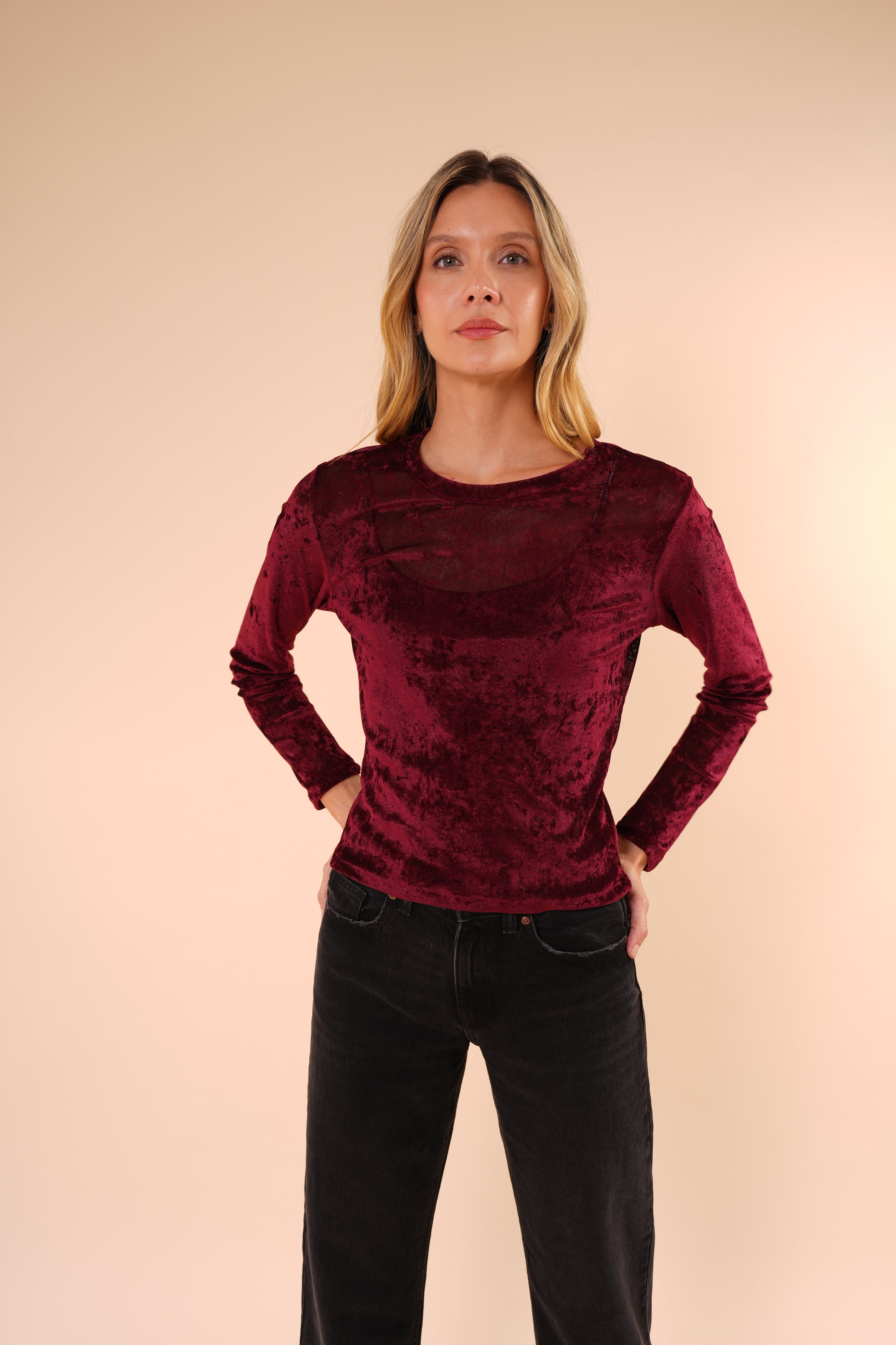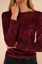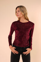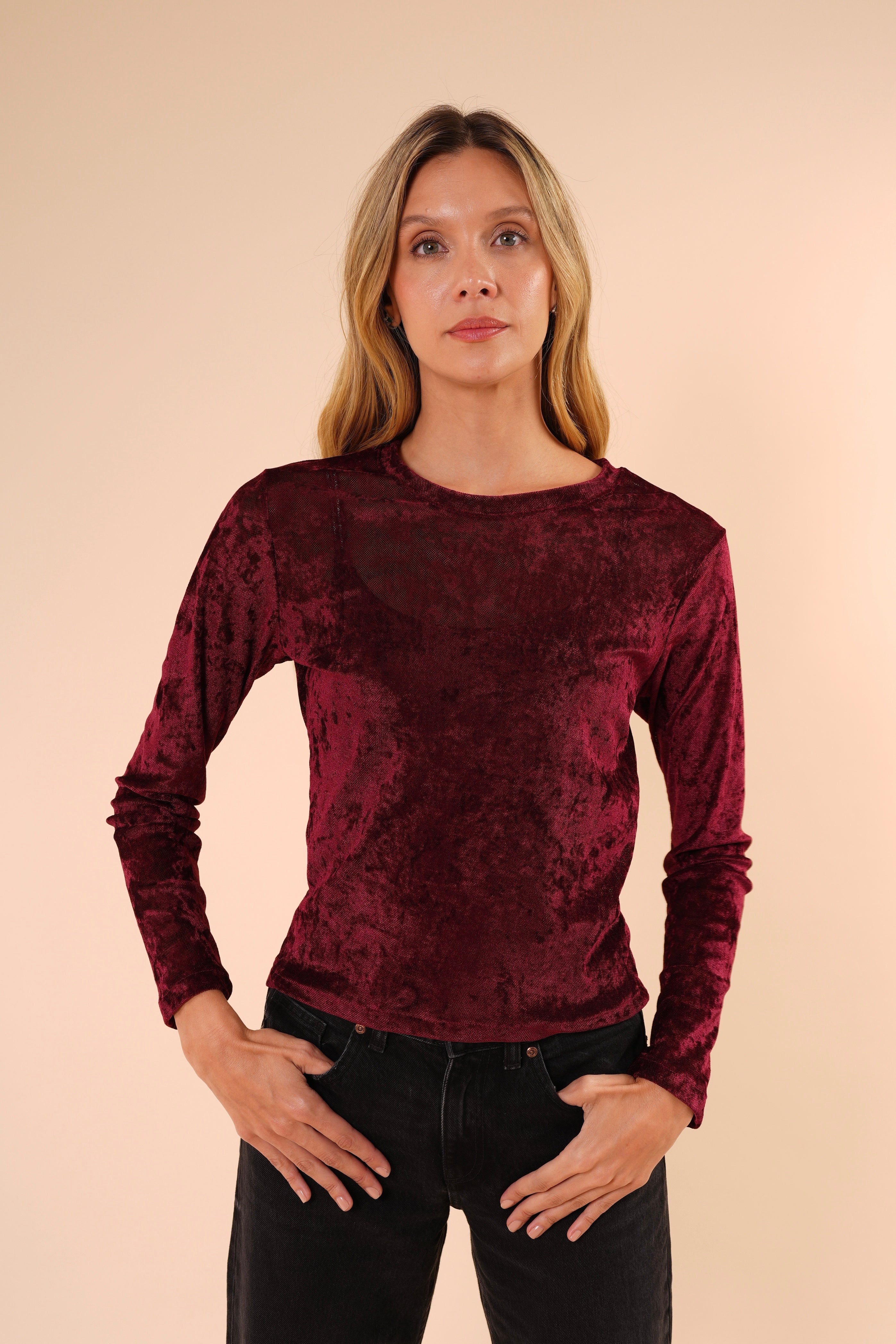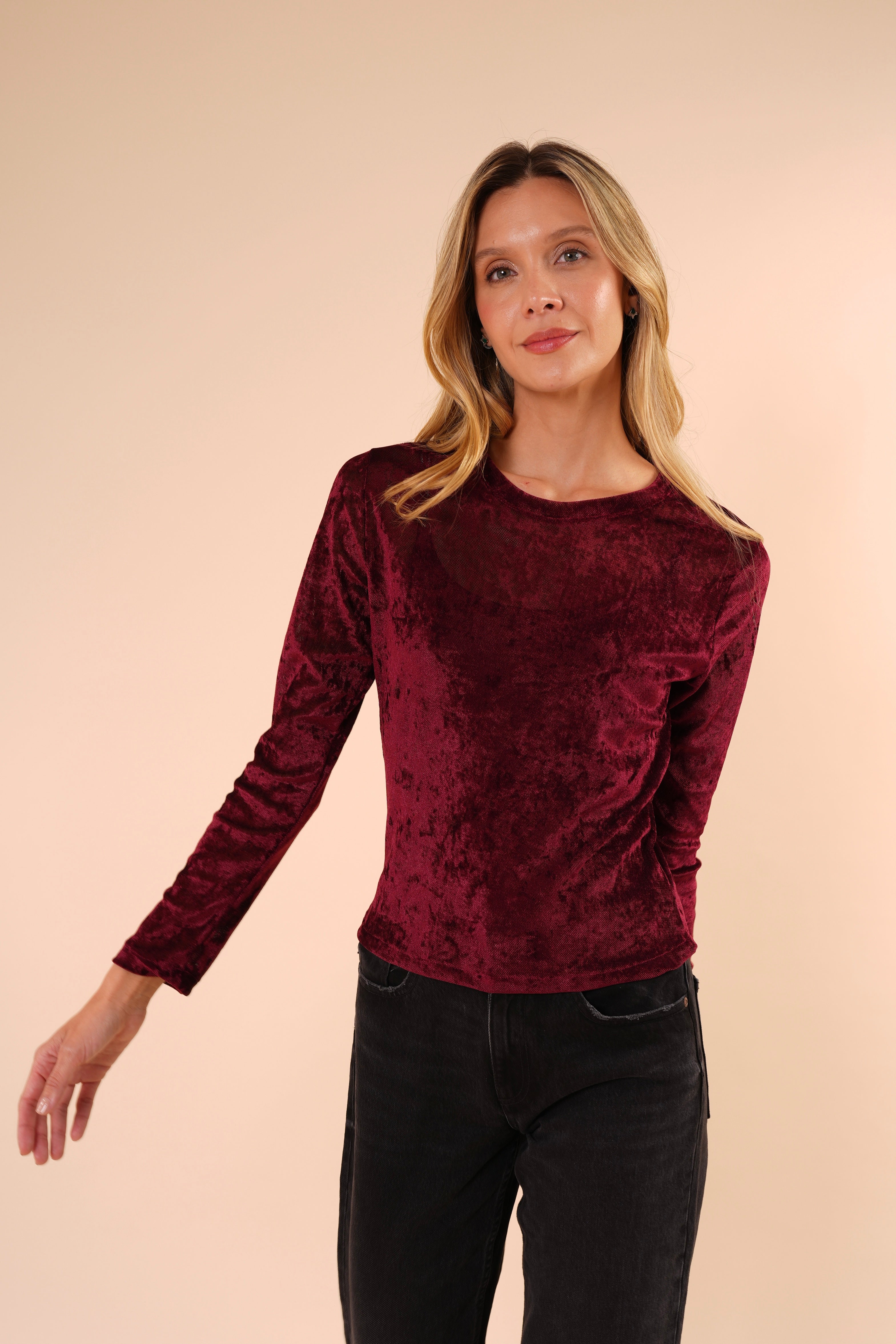 Blusa de manga larga confeccionada en terciopelo suave, con una textura delicada y un acabado elegante que aporta sofisticación sin perder comodidad. Su diseño de corte recto y cuello redondo la convierte en una prenda versátil, ideal para elevar looks cotidianos o complementar outfits más formales.