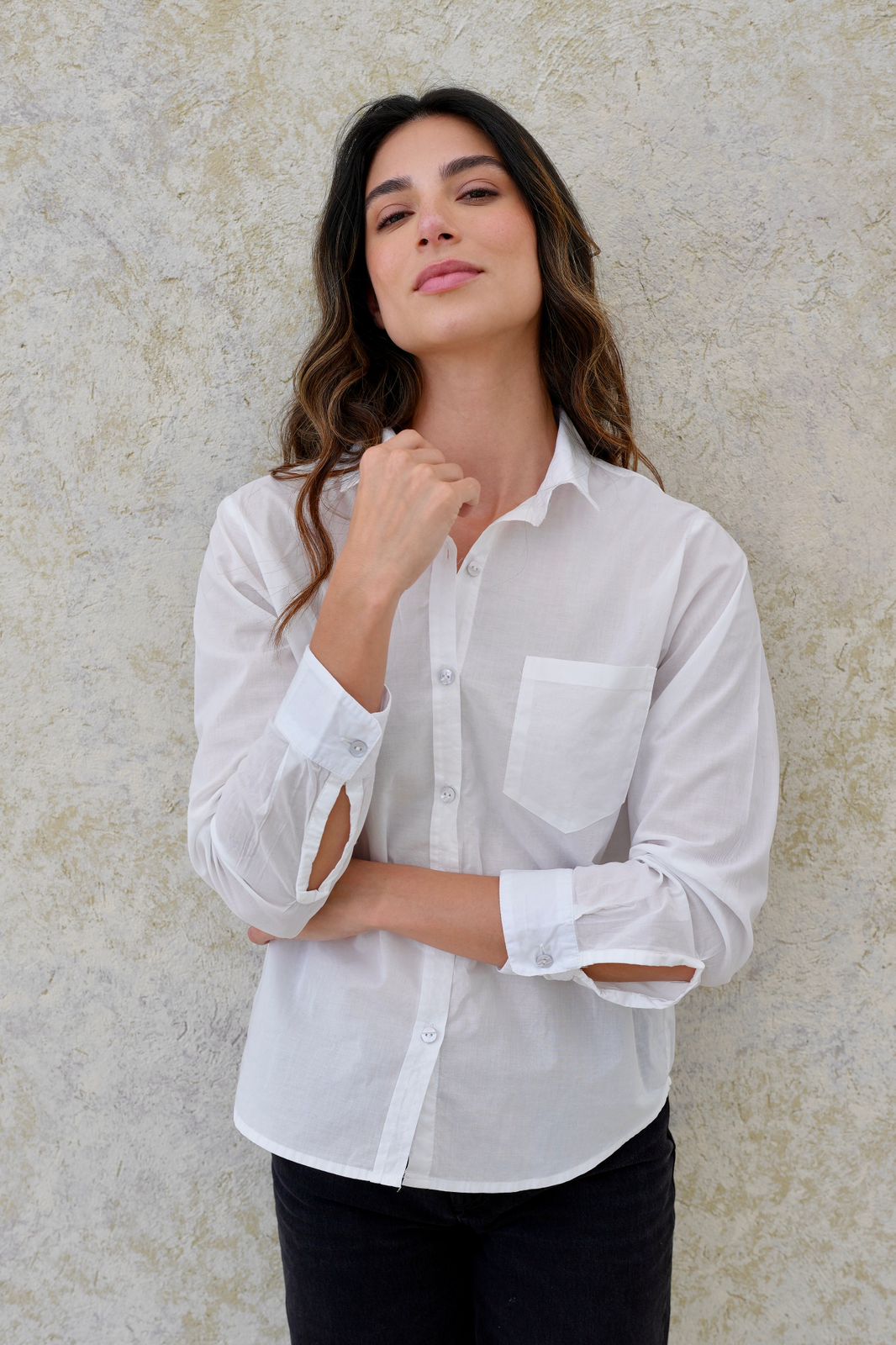 Camisa blanca de poliester, manga larga, botones funcionales, perfecta para cualquier ocasión.