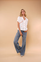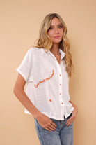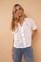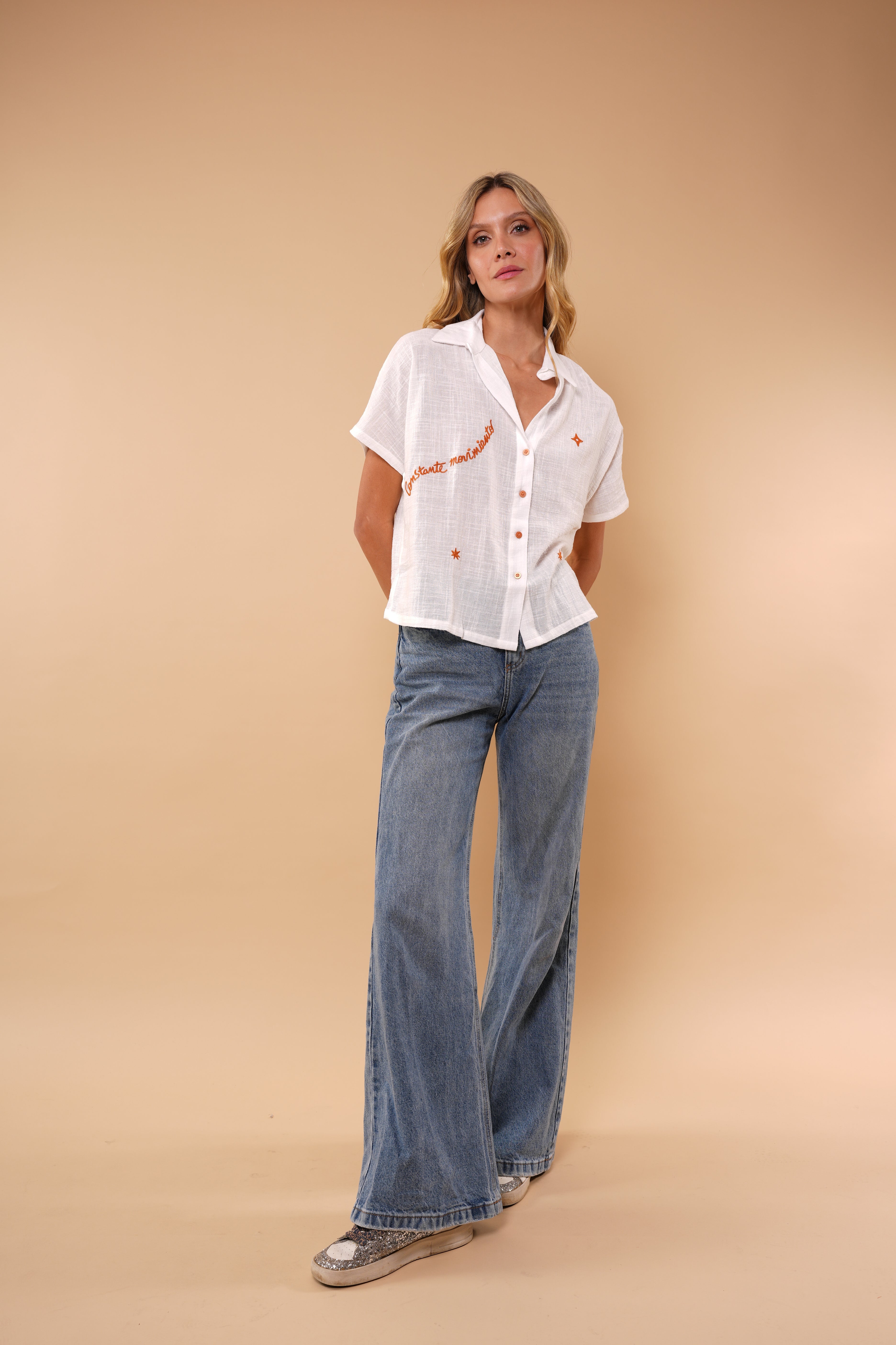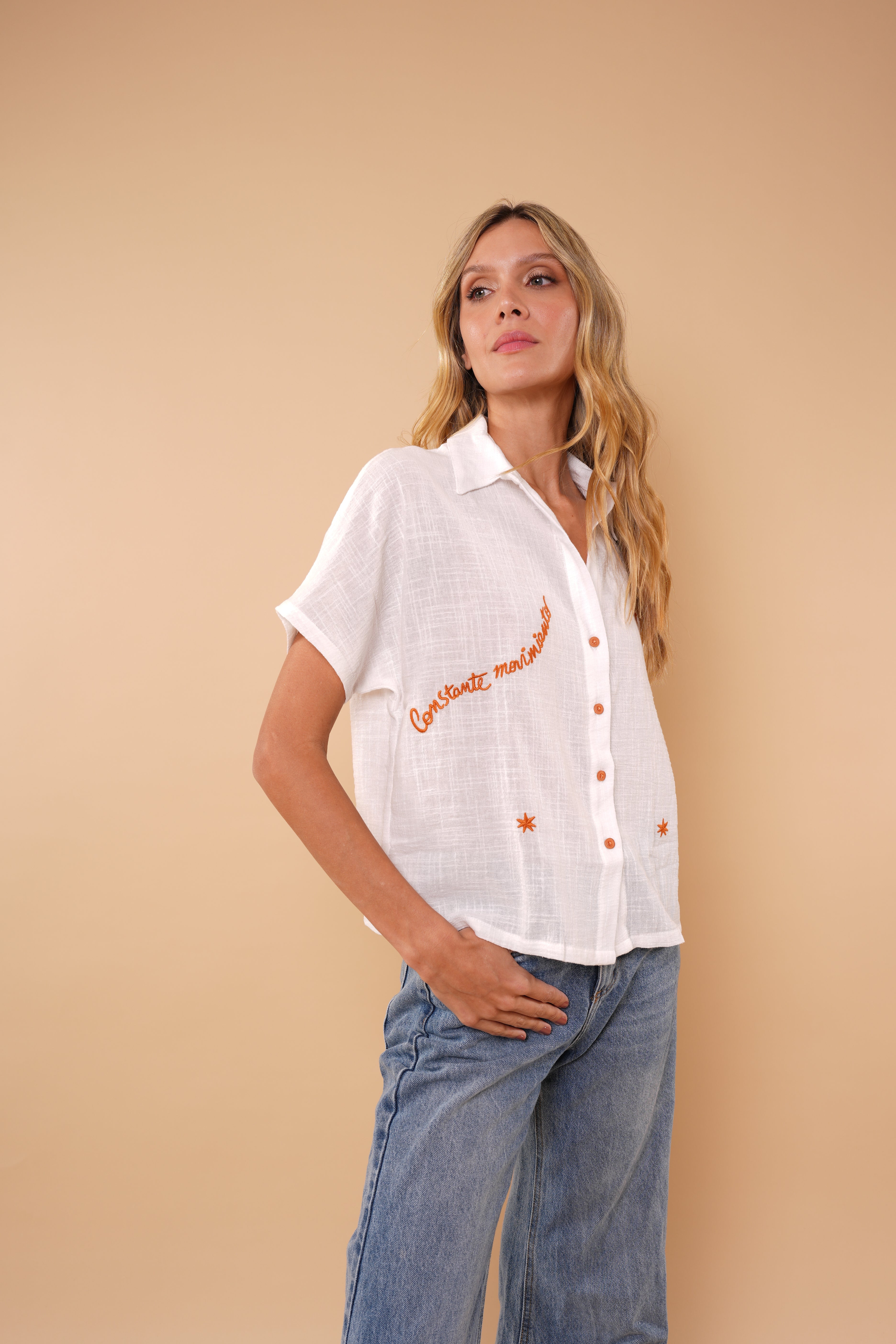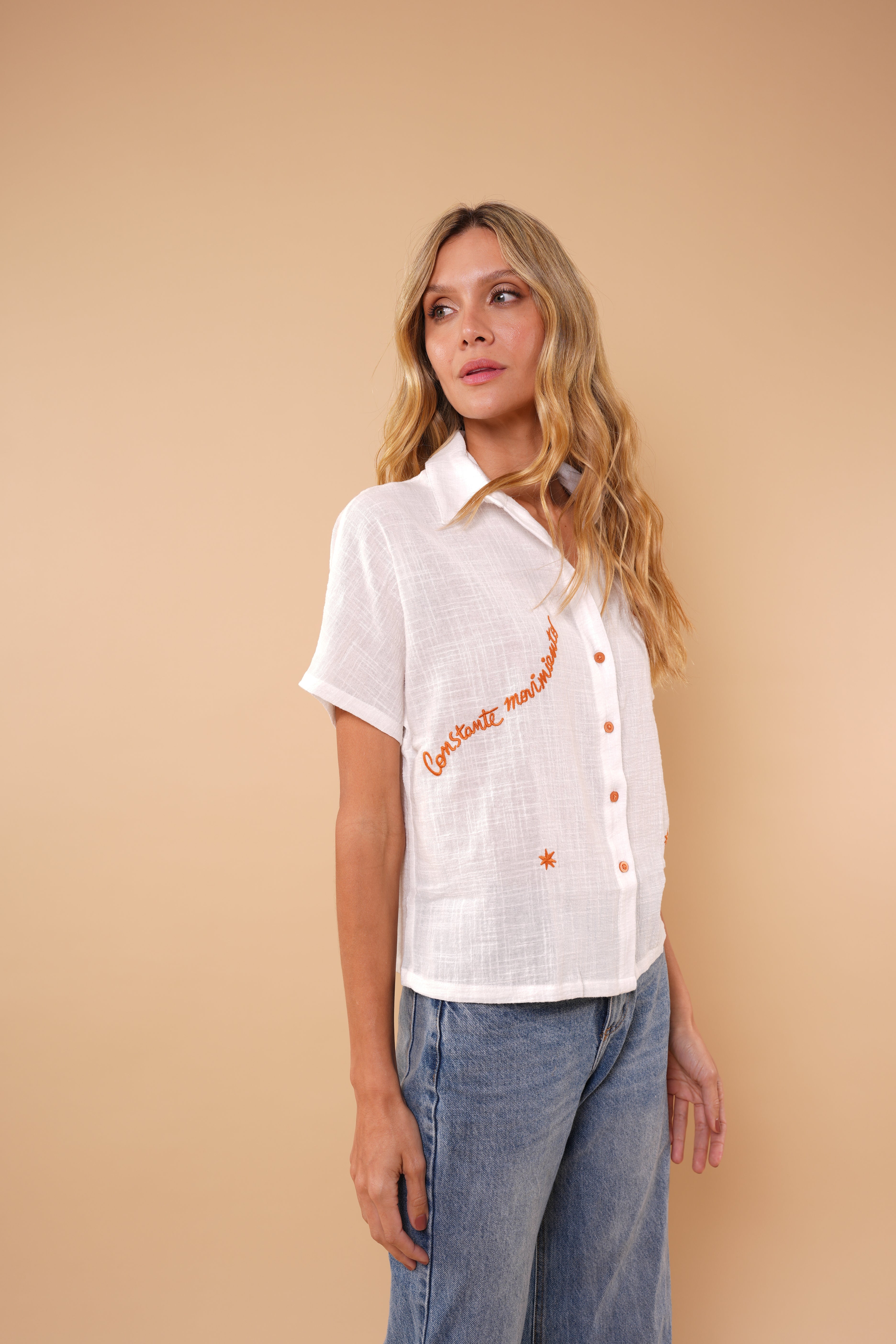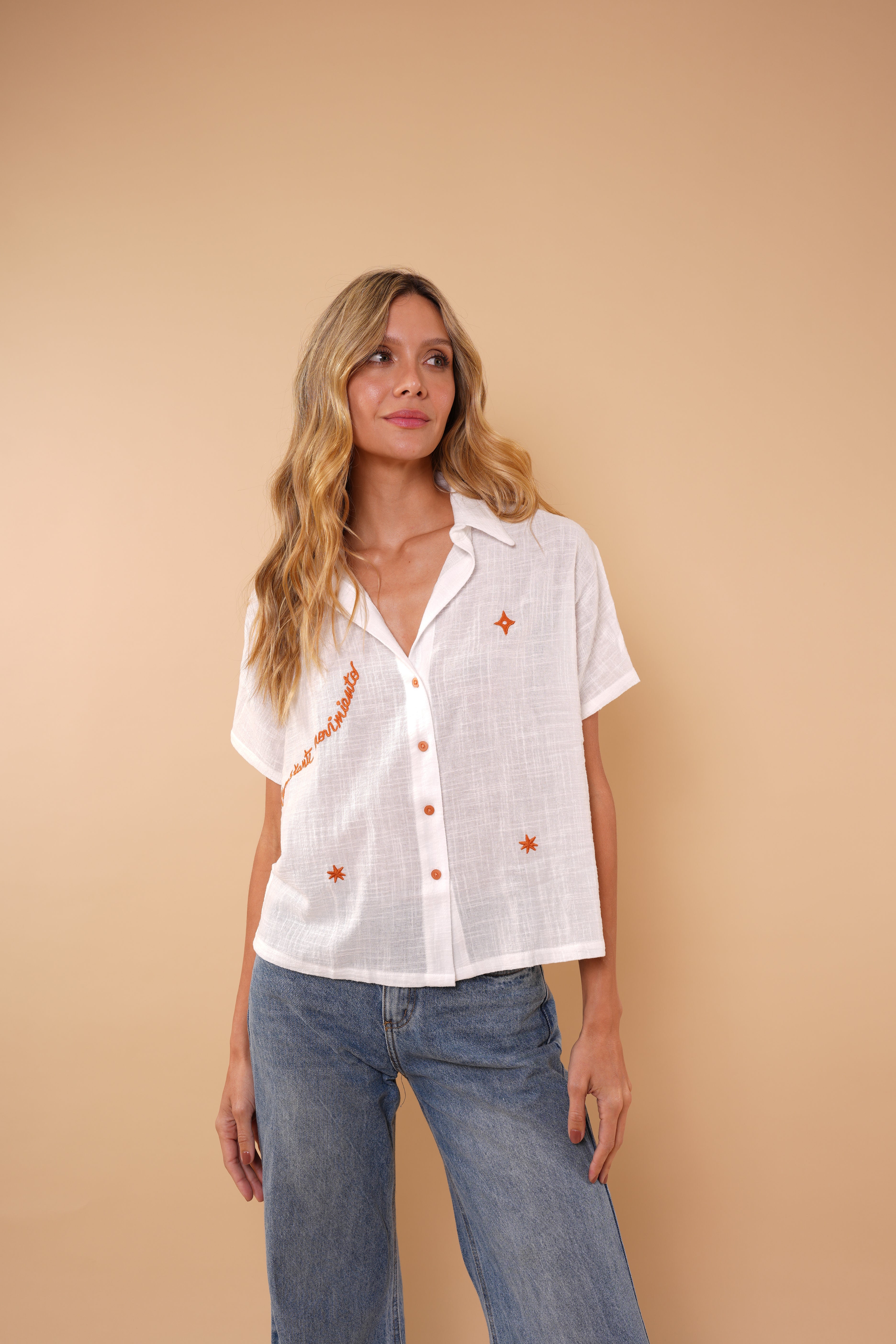 Camisa blanca con bordado naranja, manga corta en tela rayón, cuello y botones funcionales.