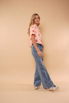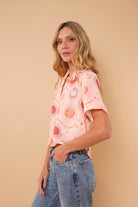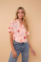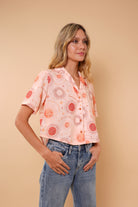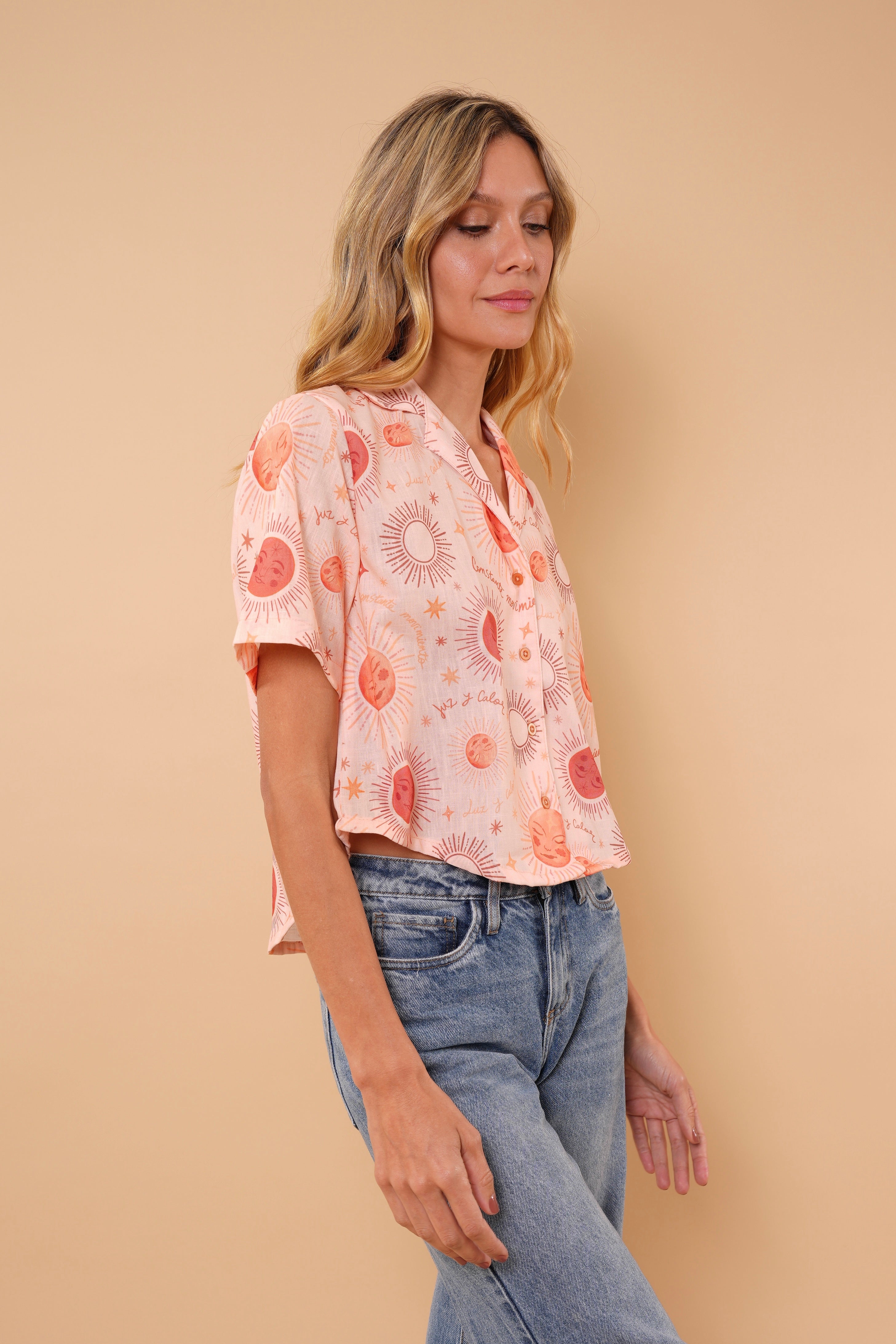 Camisa durazno con estampado de soles, manga corta en tela rayón, cuello y botones funcionales.
