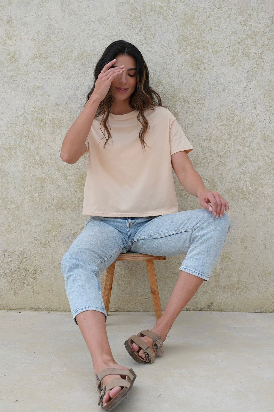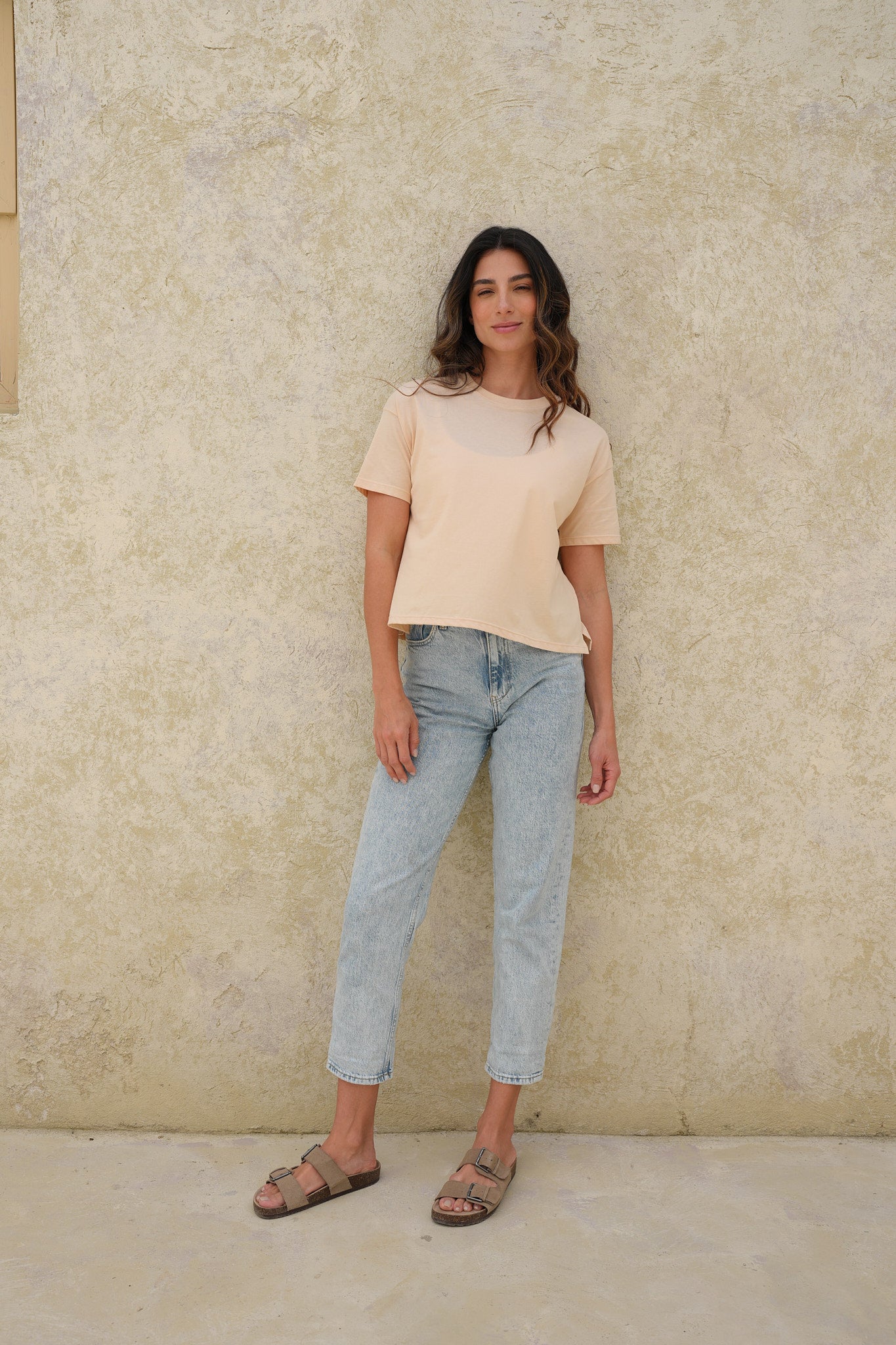 Camiseta beige básica de silueta relajada y manga corta, confeccionada en algodón Peruano para una sensación fresca y cómoda.
