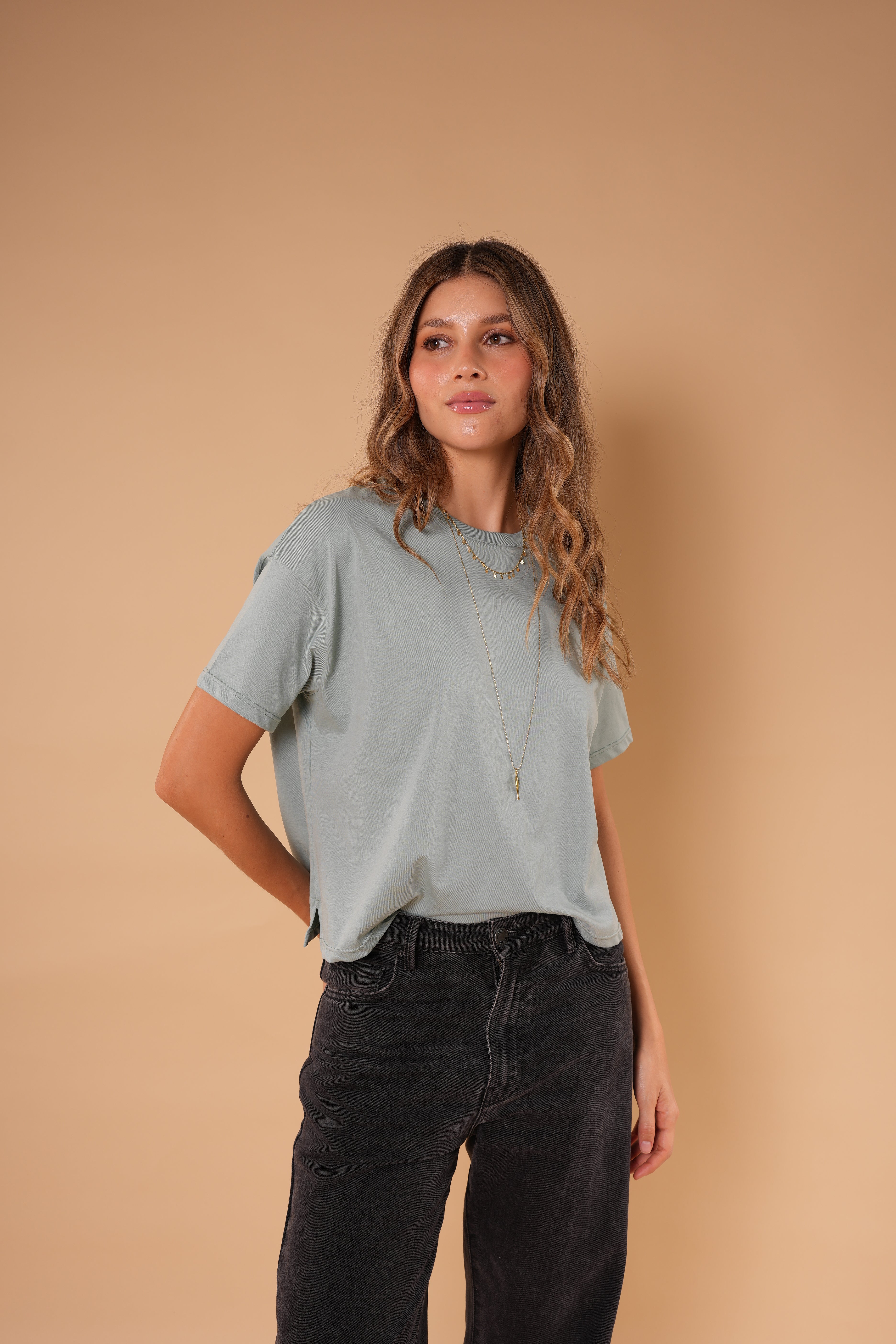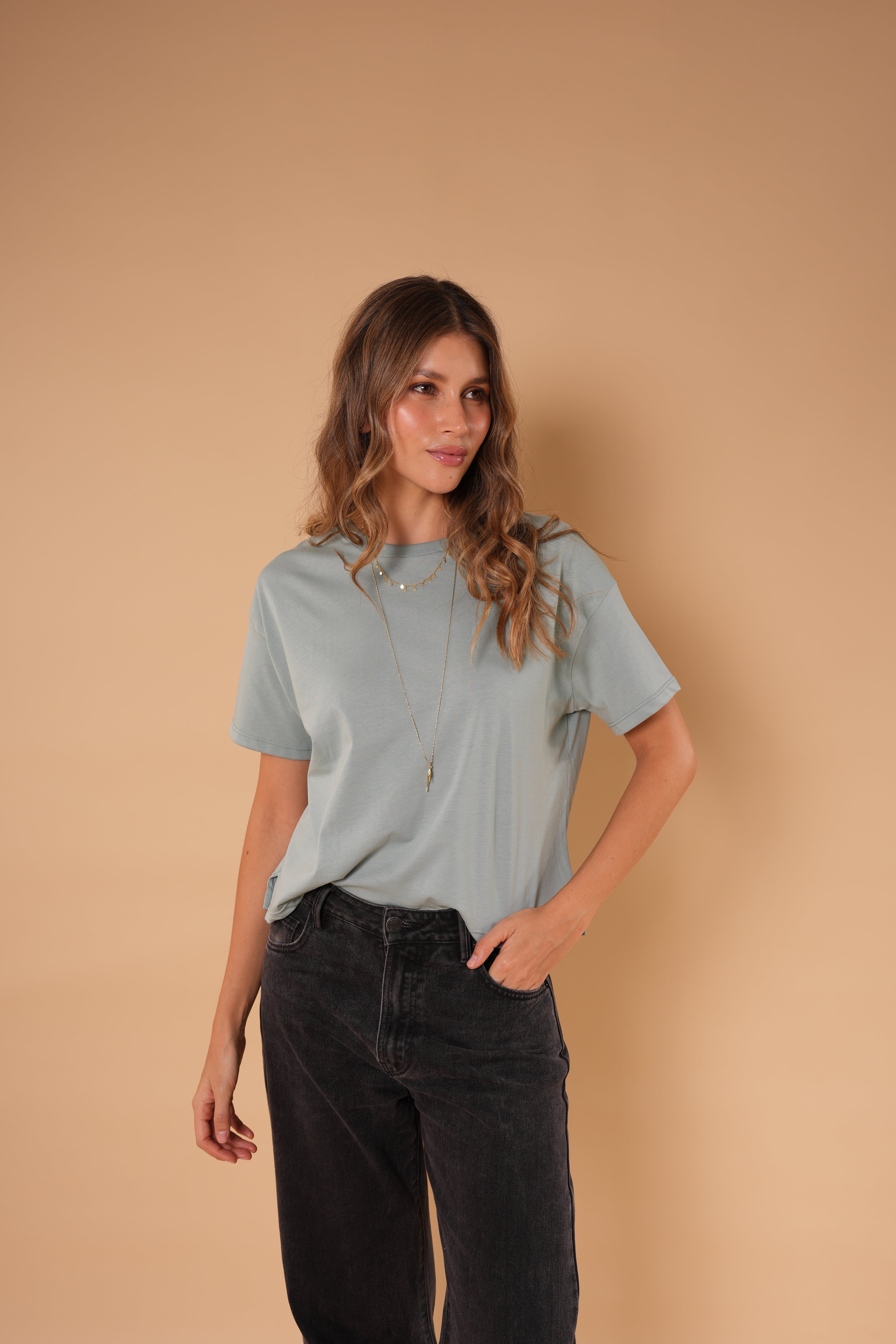 Camiseta verde menta básica de silueta relajada y manga corta, confeccionada en algodón Peruano para una sensación fresca y cómoda.