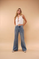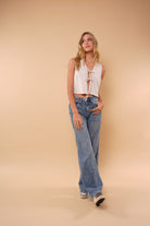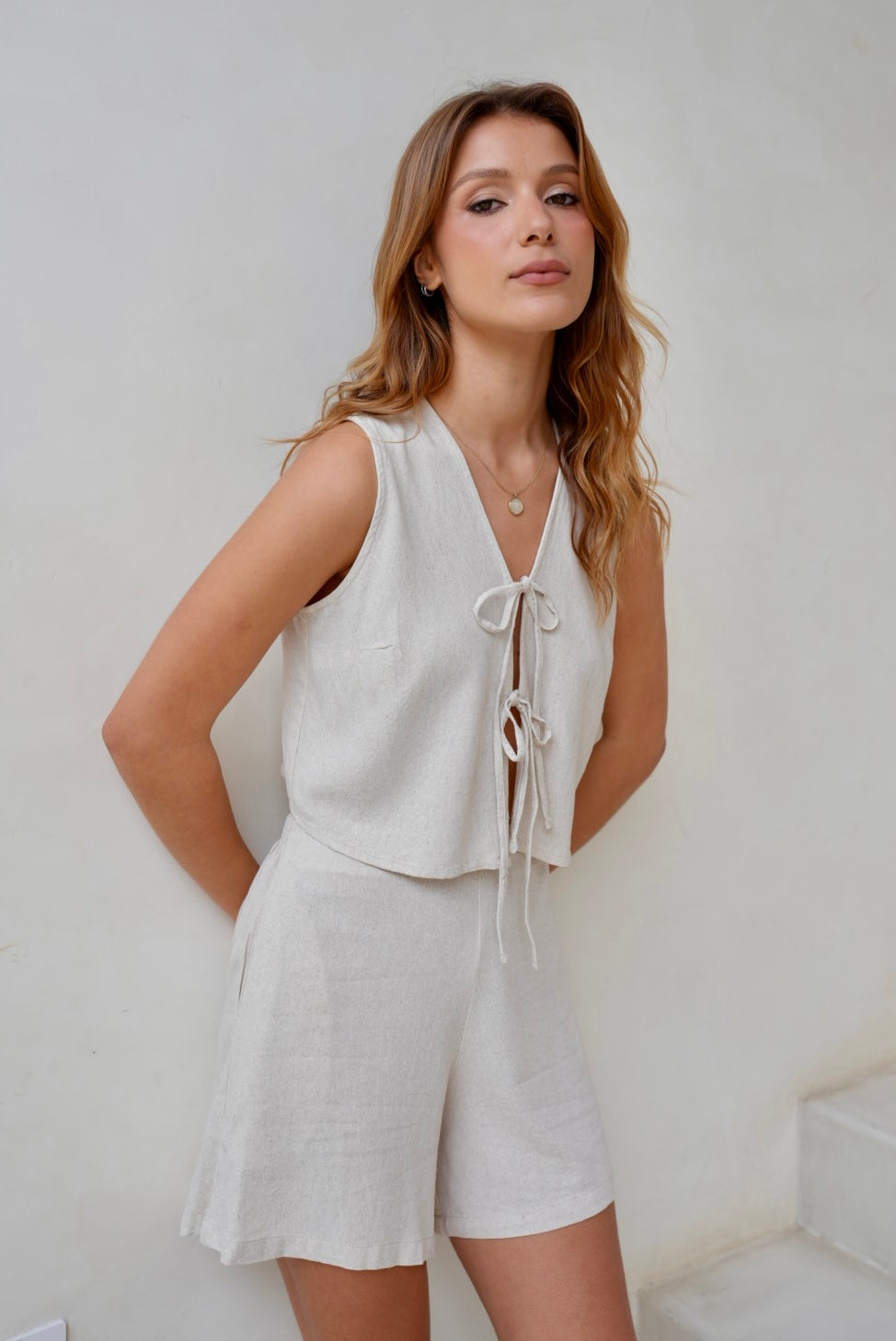 Chaleco arena manga sisa, con escote en V, en tela rayón, ajustable al frente con dos delicados lazos del mismo tejido.