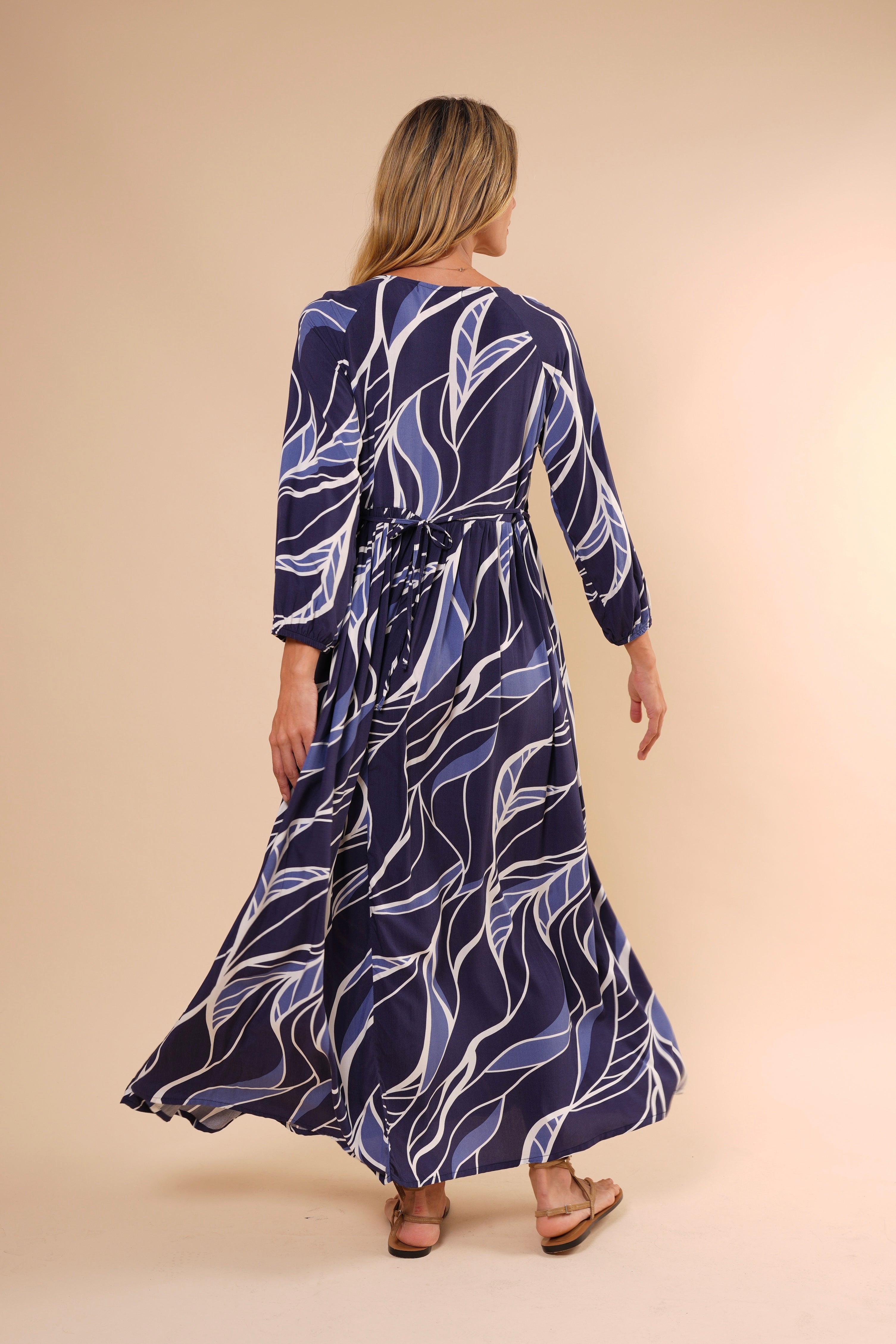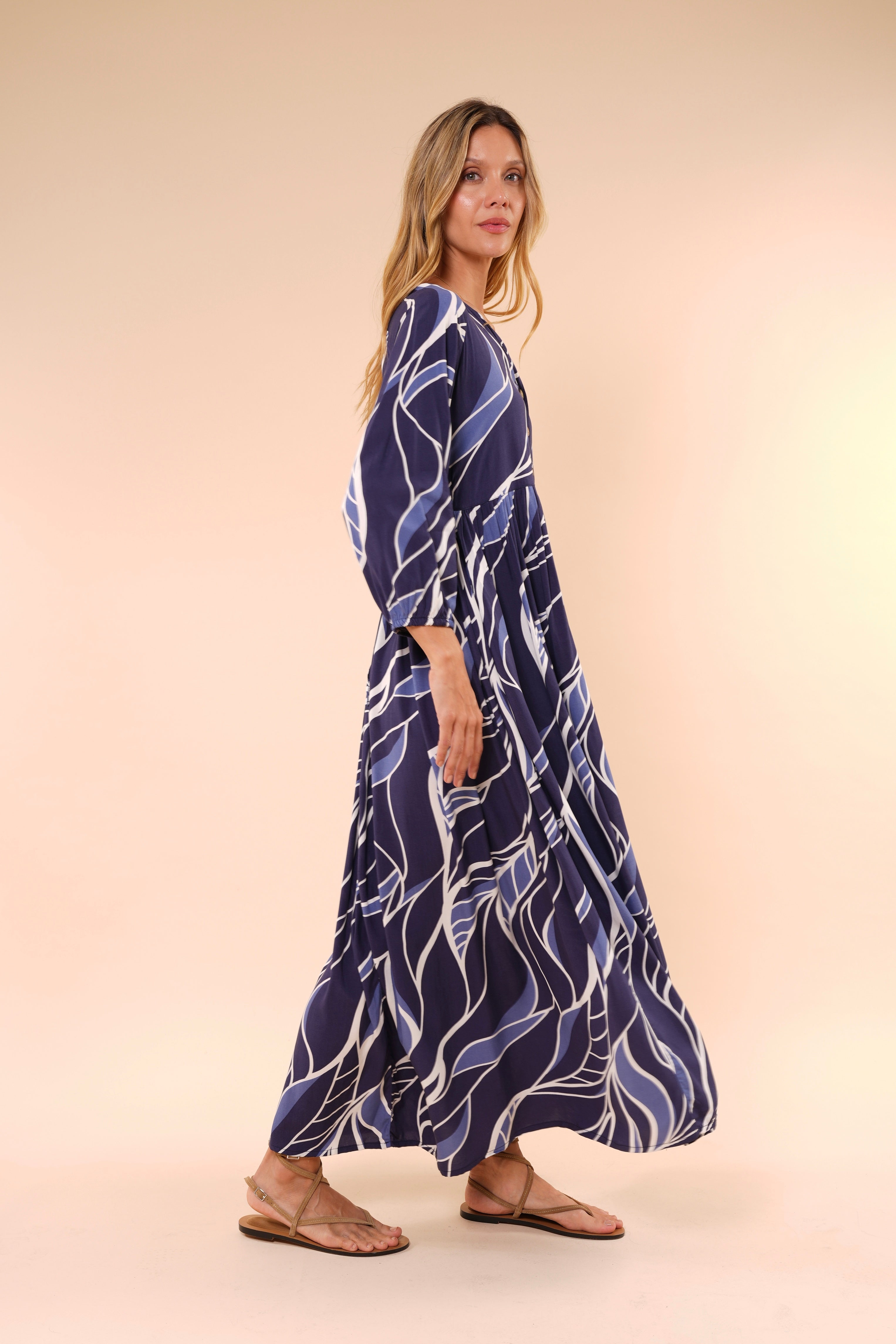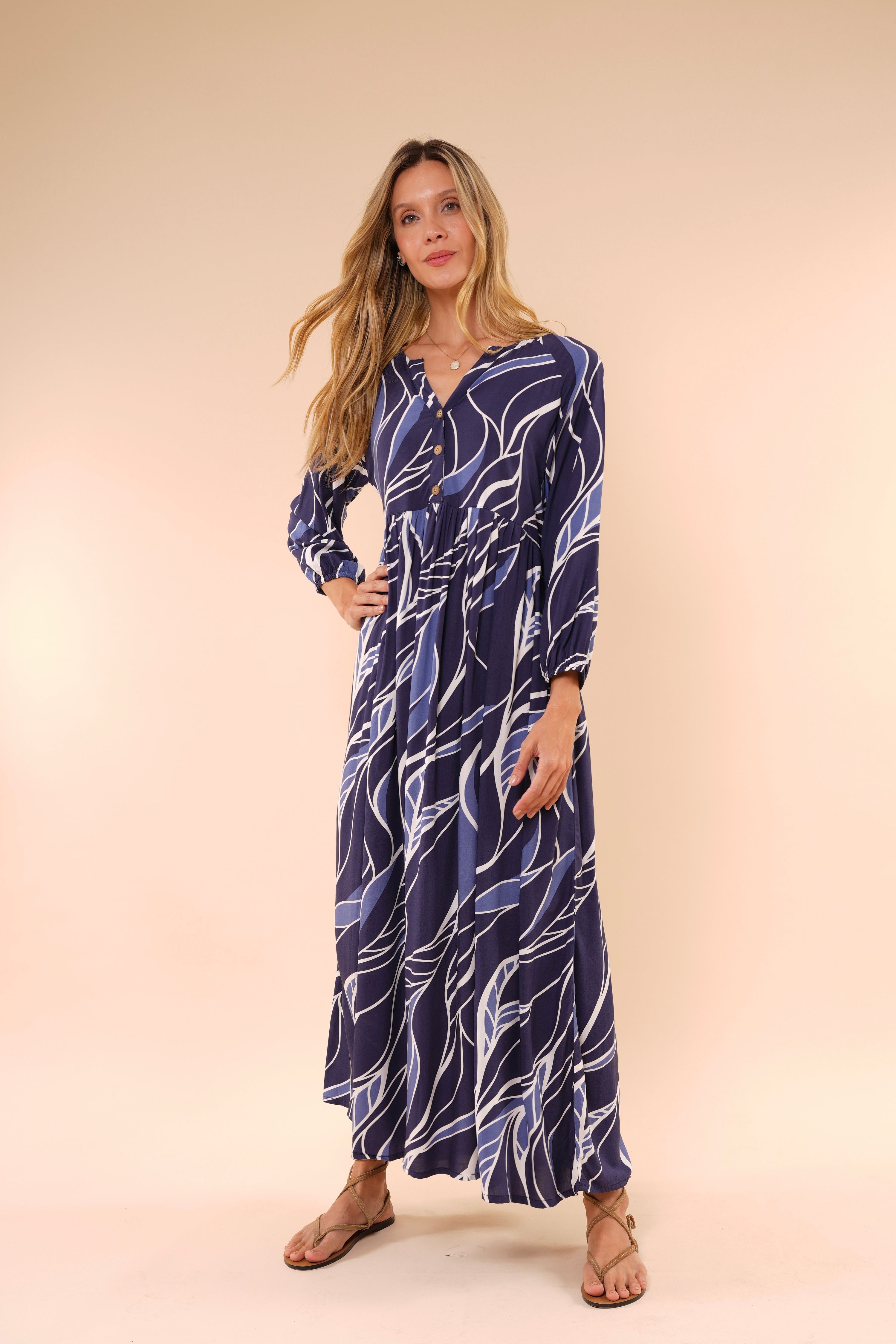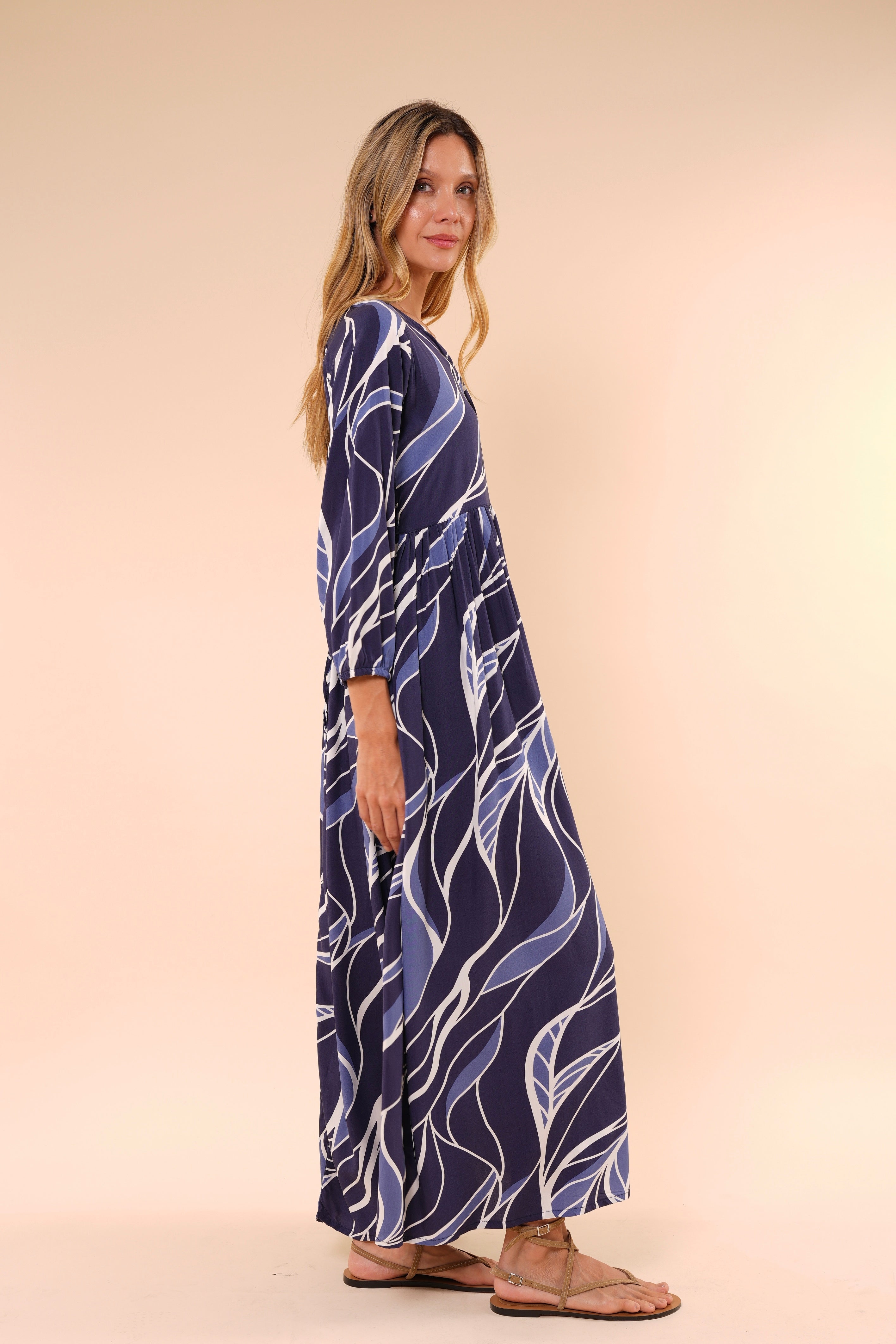 Un vestido que fluye contigo. Este diseño maxi en tono azul profundo con estampado orgánico en contraste es una pieza protagonista que combina elegancia y comodidad en perfecta armonía.