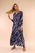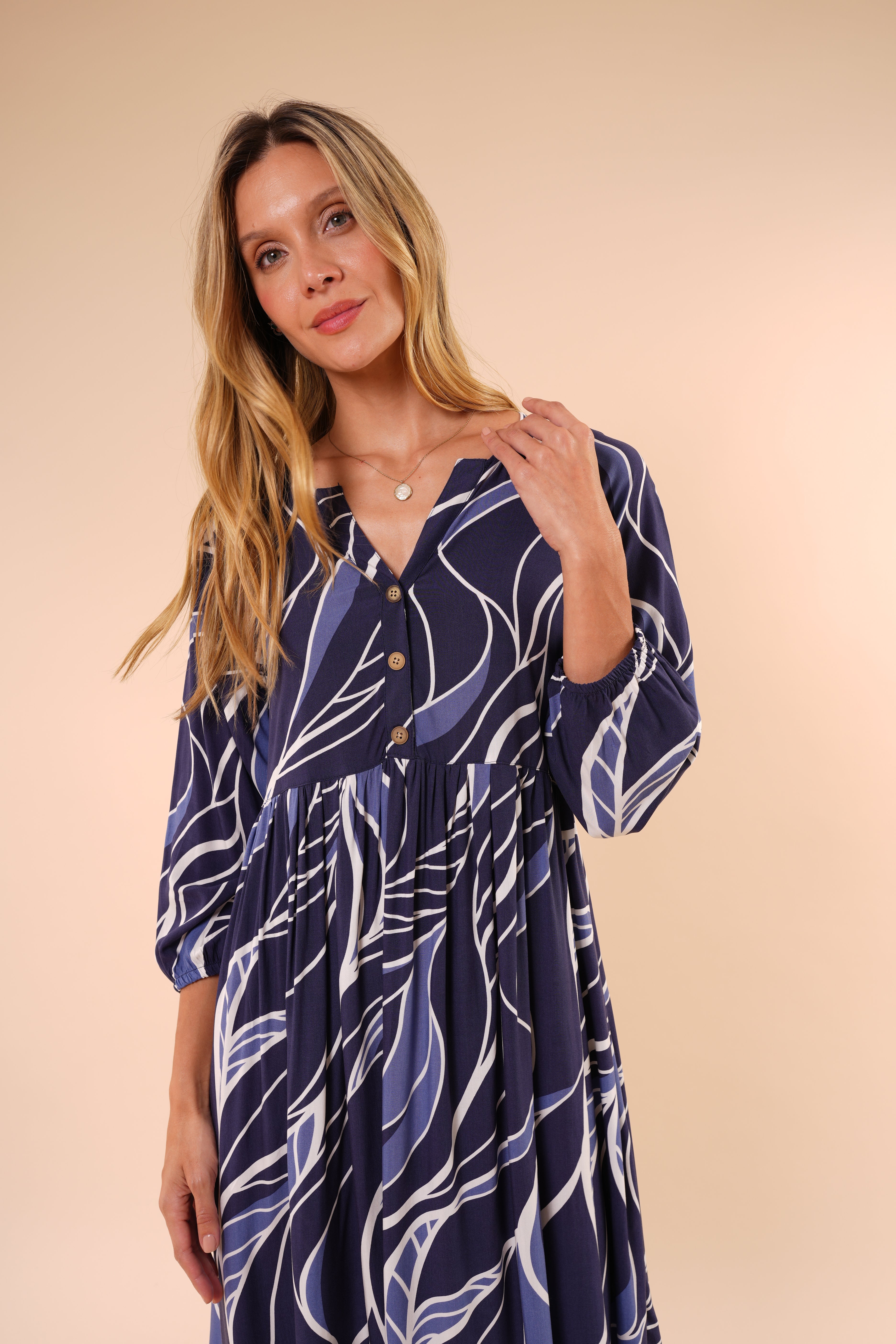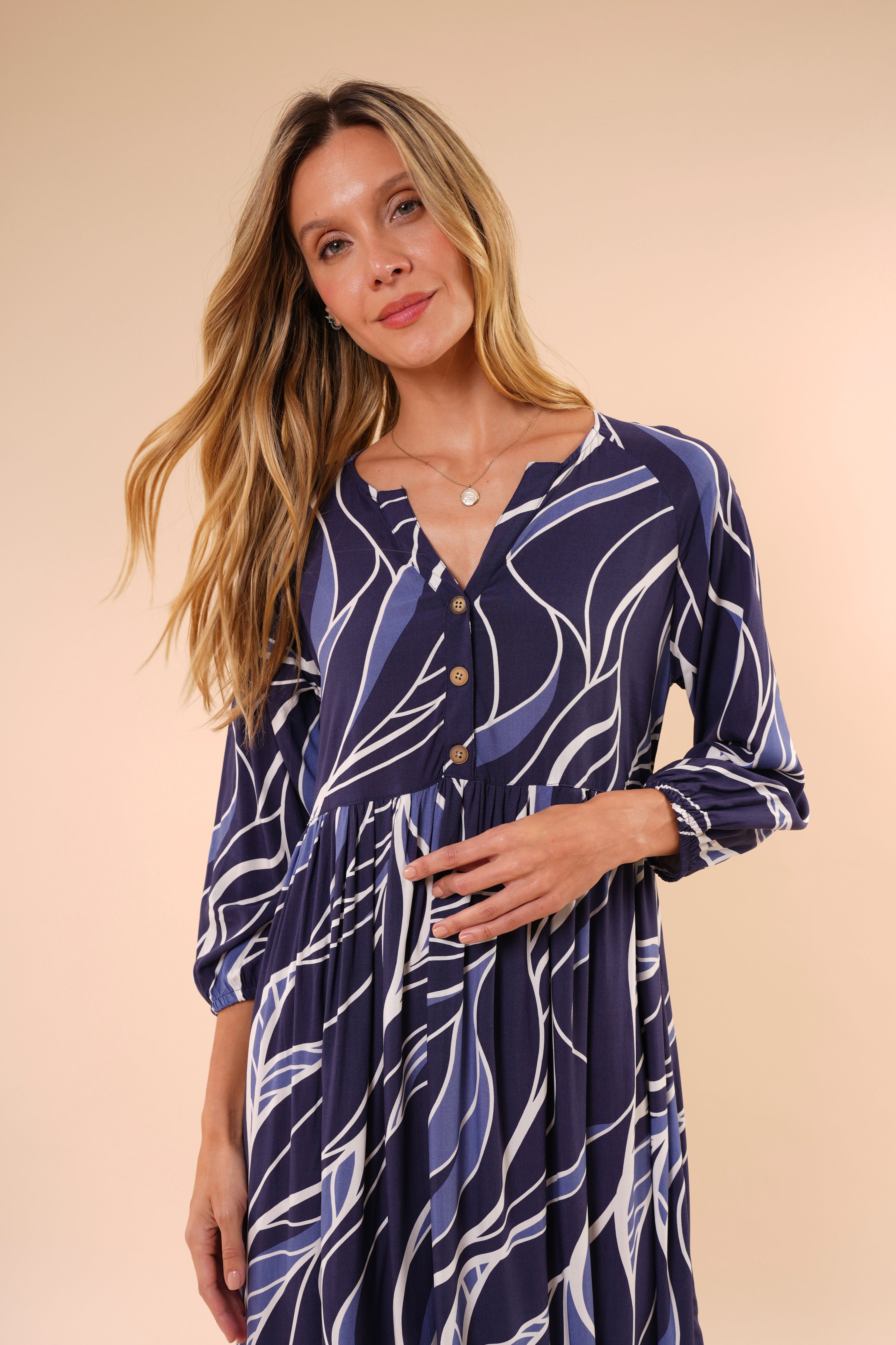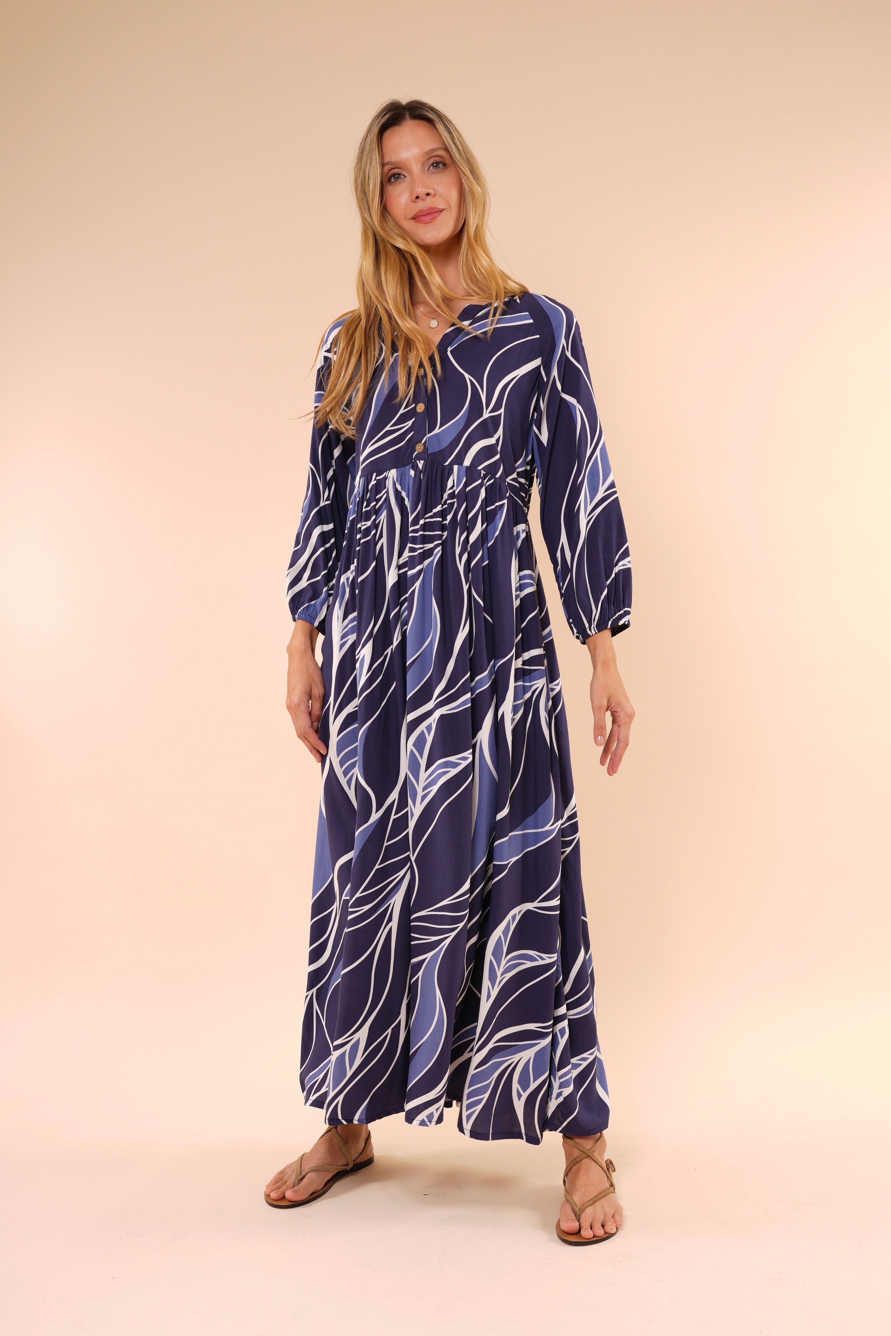 Un vestido que fluye contigo. Este diseño maxi en tono azul profundo con estampado orgánico en contraste es una pieza protagonista que combina elegancia y comodidad en perfecta armonía.