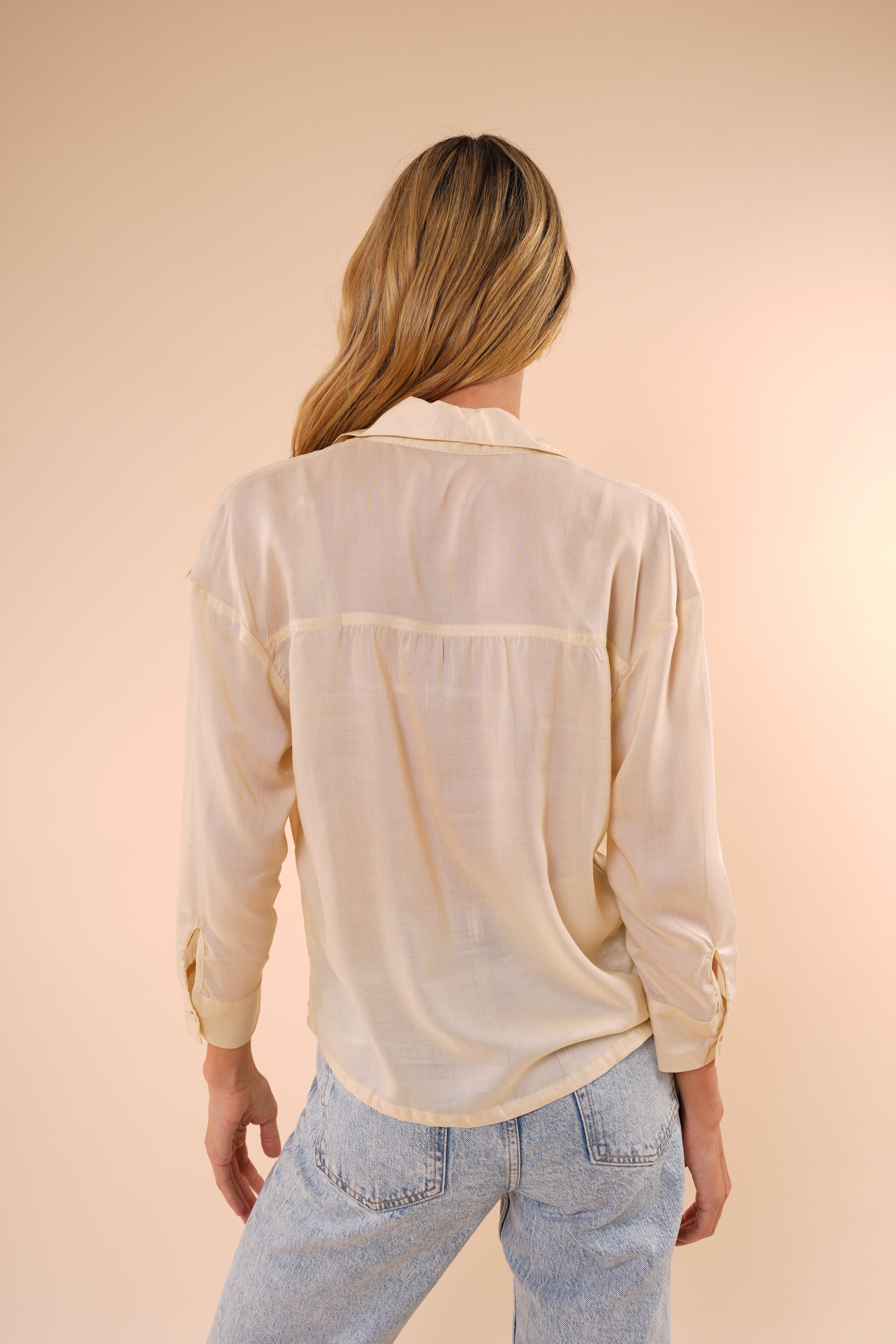 Una blusa ligera y versátil, pensada para acompañarte en el día a día con un aire relajado y femenino. Su silueta fluida cae suavemente sobre el cuerpo, mientras el escote en V con botones aporta un toque sutilmente sofisticado. Los bolsillos frontales equilibran el diseño y le dan un look casual y moderno.