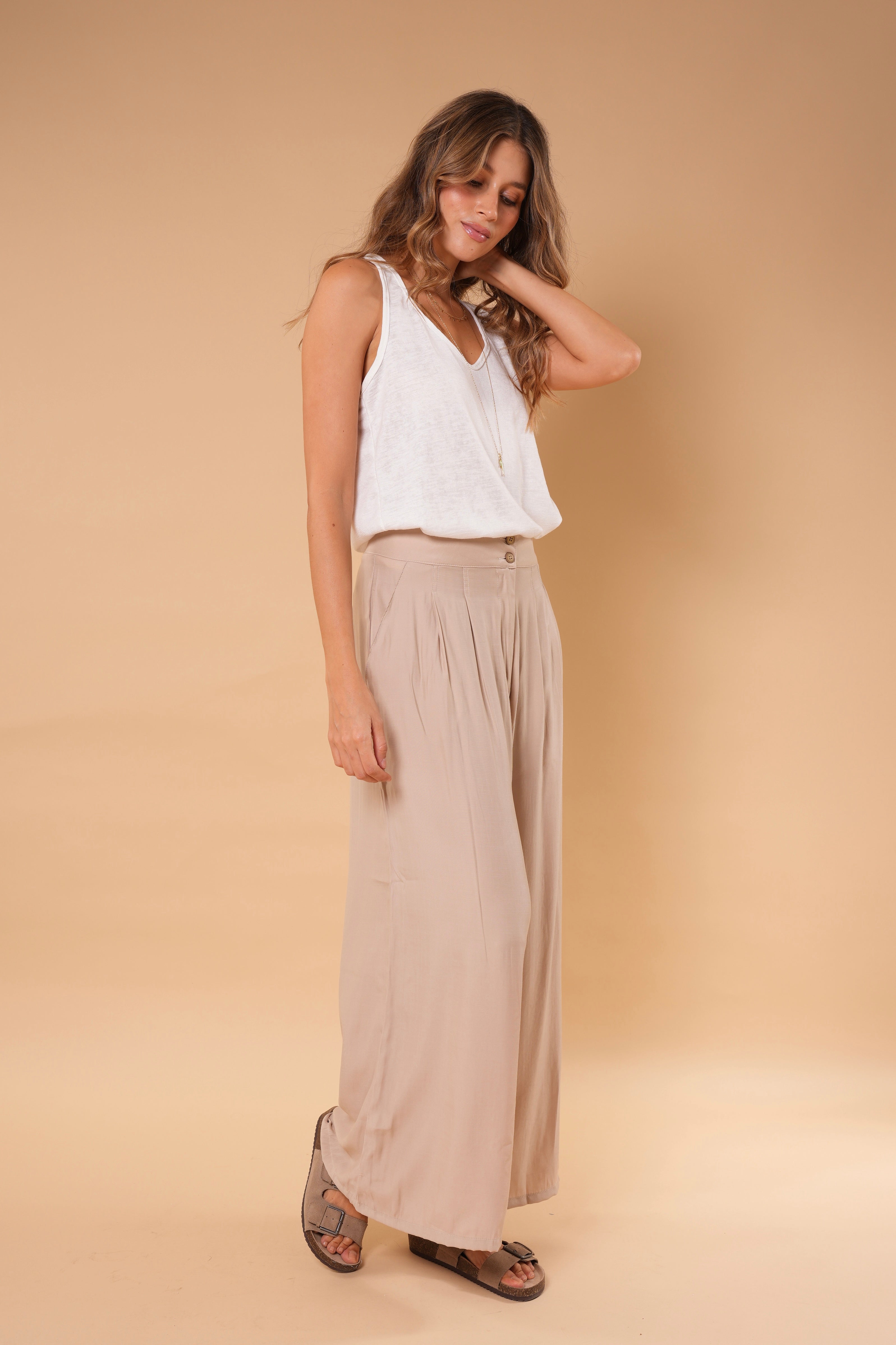 Su silueta tipo palazzo aporta comodidad absoluta sin perder elegancia, ideal para días de calor, viajes y looks relajados pero cuidados