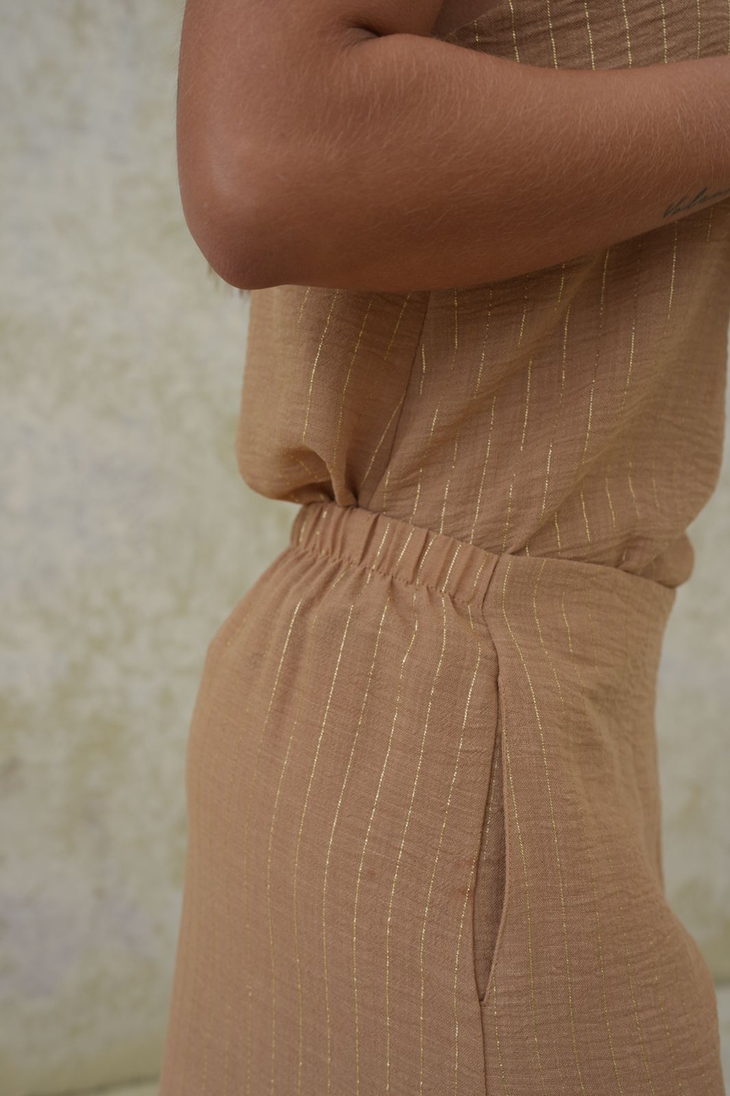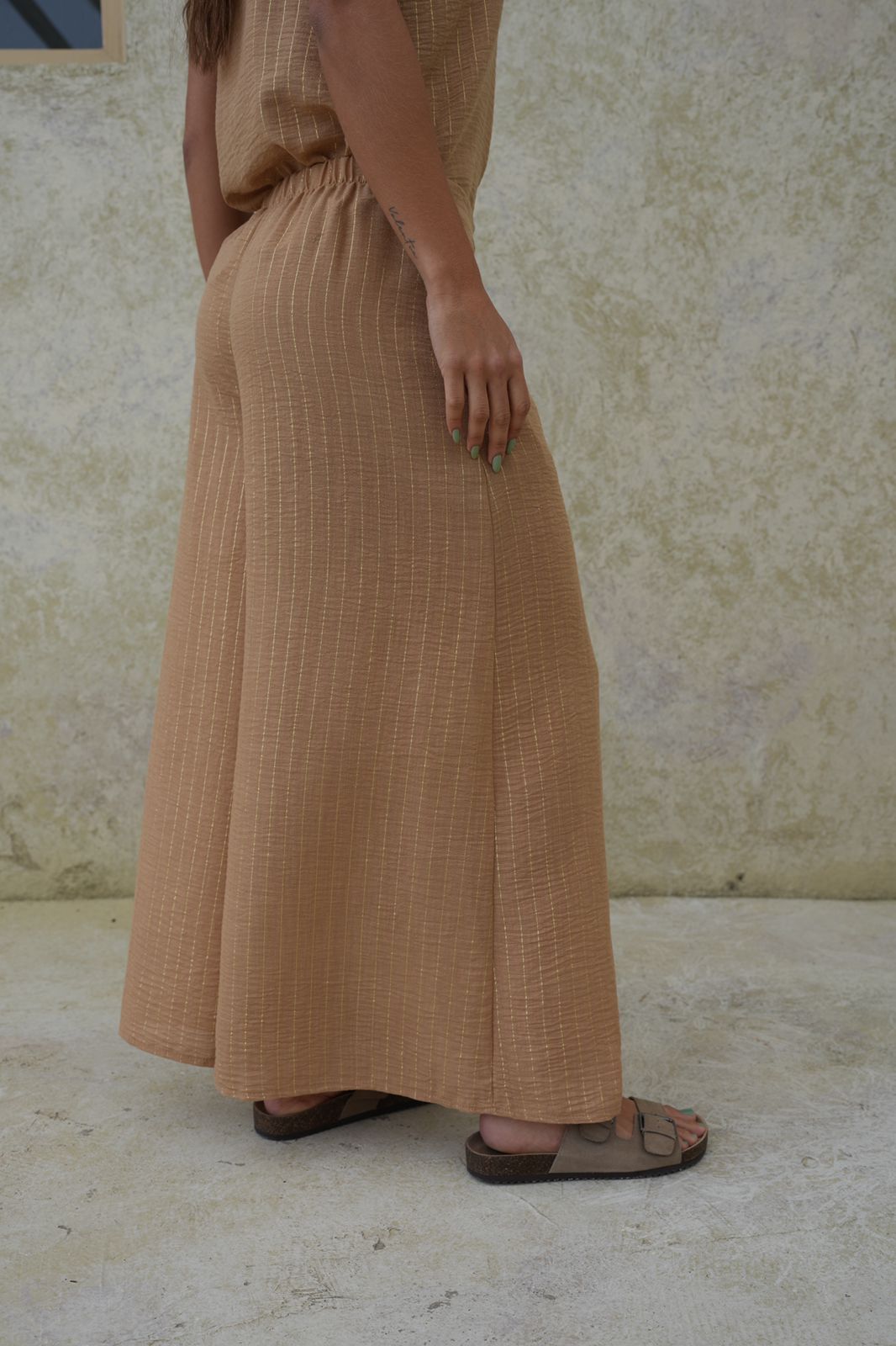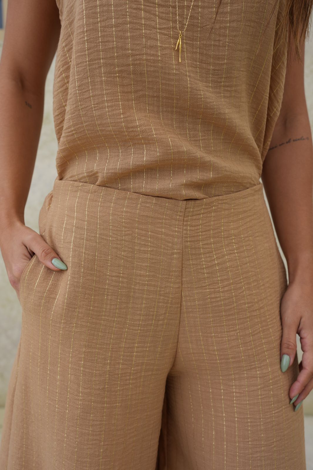 Pantalón taupe con líneas doradas, de pierna ancha, tiro alto, elástico y bolsillos, en tela rayón ligera y fluida aporta movimiento y comodidad. Úsalo en conjunto con la blusa Elsa Taupe ó chaleco Milanta Taupe
